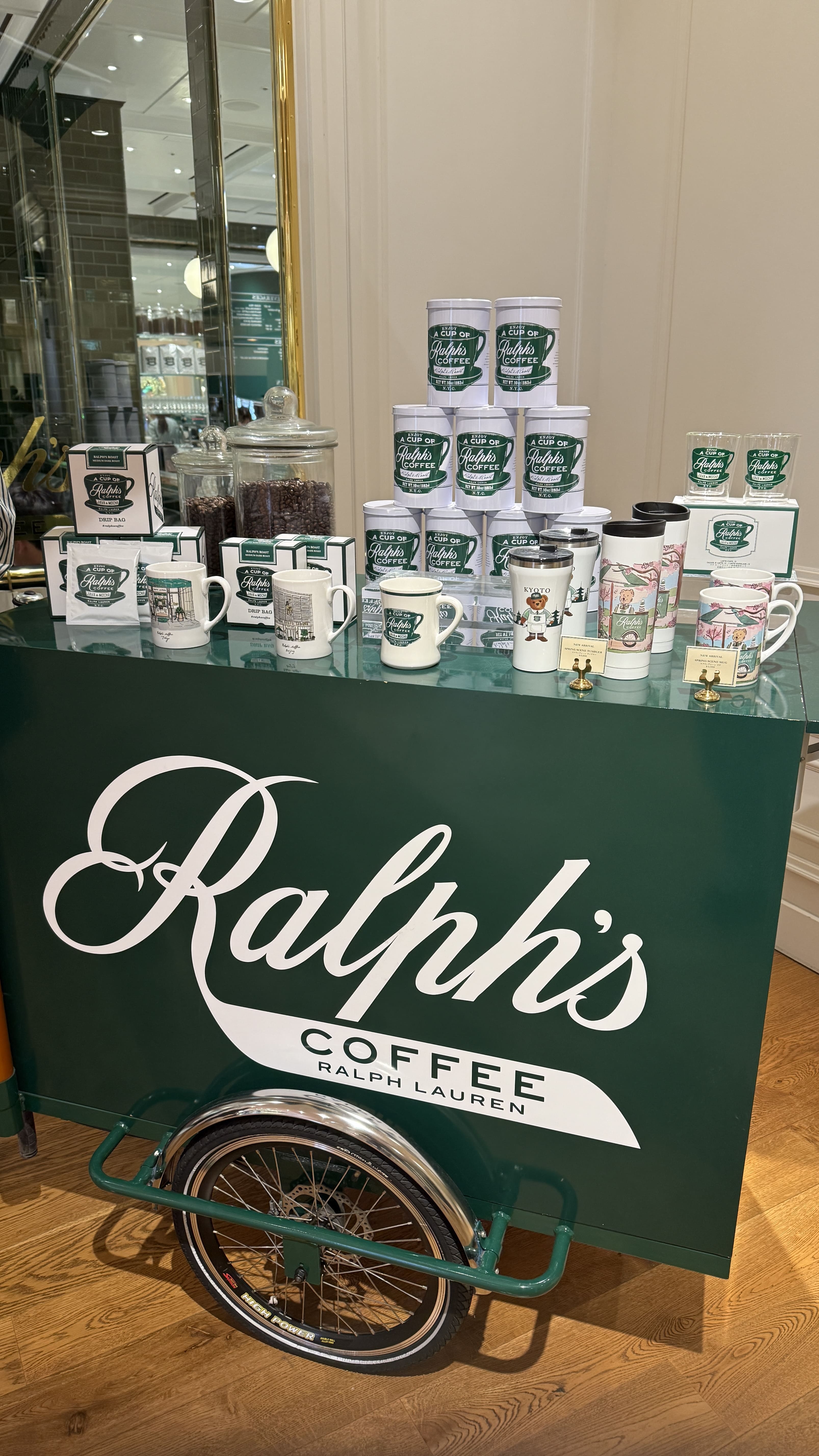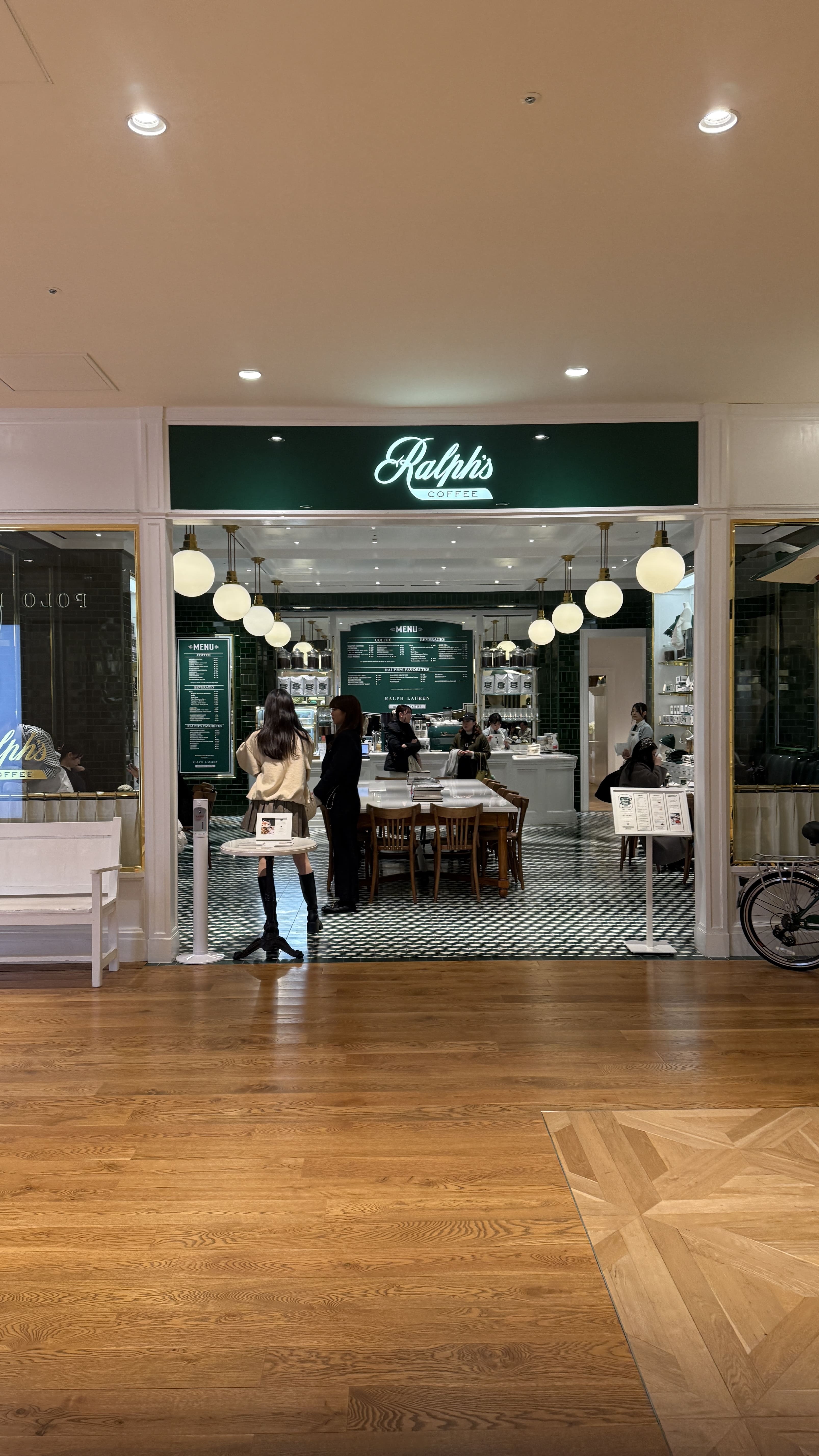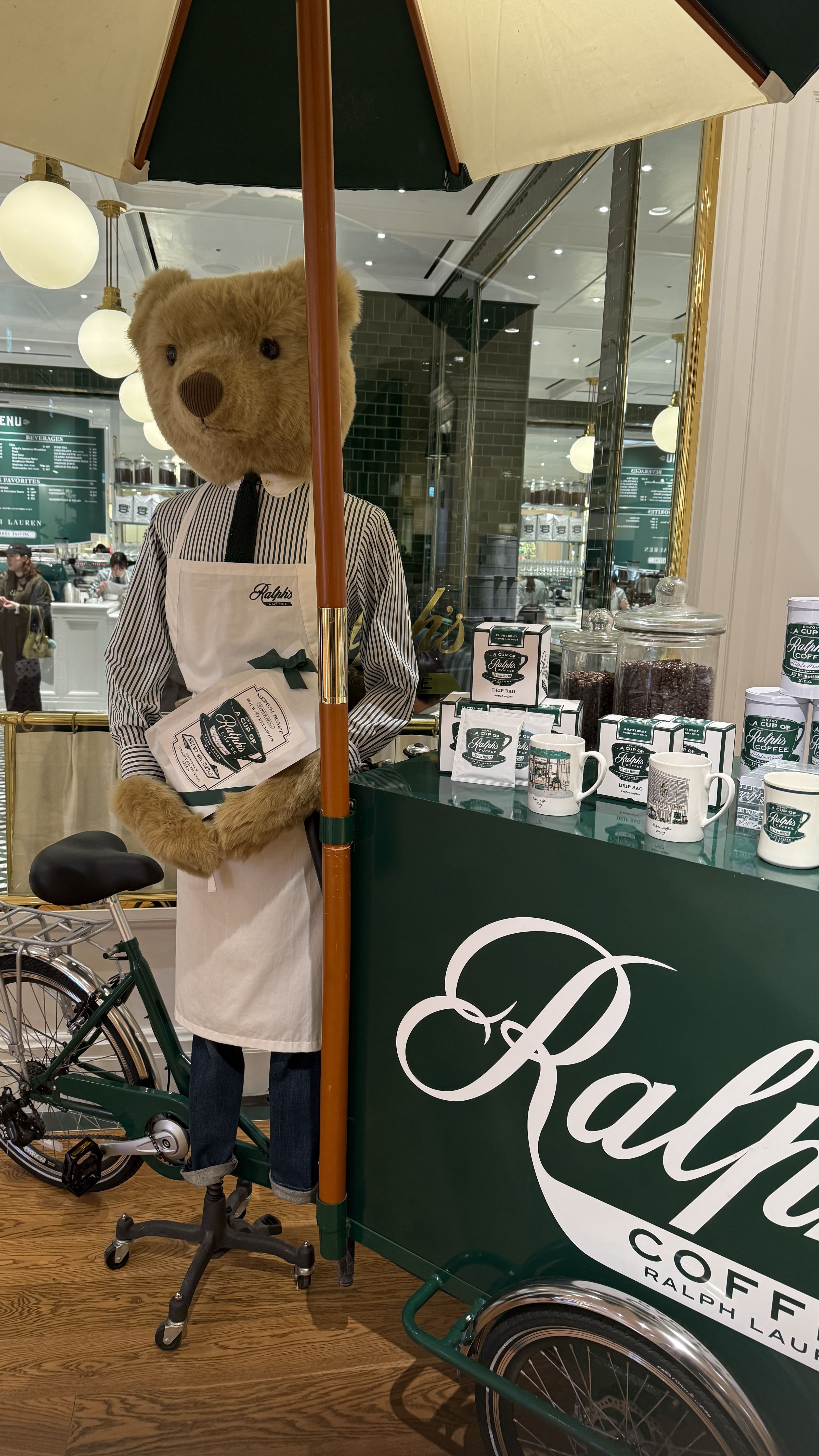 제가 방문했을 당시에는 Ralph Lauren의 Ralph’s Coffee가 2층에 운영 중이었는데, 그린&화이트 톤의 인테리어가 굉장히 고급스러우면서도 따뜻한 분위기였어요. 커피 한 잔 하며 쇼핑 중간 쉬어가기에도 좋았고, 외부 자전거 카트에 귀여운 곰 인형이 서 있었는데 포토존처럼 사진 찍는 사람들도 많았습니다. 한 번은 꼭 가보고 싶었는데, 뉴발란스 가는 길에 발견했습니다.