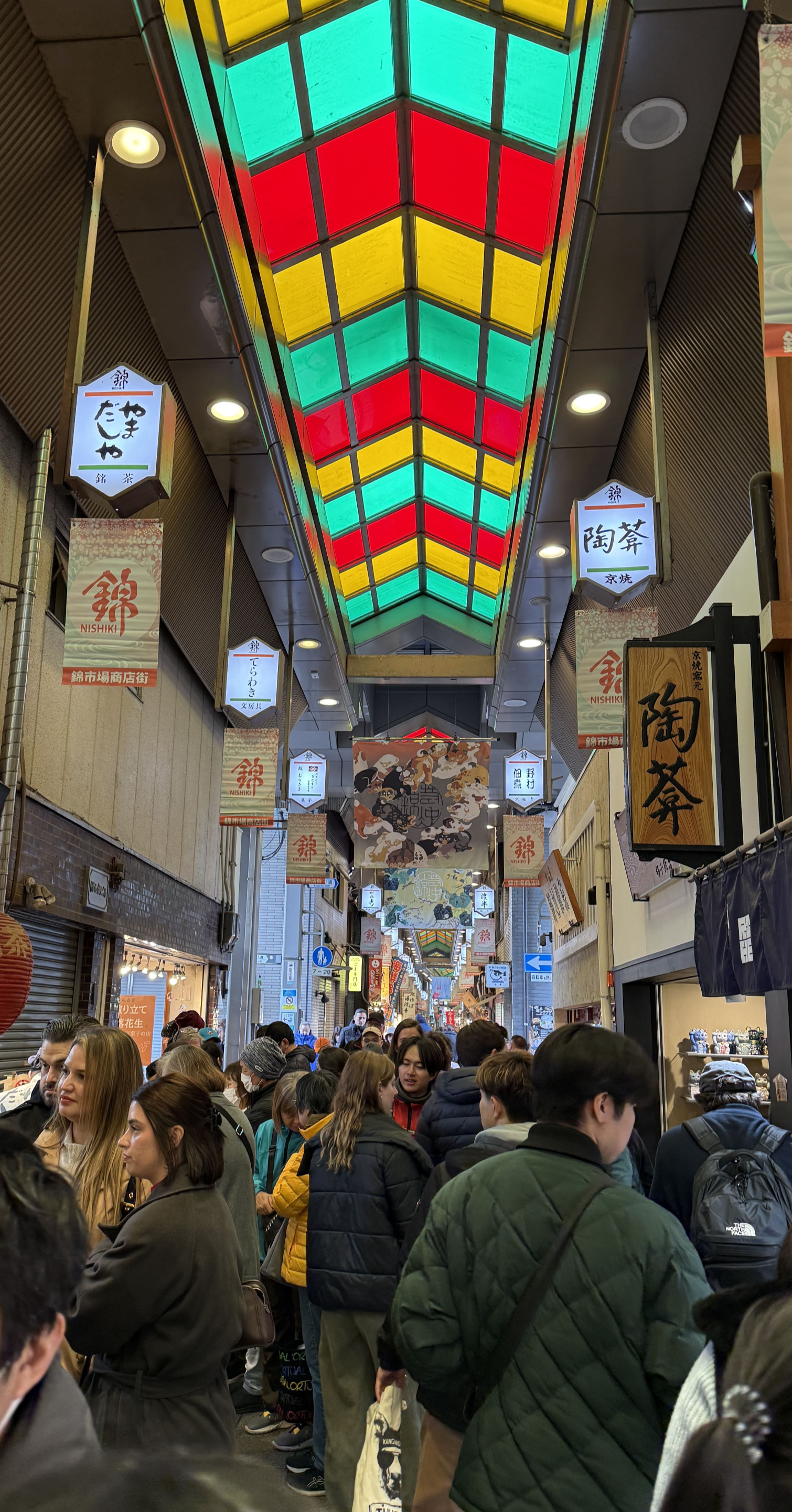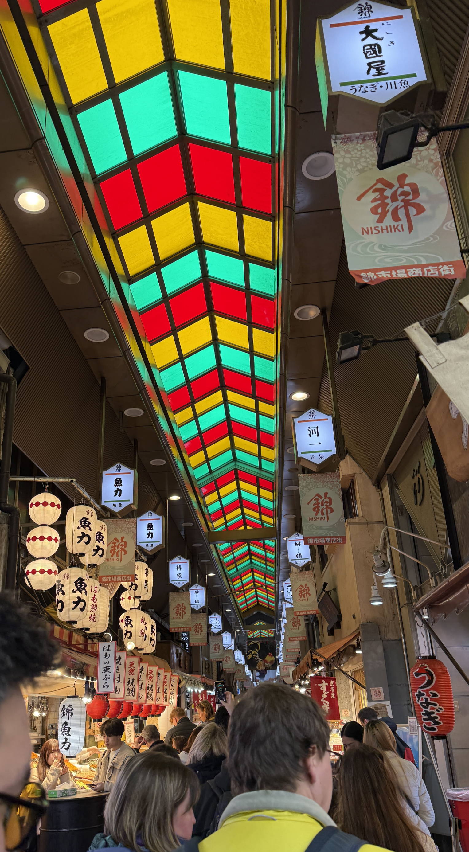 ‘교토의 부엌’으로 불리는 니시키 시장은 교토 여행 중 꼭 들러야 할 대표적인 전통시장입니다. 저희도 구경 겸 가보았습니다. 이곳은 단순한 식재료 시장이 아닌, 다양한 길거리 음식과 디저트, 지역 특산물을 맛볼 수 있는 핫플레이스였습니다. 제가 방문했을 때는 평일 오후이었는데도 관광객과 현지인들로 가득 찼습니다.