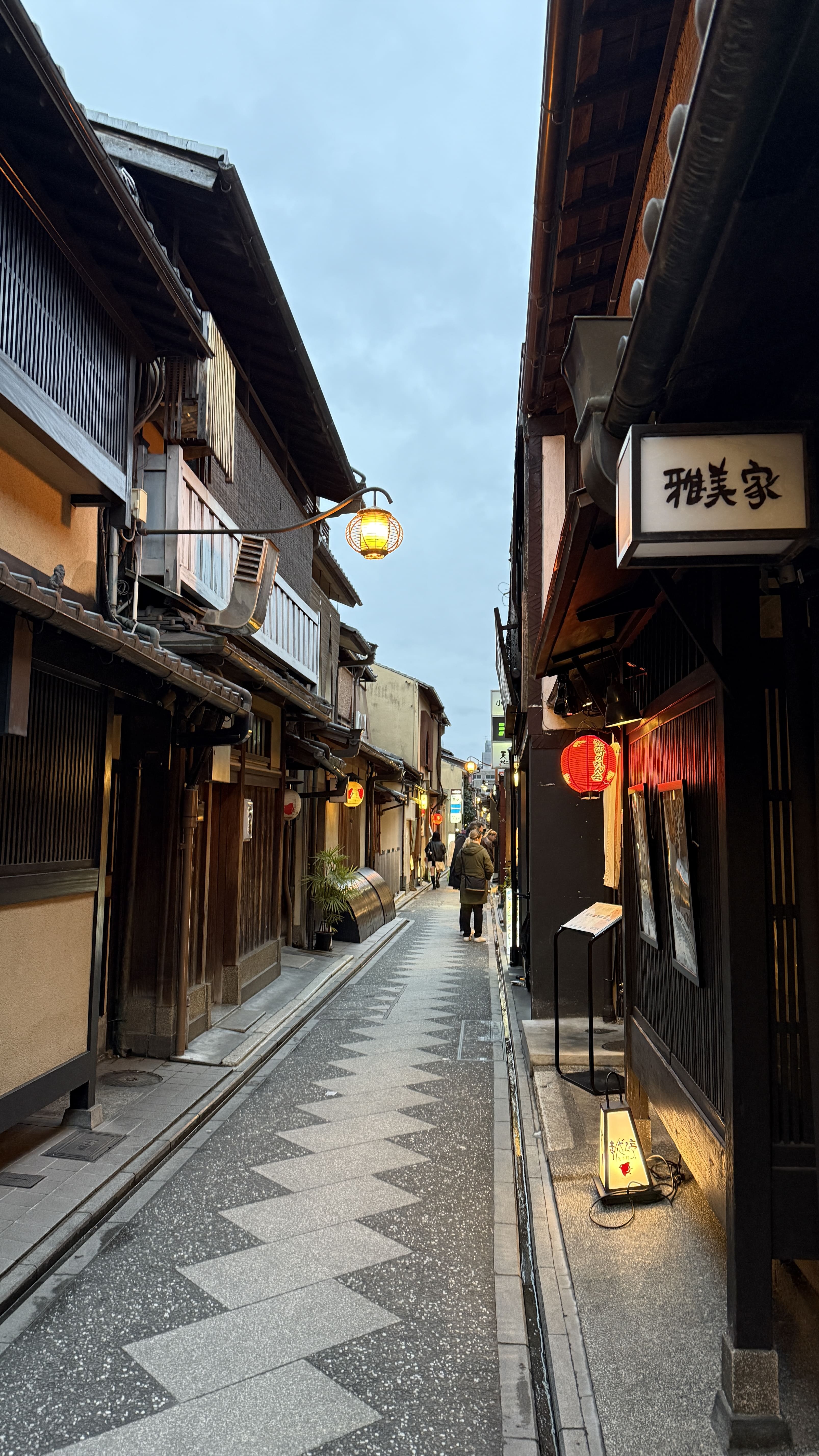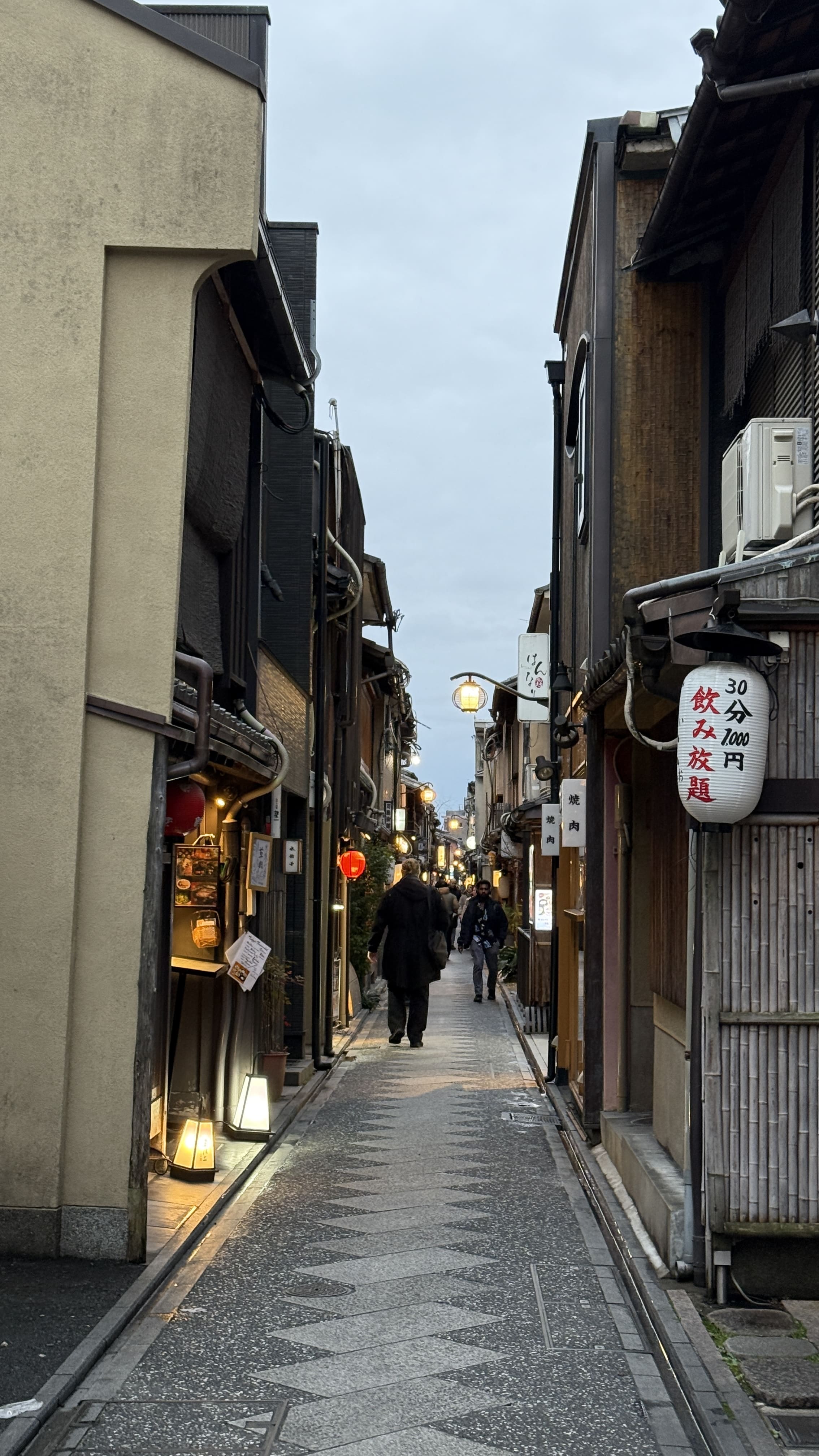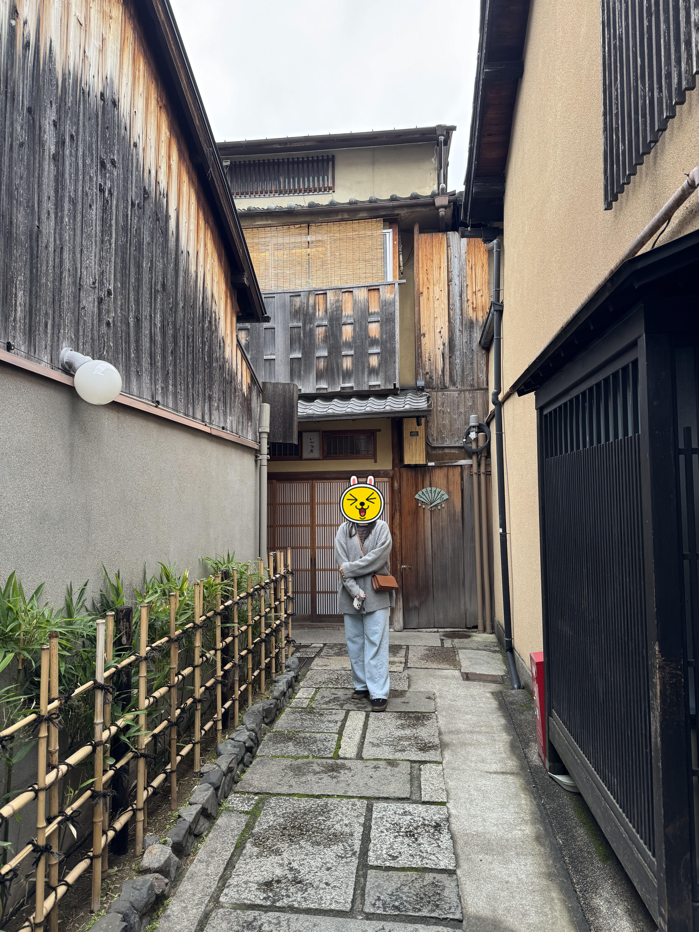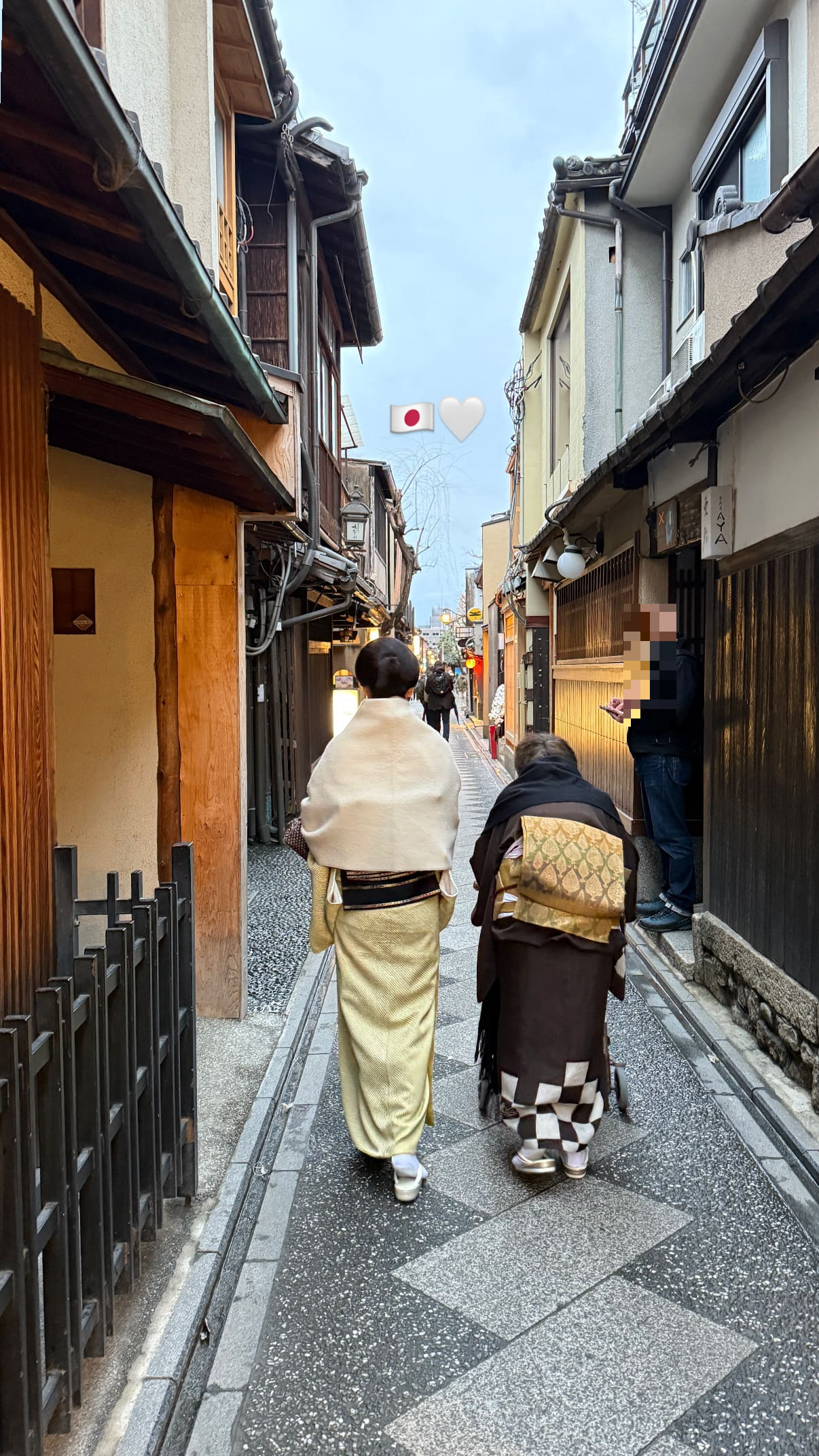 기온은 교토를 대표하는 전통 거리이자, 헤이안 시대부터 이어져 온 일본 전통문화의 중심지 라고 합니다. 본래 야사카 신사의 문전 거리로 형성된 이 지역은, 오랜 세월 동안 신사 참배객과 상인들, 예술가들로 붐비며 자연스럽게 도시 문화의 거점이 되었습니다. 특히 에도 시대 이후로는 마이코와 게이샤 문화가 자리 잡아, 지금도 운이 좋다면 전통 복장을 입은 마이코가 조용히 골목을 걷는 모습을 만날 수 있었습니다!