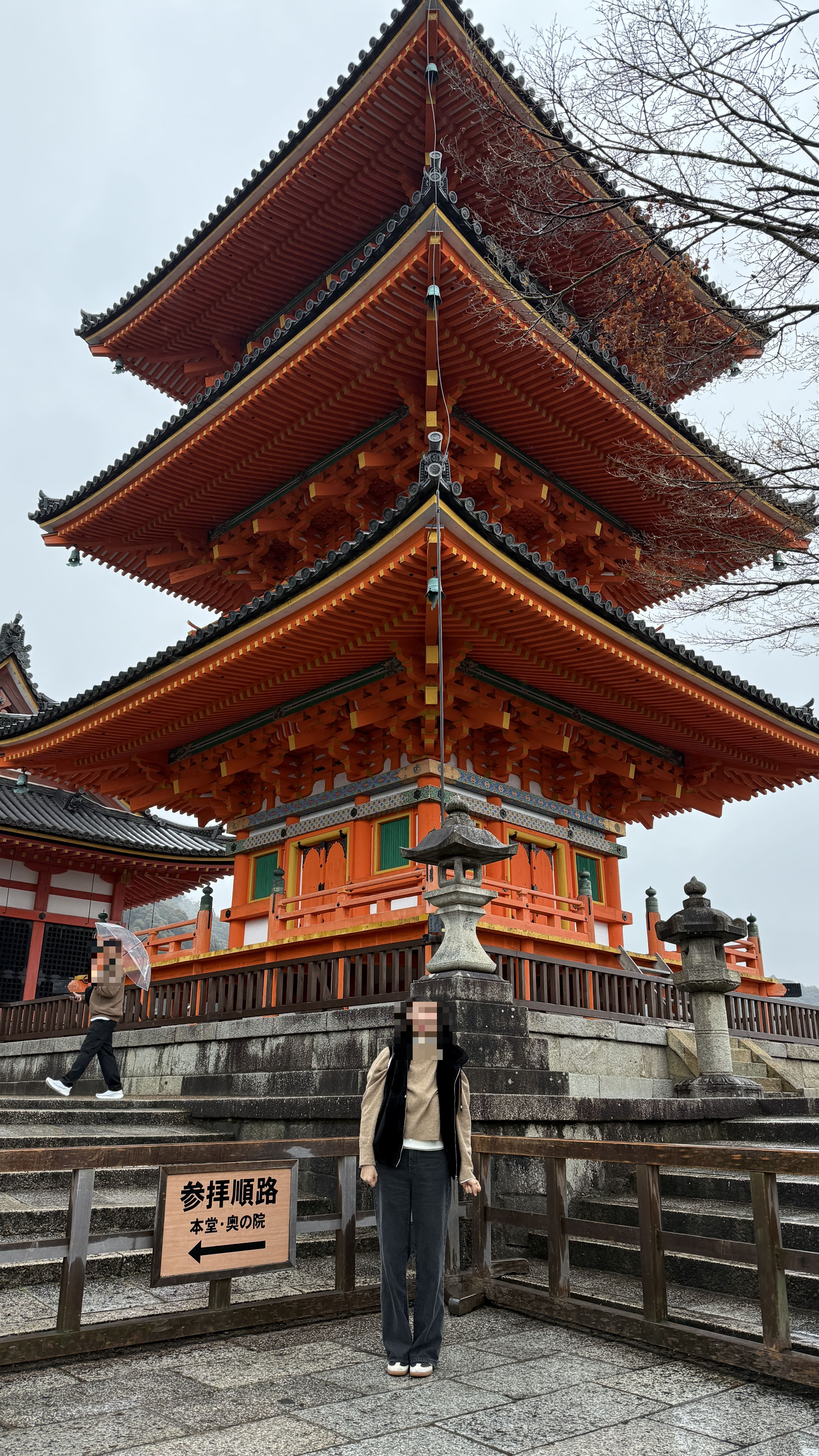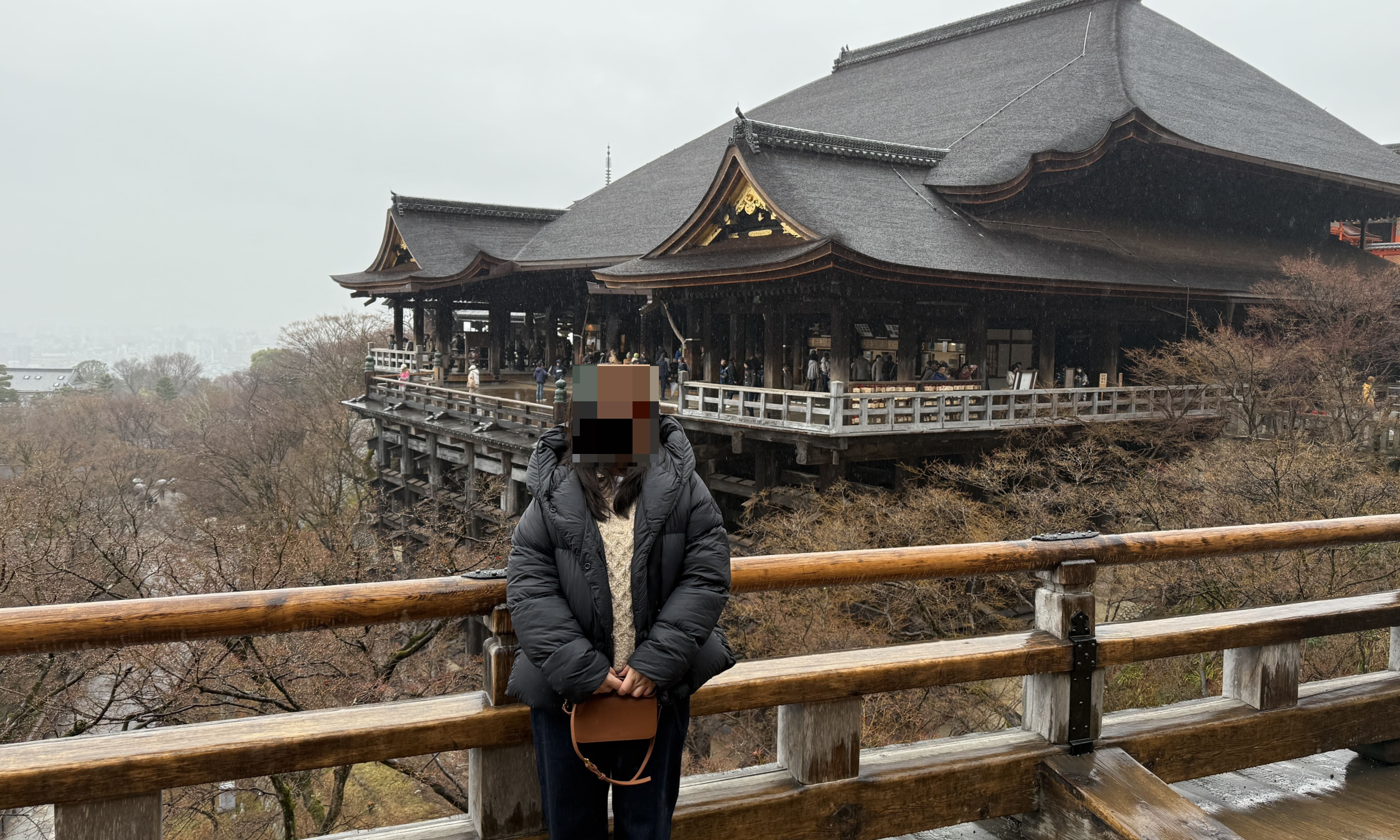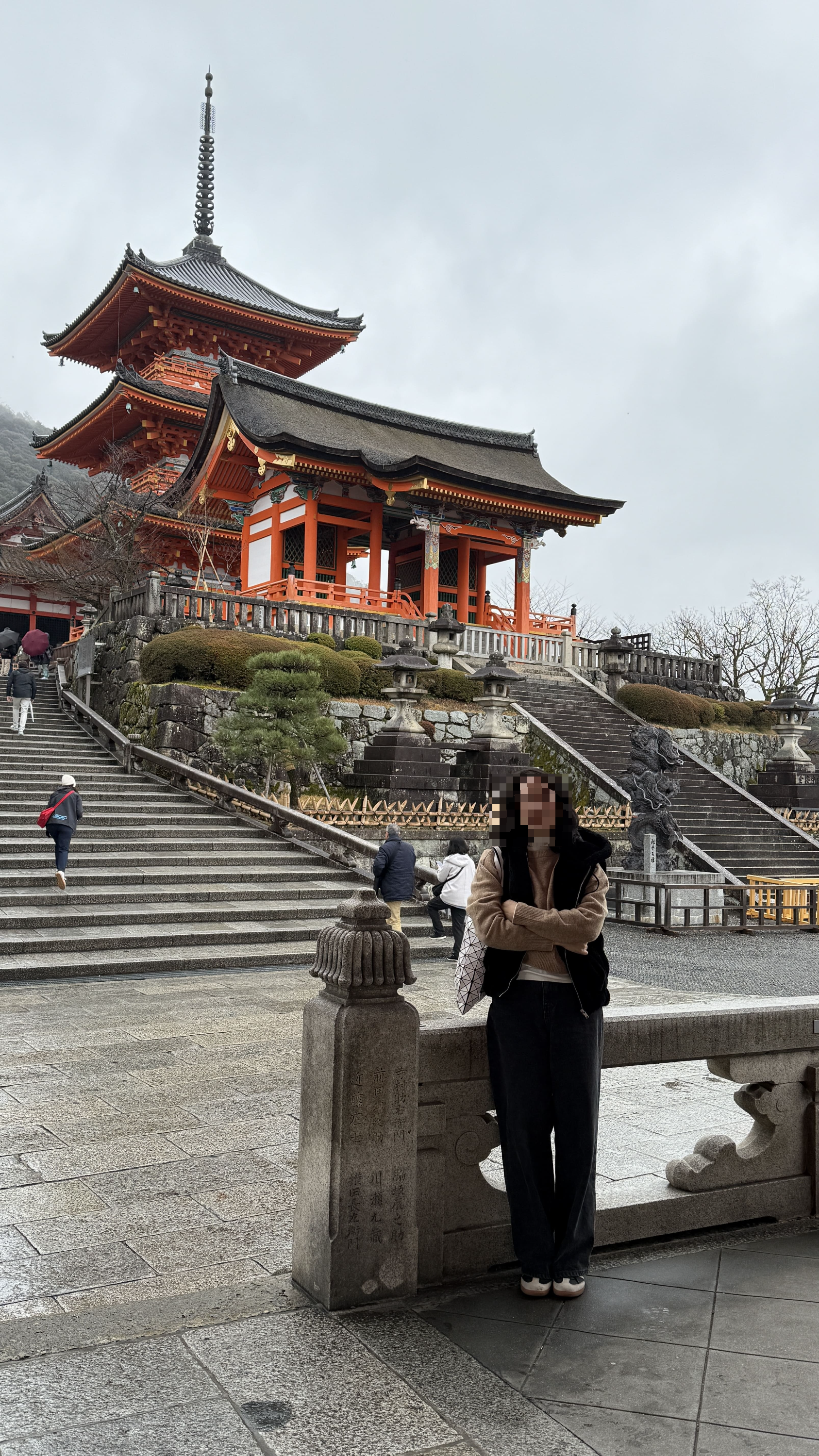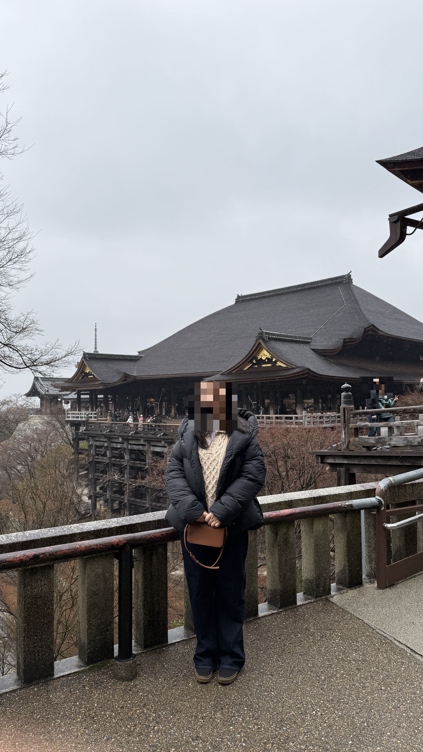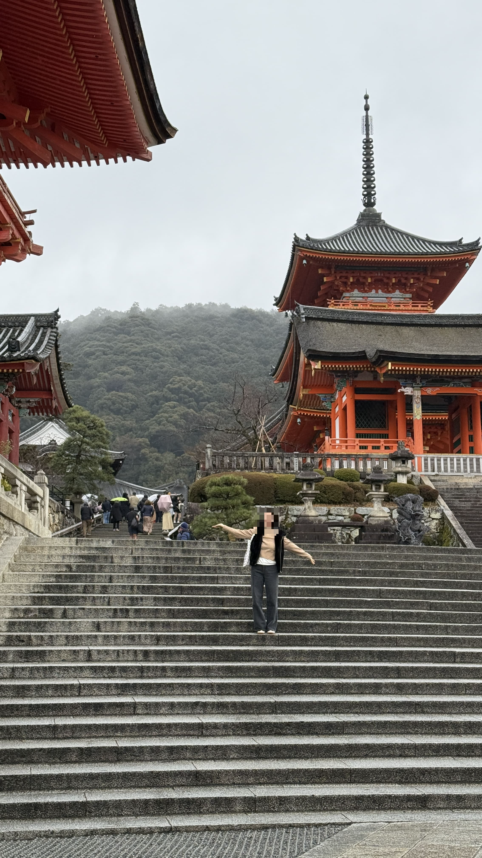 주요 포인트로는 ‘기요미즈 무대’, ‘오토와 폭포’, 그리고 다양한 부적을 파는 상점들이 있었습니다. 가장 인상 깊었던 건 역시 기요미즈 무대에서 바라보는 전망이었습니다. 사계절마다 분위기가 달라지는데, 제가 방문했을 땐 사찰 주변으로 벚꽃이 조금 피어 있어, 비가 와서 안개로 가득해서 풍경이 정말 아름다웠습니다.