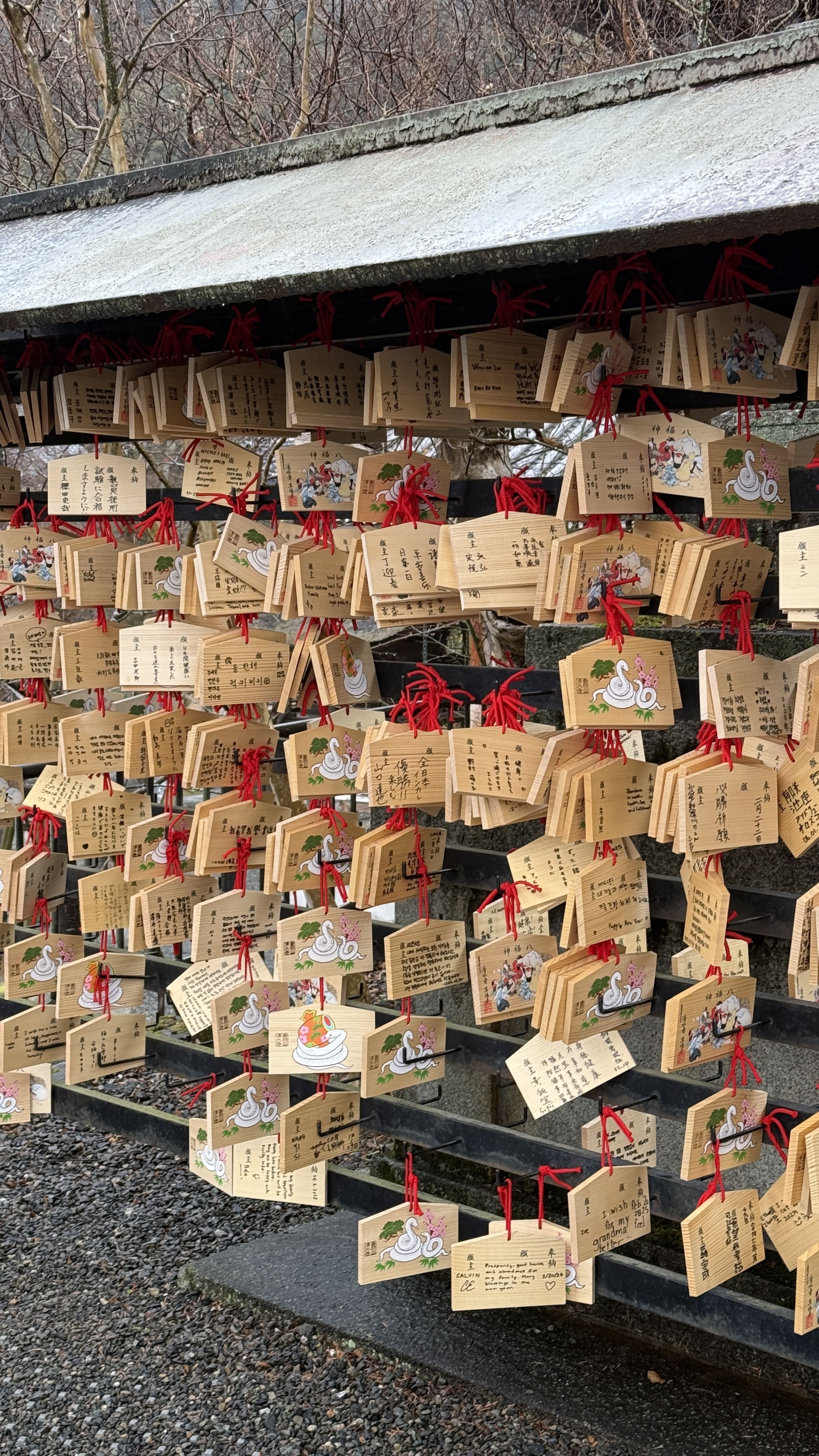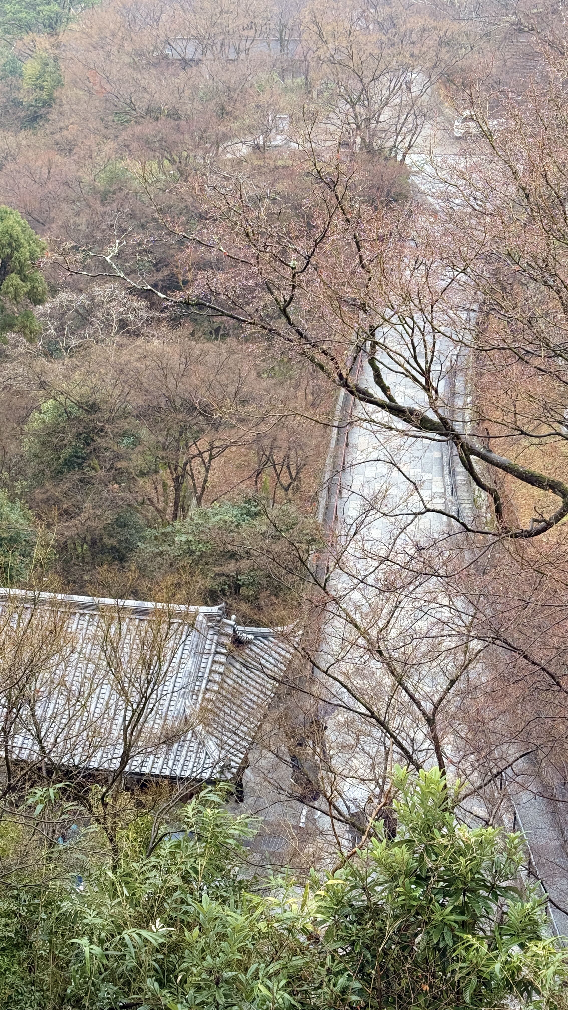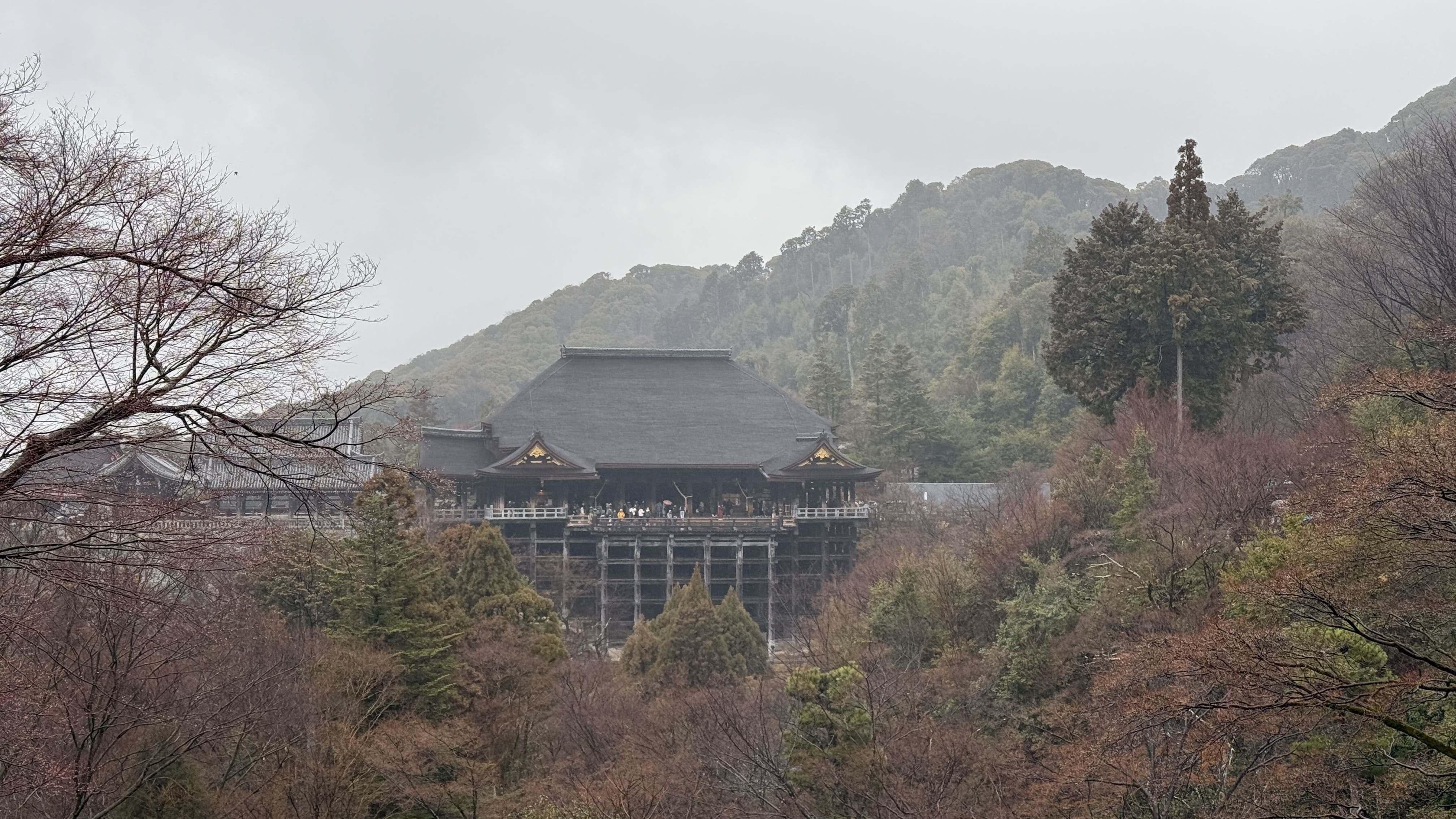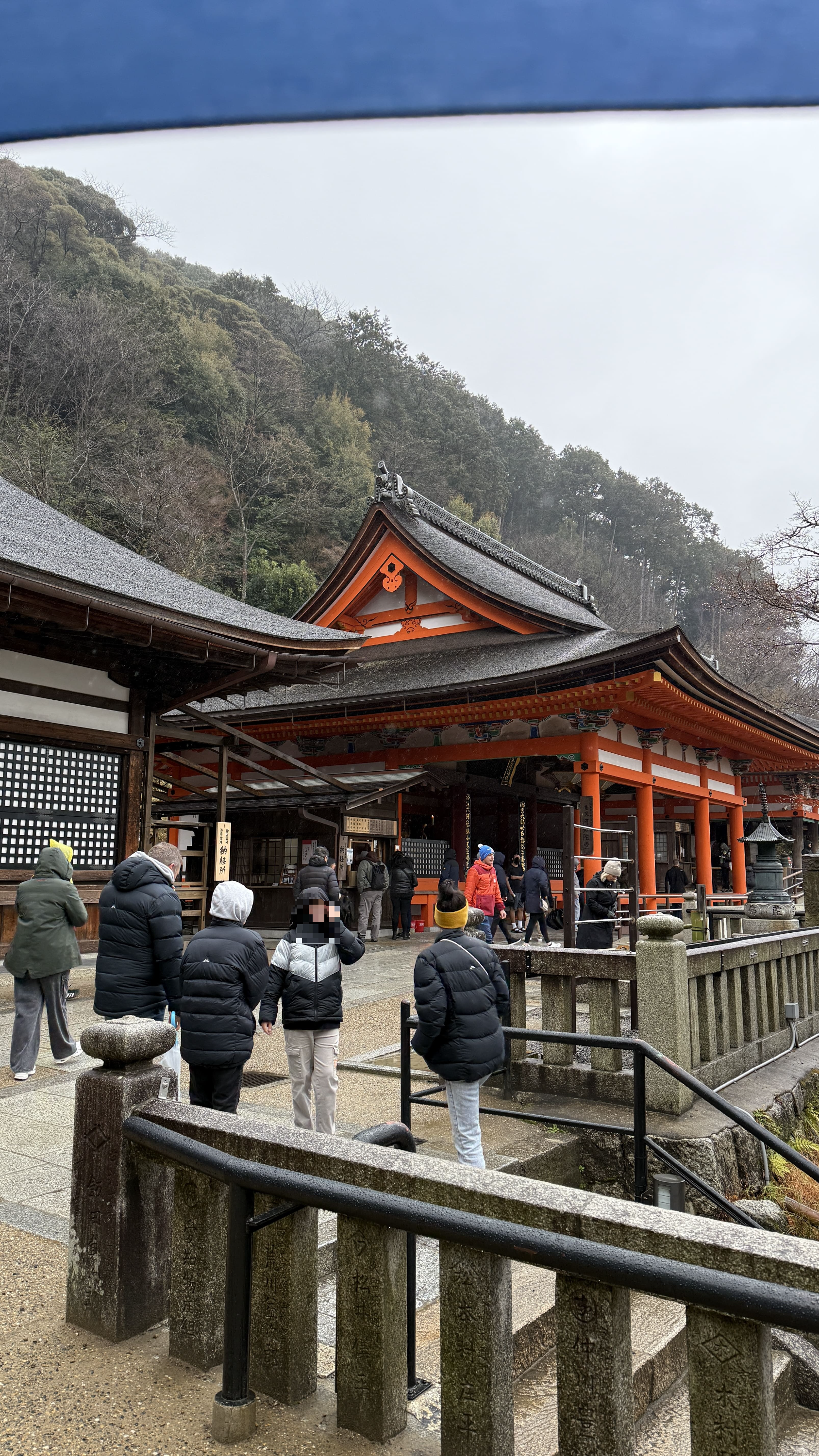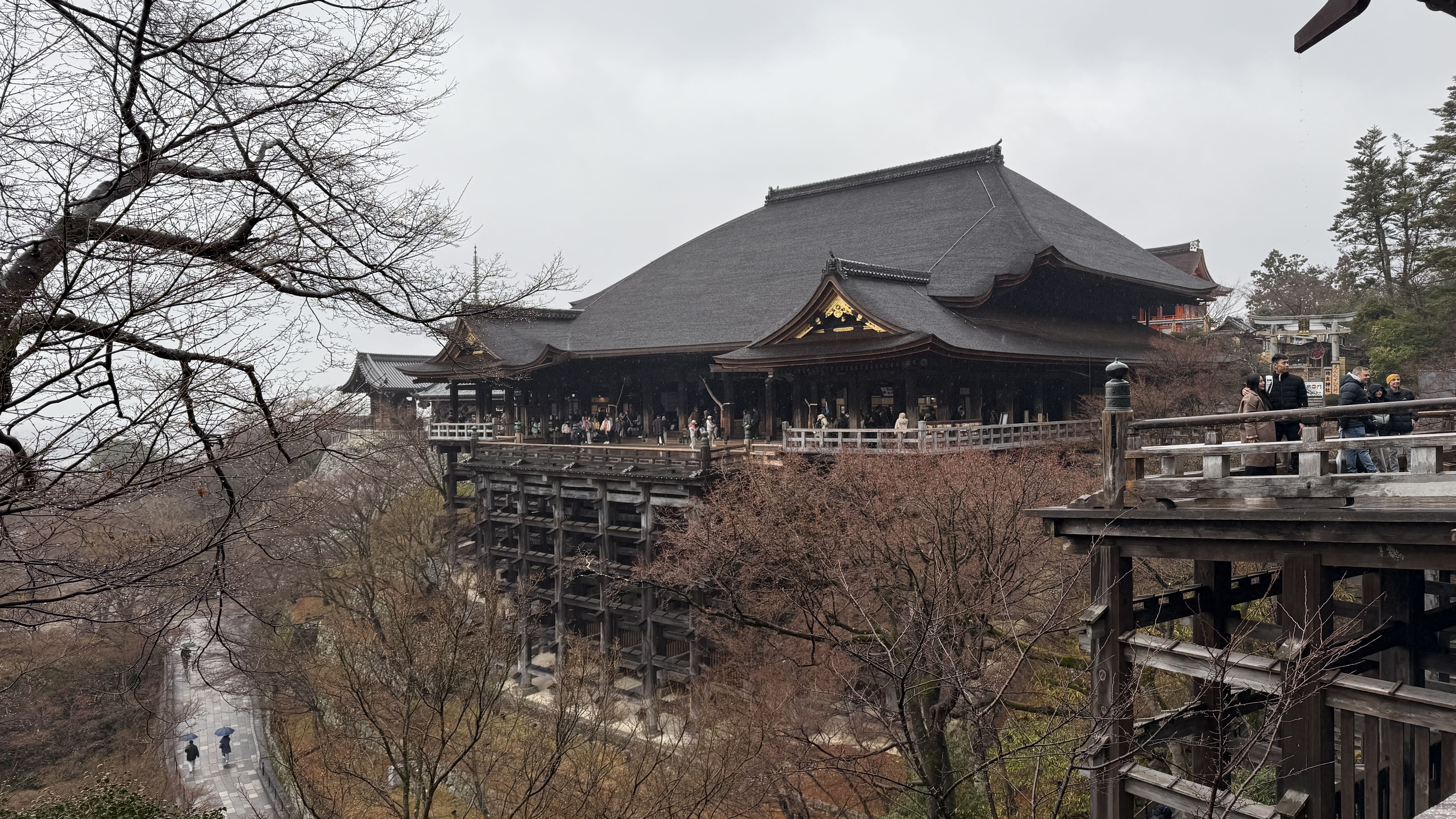 주요 포인트로는 ‘기요미즈 무대’, ‘오토와 폭포’, 그리고 다양한 부적을 파는 상점들이 있었습니다. 가장 인상 깊었던 건 역시 기요미즈 무대에서 바라보는 전망이었습니다. 사계절마다 분위기가 달라지는데, 제가 방문했을 땐 사찰 주변으로 벚꽃이 조금 피어 있어, 비가 와서 안개로 가득해서 풍경이 정말 아름다웠습니다.