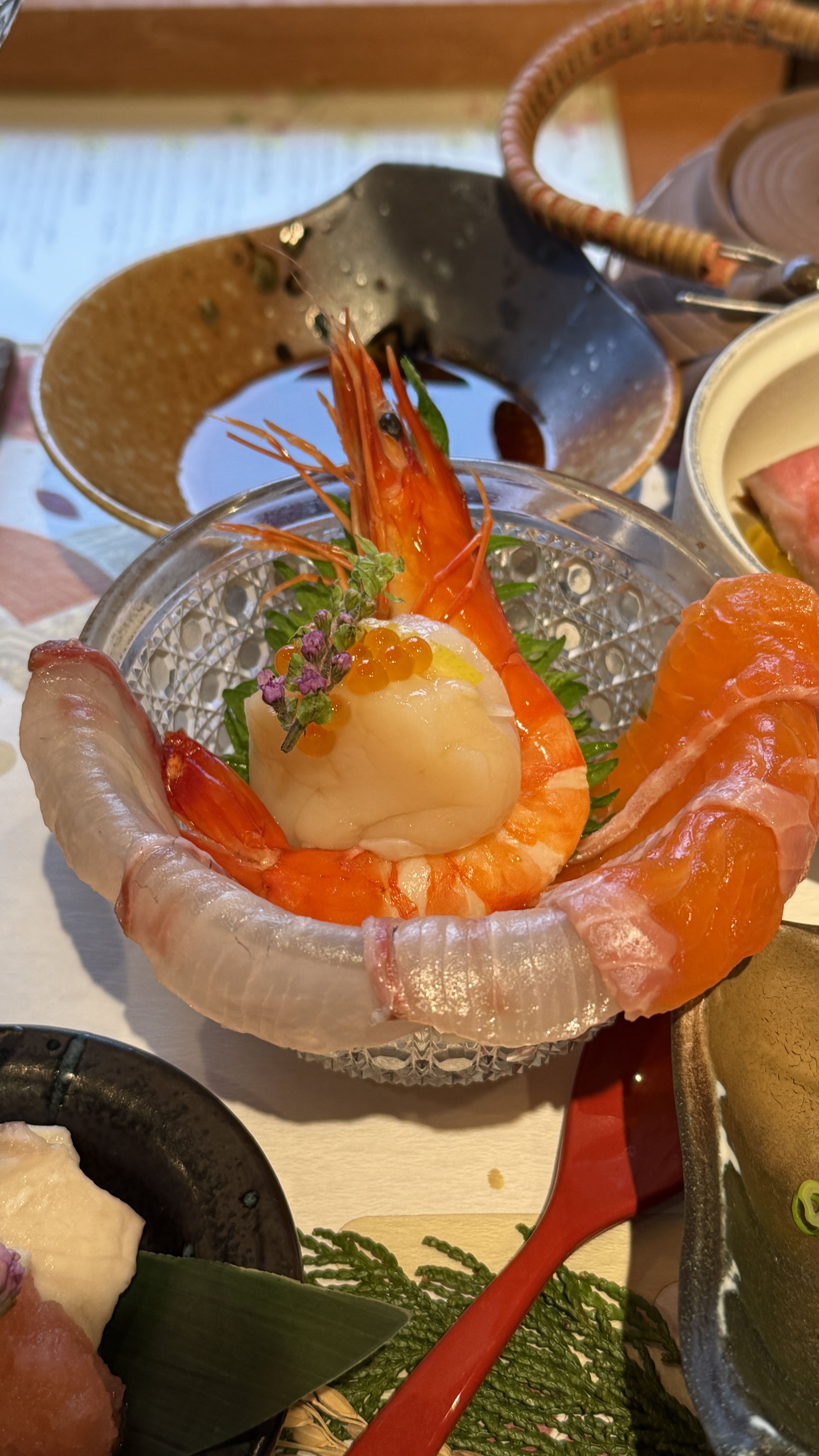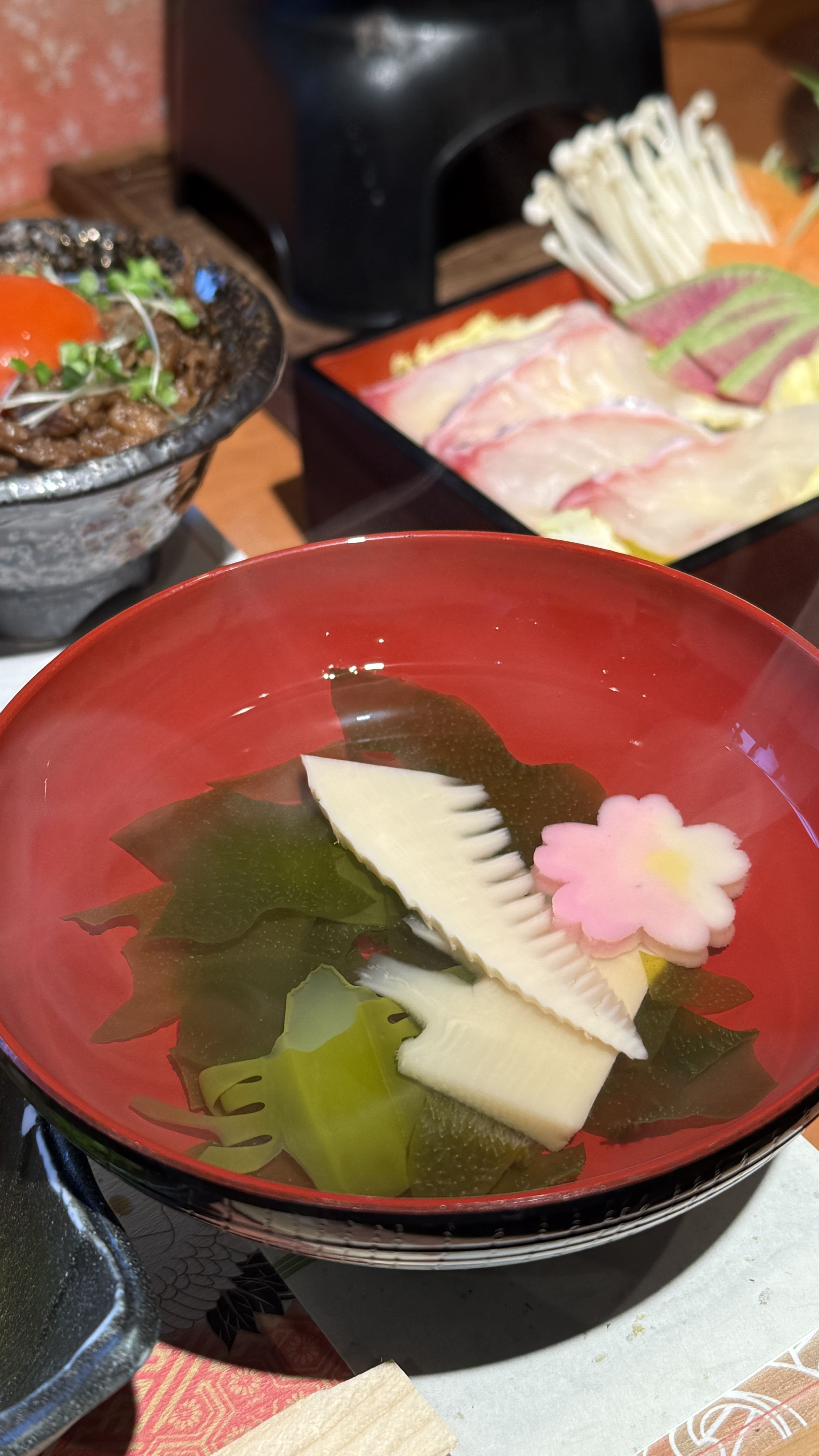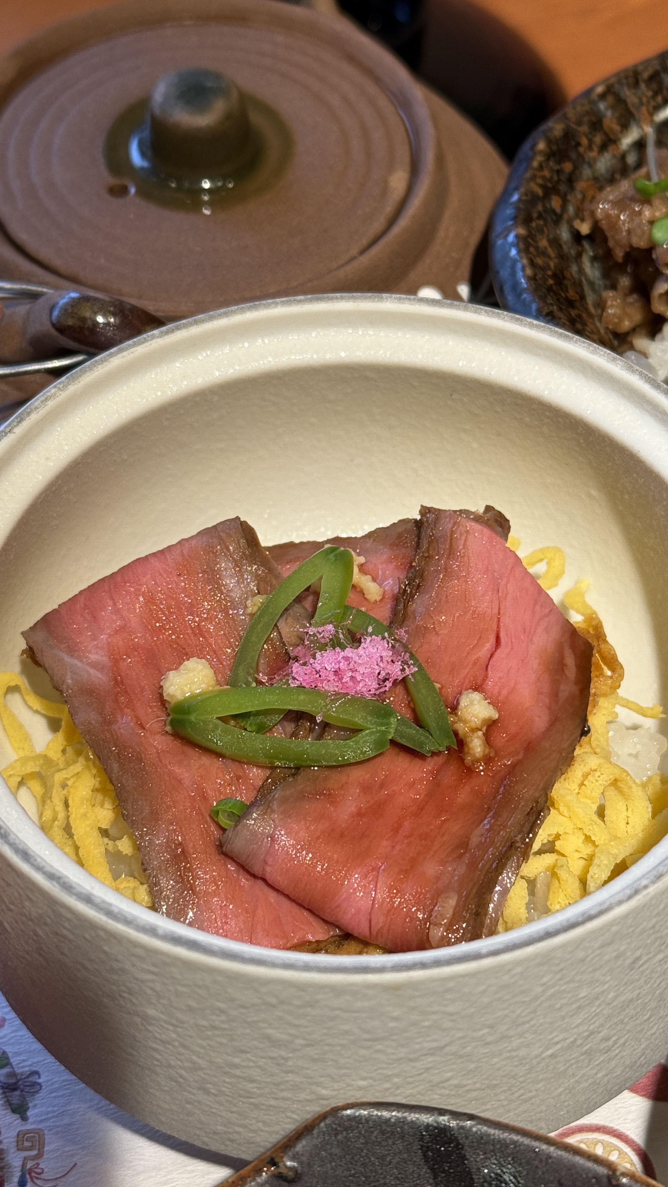 Kyoto Bowl Five-item Tasting Set - Negima Nabe 세트(4,500엔) 제가 주문한 메뉴는 ‘Kaisen-don with 5 kinds of Chirashi Sushi’였고, 여러 가지 해산물이 정갈하게 담긴 가이세키 스타일이었습니다. 도미와 새우, 연어회와 가다랑어 등 신선한 해산물이 시선을 사로잡았고, 각각의 작은 접시 하나하나에 정성이 가득 느껴졌습니다. 그 외에도 와규 덮밥, 두부, 샐러드, 국, 따뜻한 차까지 모든 것이 완벽하게 어울려 입과 눈 모두가 즐거운 식사였습니다. 먹기에 너무 이쁜 일본음식들!