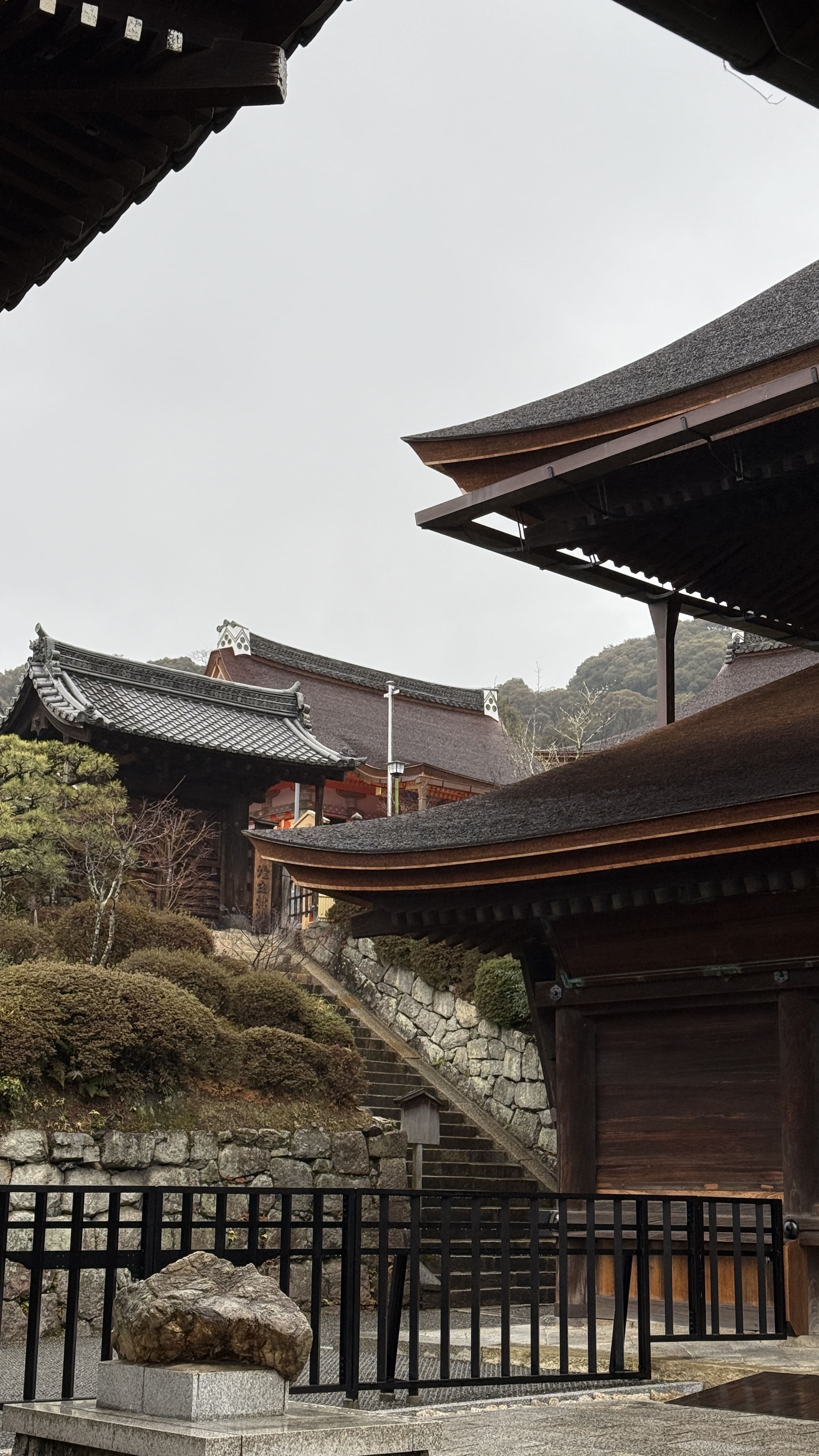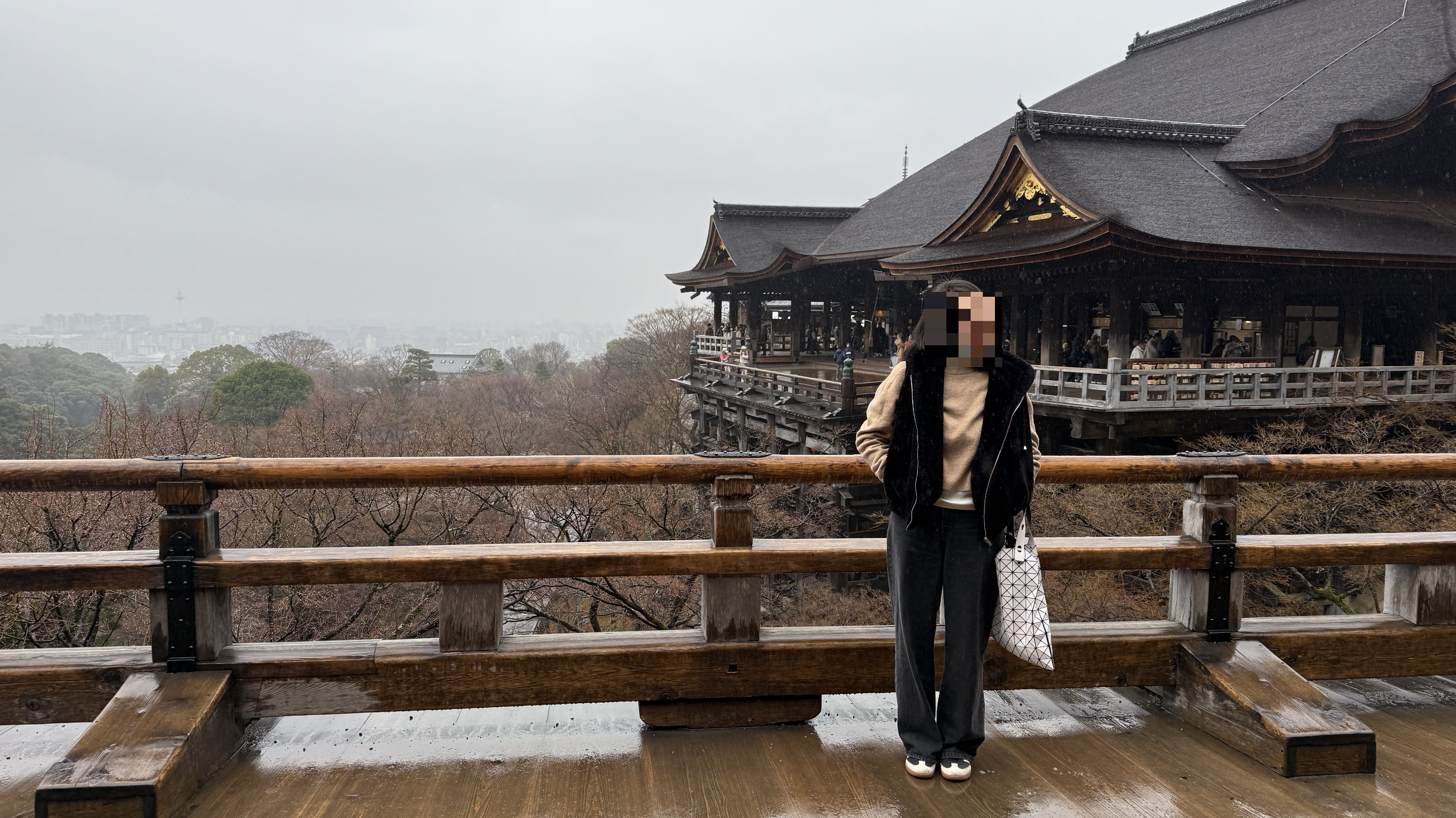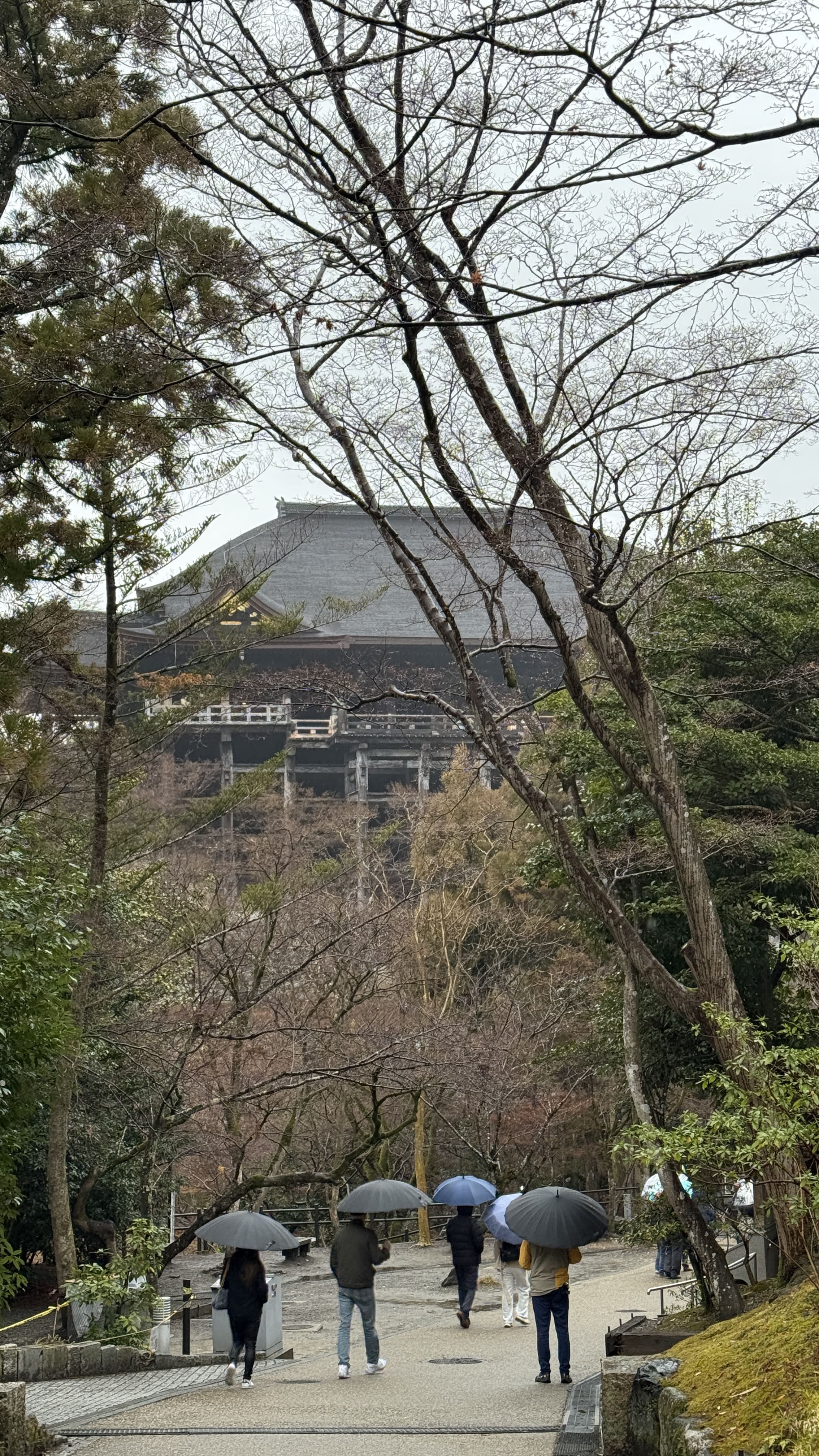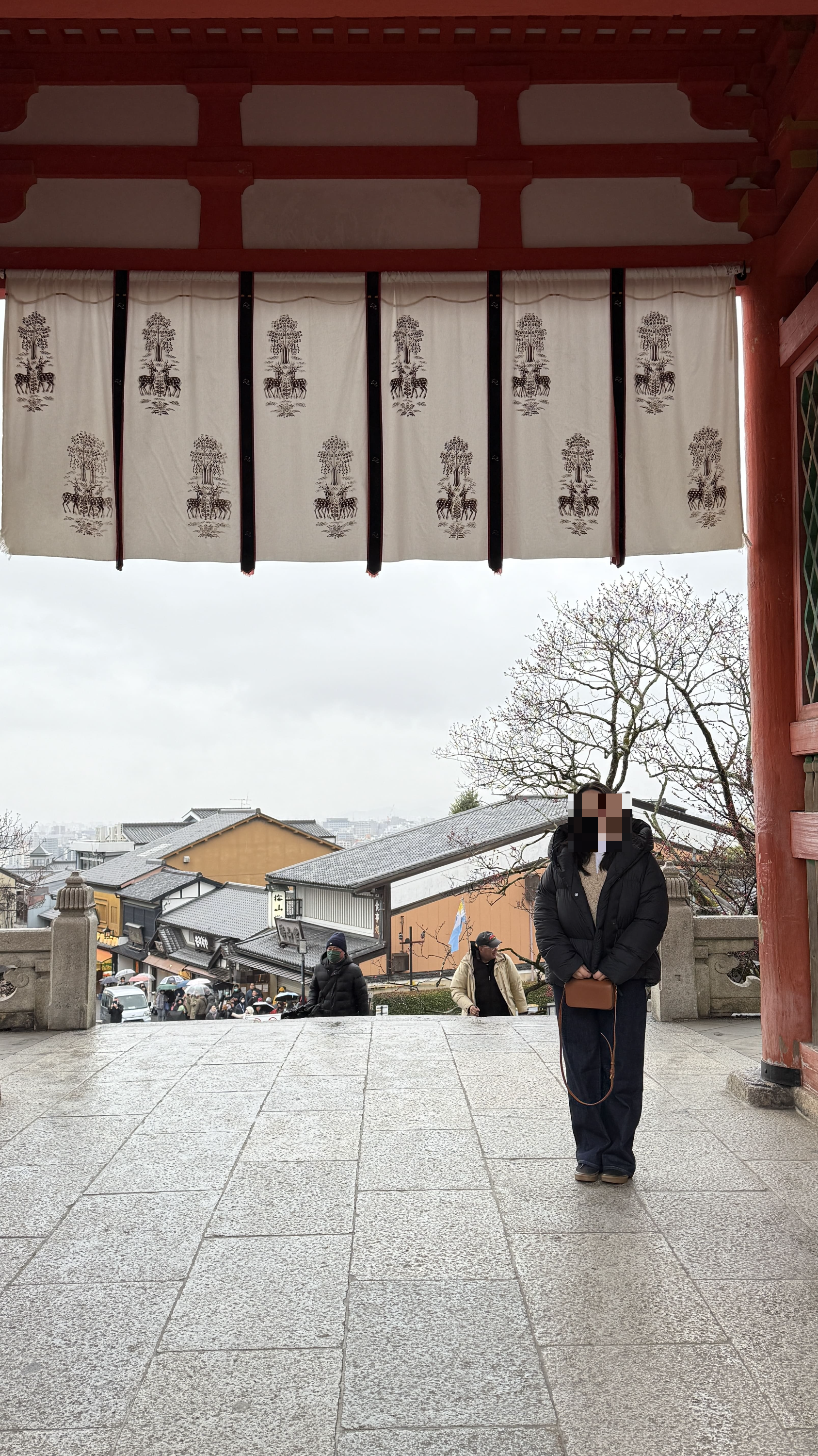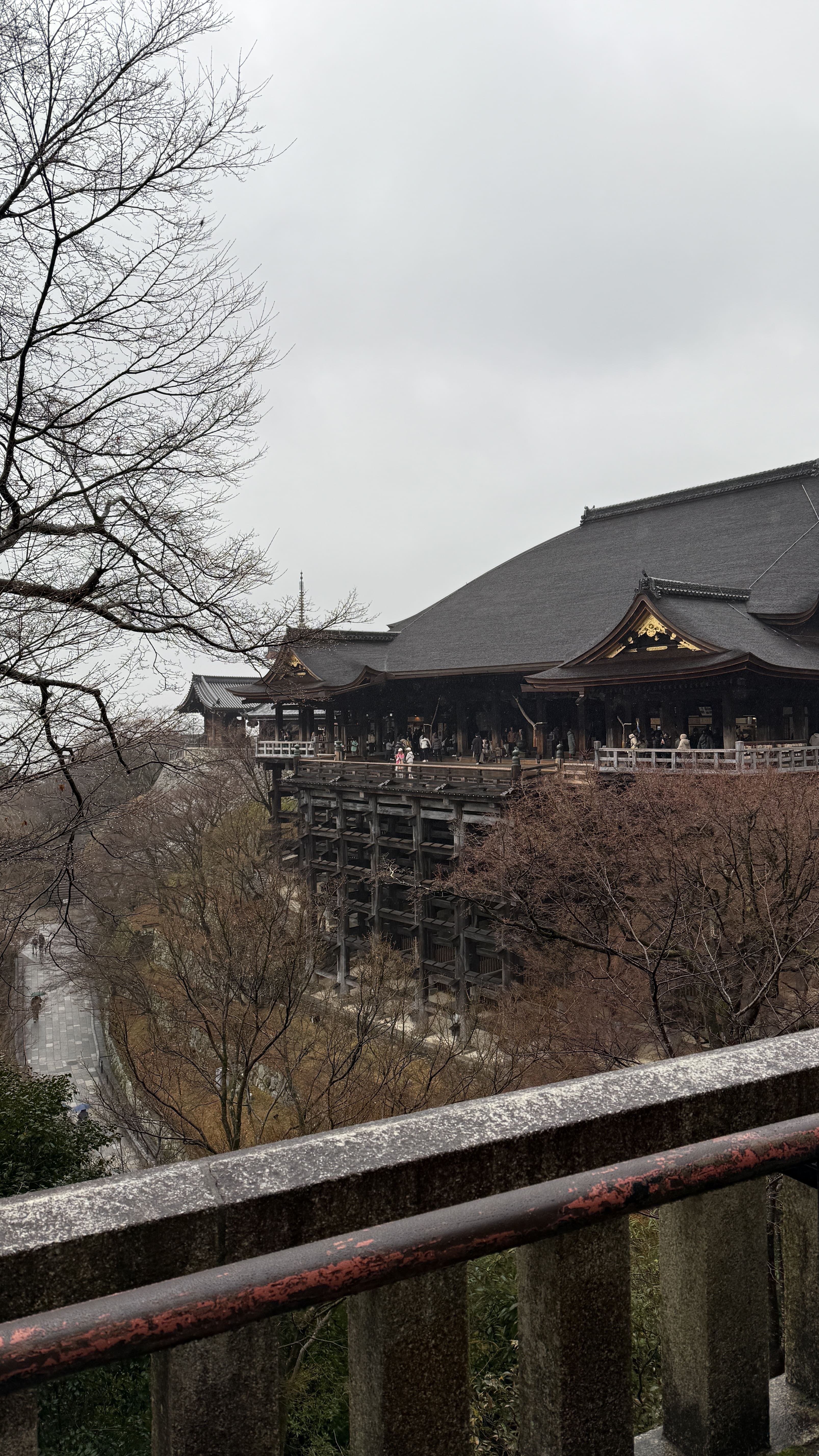 주요 포인트로는 ‘기요미즈 무대’, ‘오토와 폭포’, 그리고 다양한 부적을 파는 상점들이 있었습니다. 가장 인상 깊었던 건 역시 기요미즈 무대에서 바라보는 전망이었습니다. 사계절마다 분위기가 달라지는데, 제가 방문했을 땐 사찰 주변으로 벚꽃이 조금 피어 있어, 비가 와서 안개로 가득해서 풍경이 정말 아름다웠습니다.
