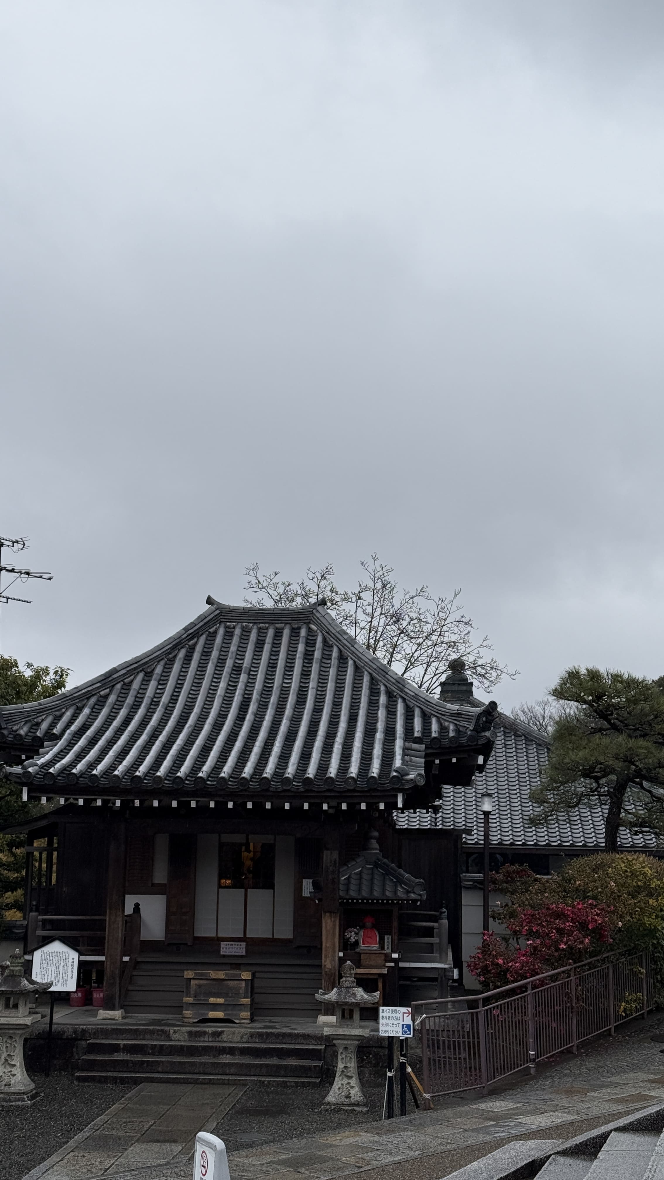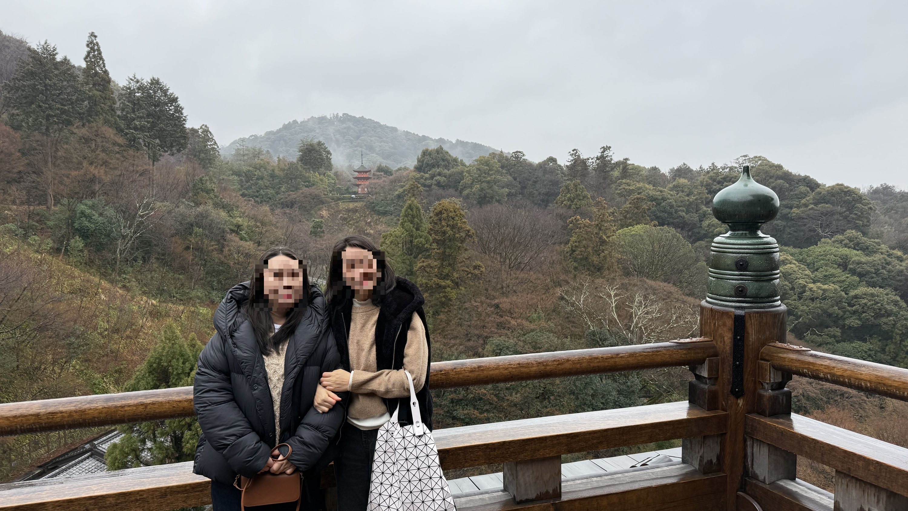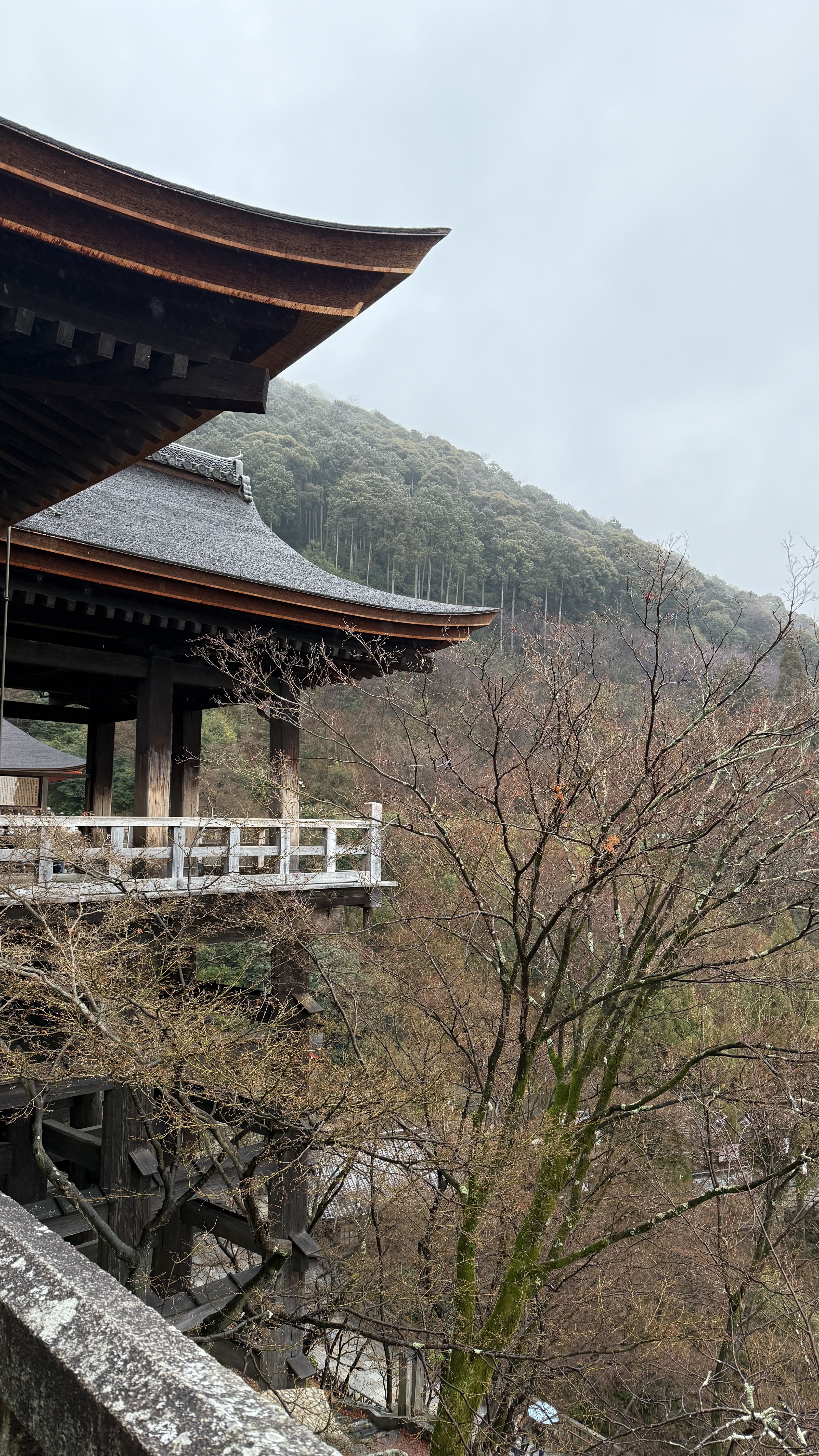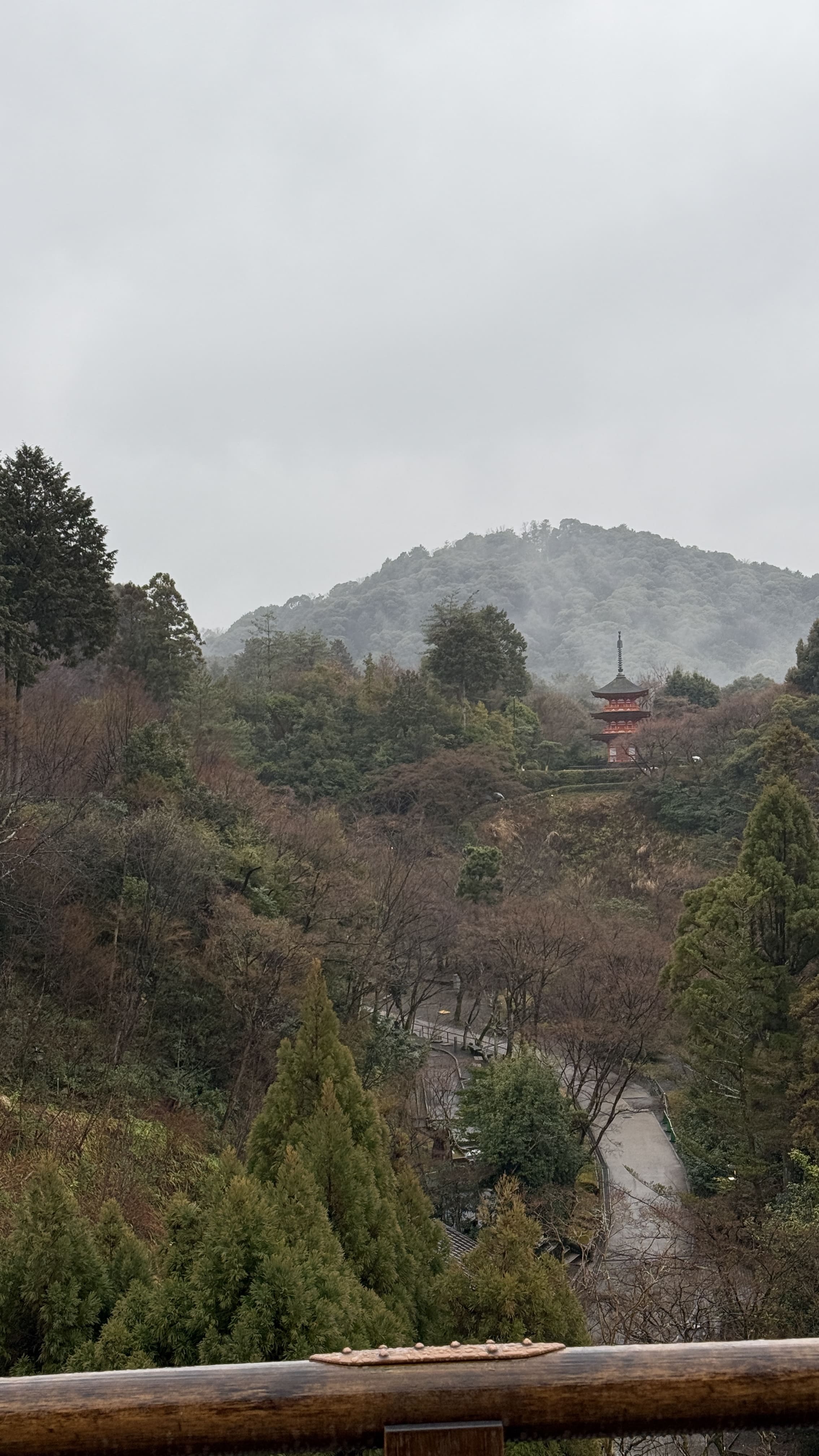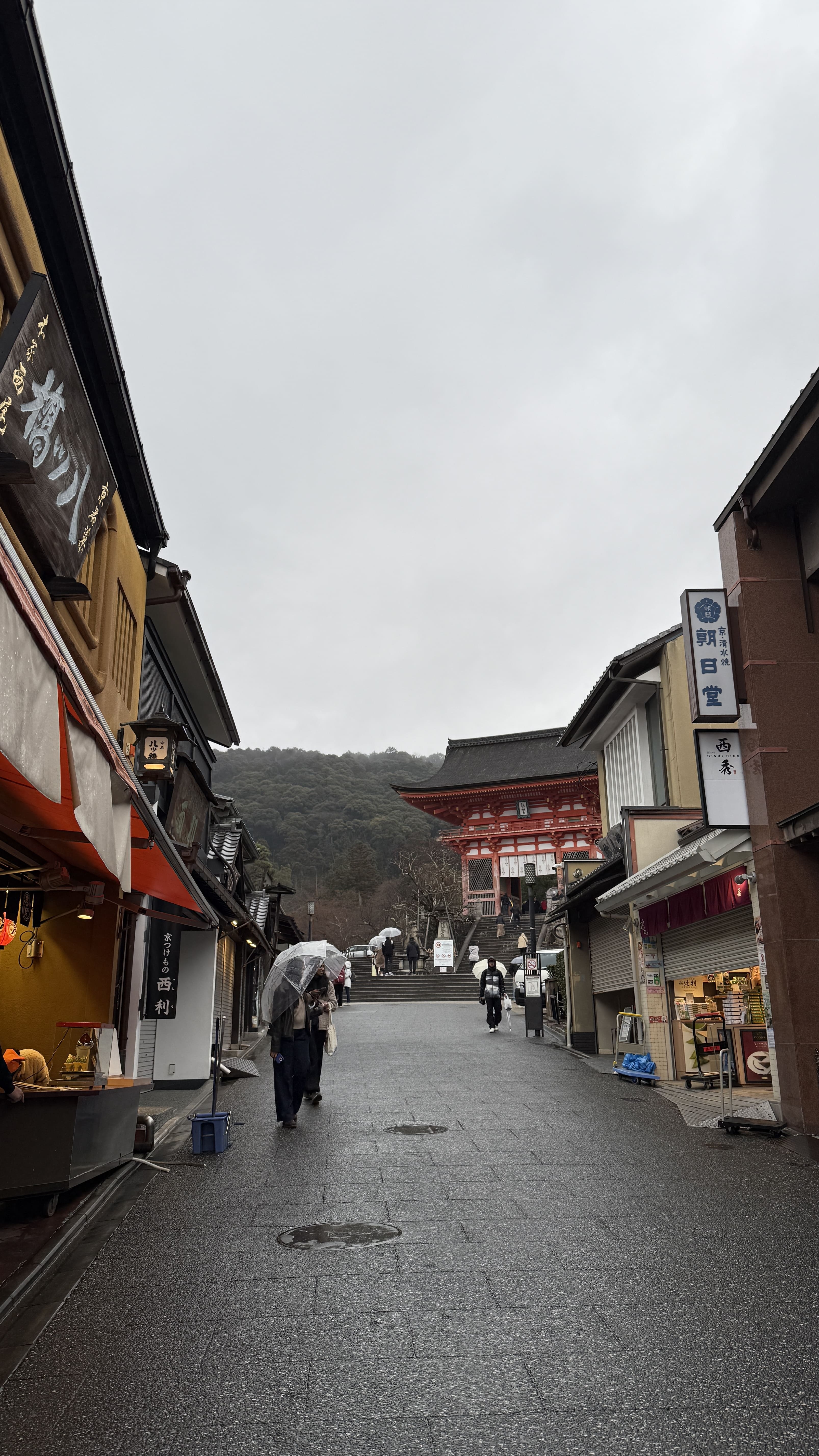 주요 포인트로는 ‘기요미즈 무대’, ‘오토와 폭포’, 그리고 다양한 부적을 파는 상점들이 있었습니다. 가장 인상 깊었던 건 역시 기요미즈 무대에서 바라보는 전망이었습니다. 사계절마다 분위기가 달라지는데, 제가 방문했을 땐 사찰 주변으로 벚꽃이 조금 피어 있어, 비가 와서 안개로 가득해서 풍경이 정말 아름다웠습니다.
