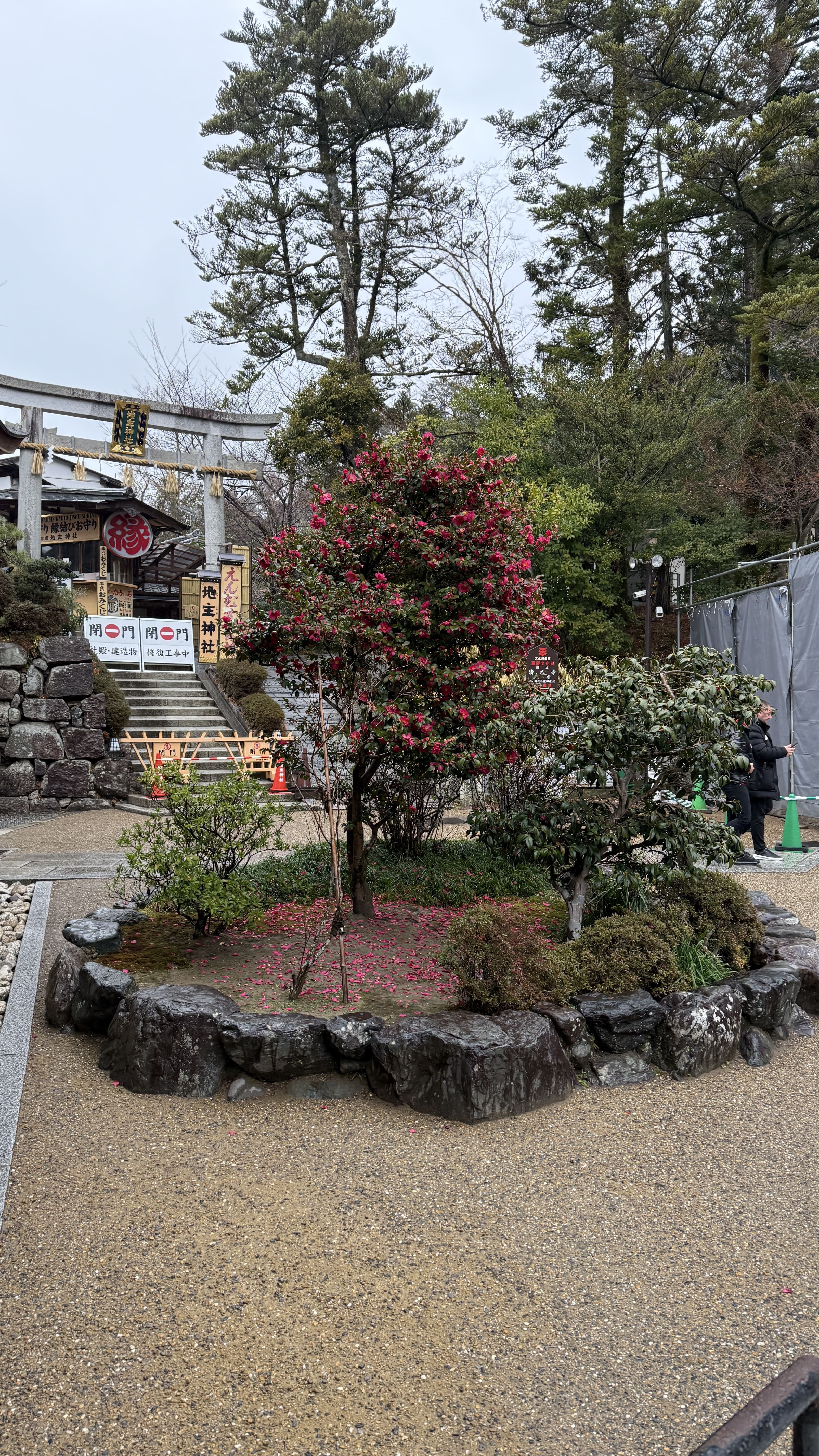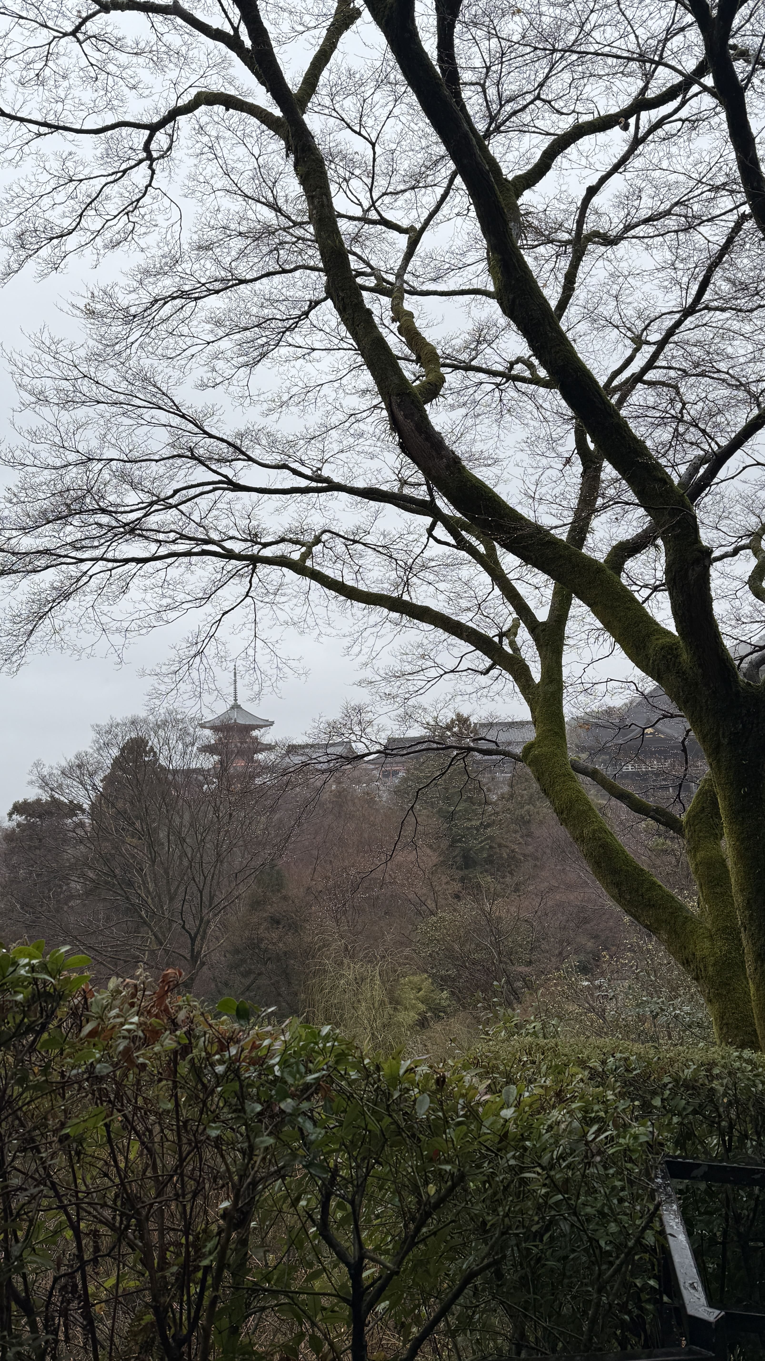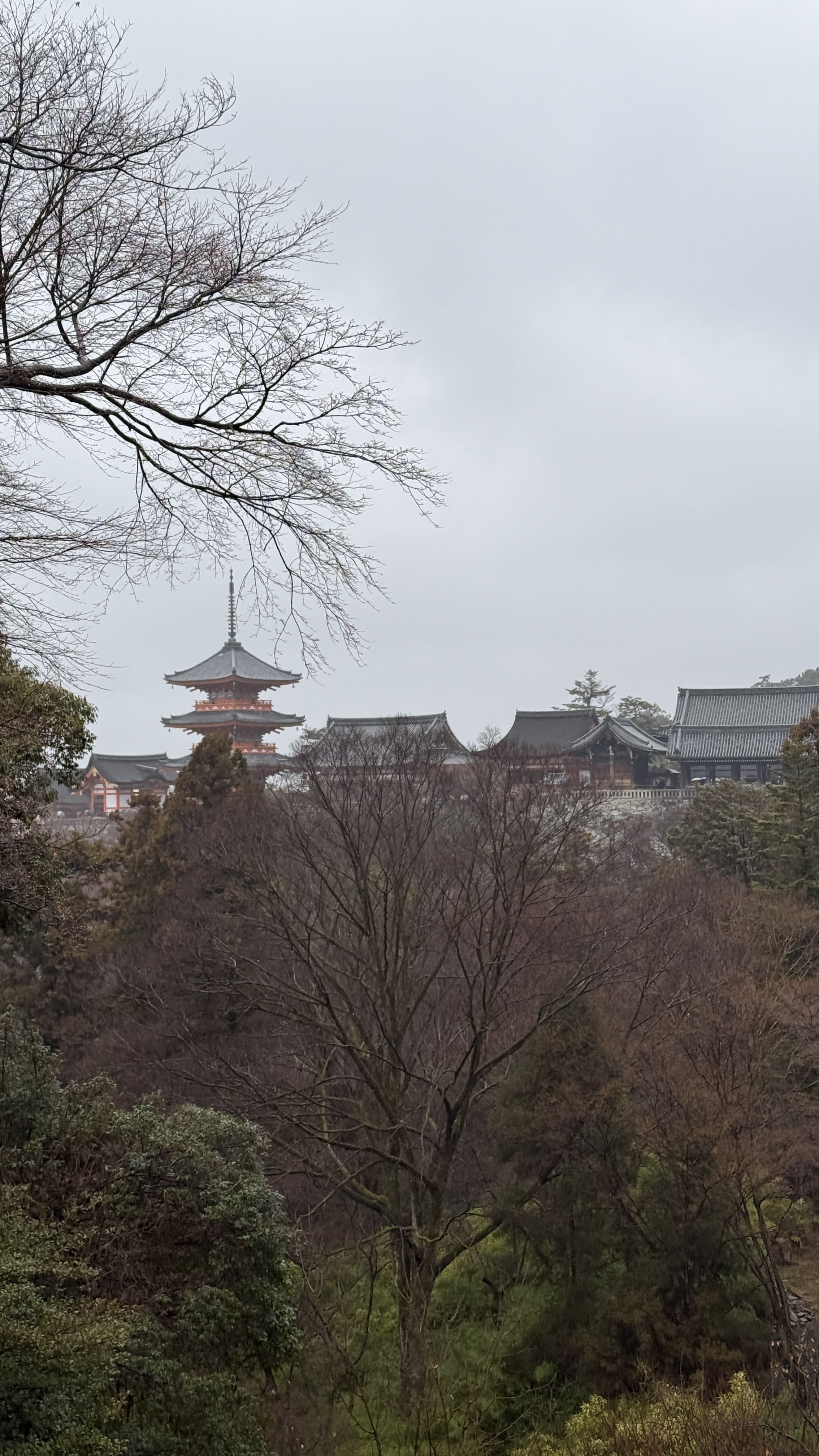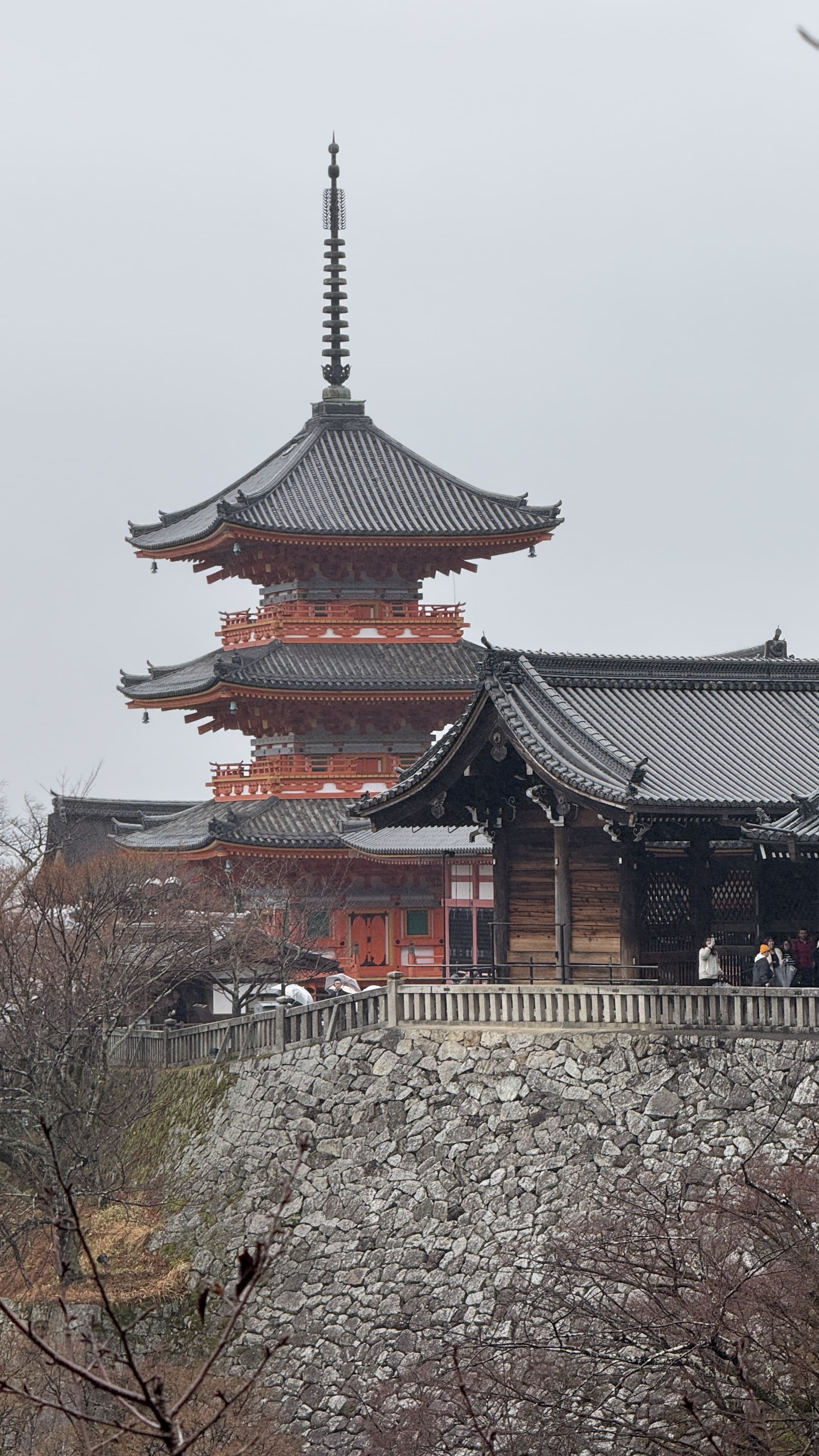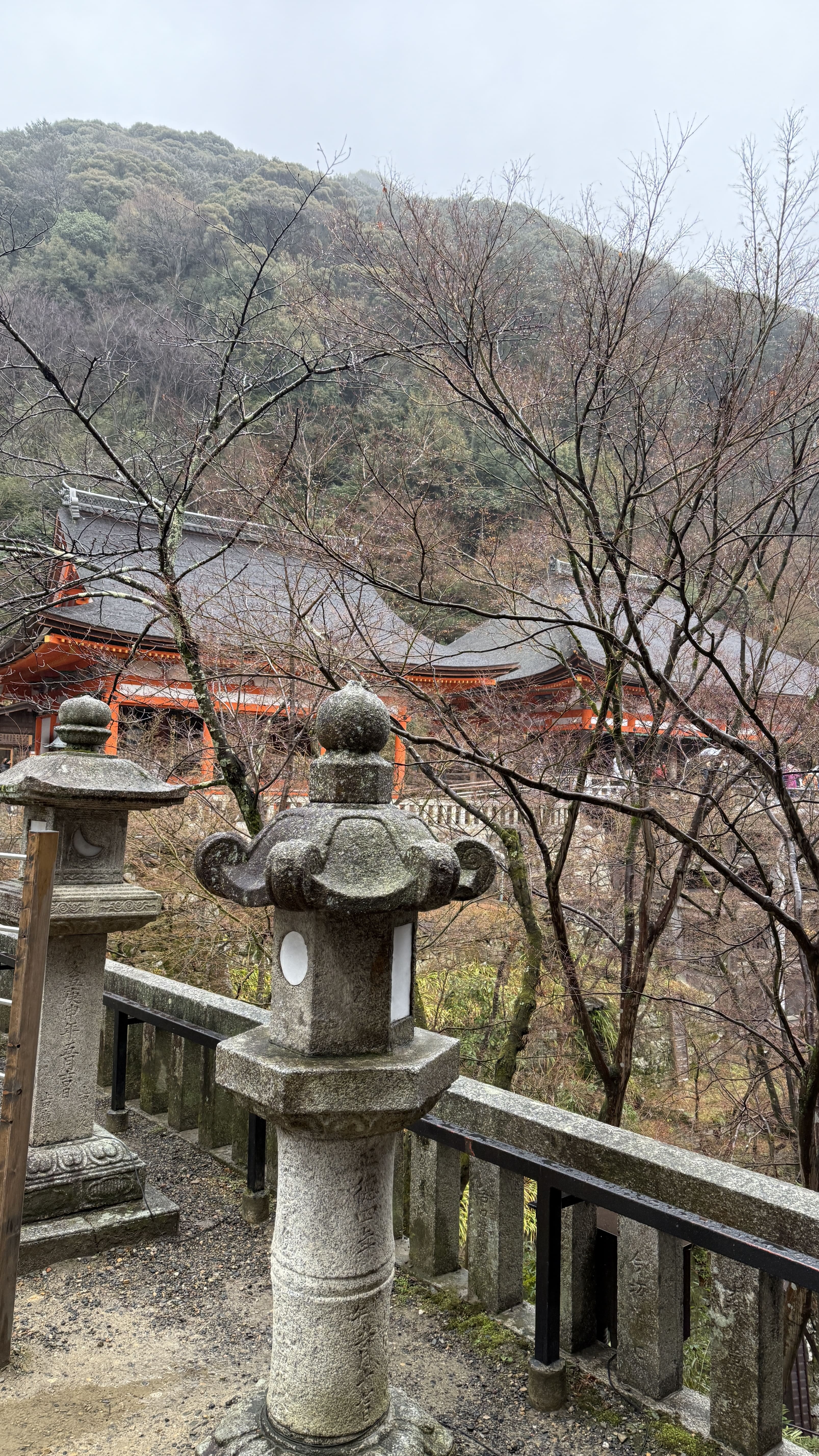 주요 포인트로는 ‘기요미즈 무대’, ‘오토와 폭포’, 그리고 다양한 부적을 파는 상점들이 있었습니다. 가장 인상 깊었던 건 역시 기요미즈 무대에서 바라보는 전망이었습니다. 사계절마다 분위기가 달라지는데, 제가 방문했을 땐 사찰 주변으로 벚꽃이 조금 피어 있어, 비가 와서 안개로 가득해서 풍경이 정말 아름다웠습니다.