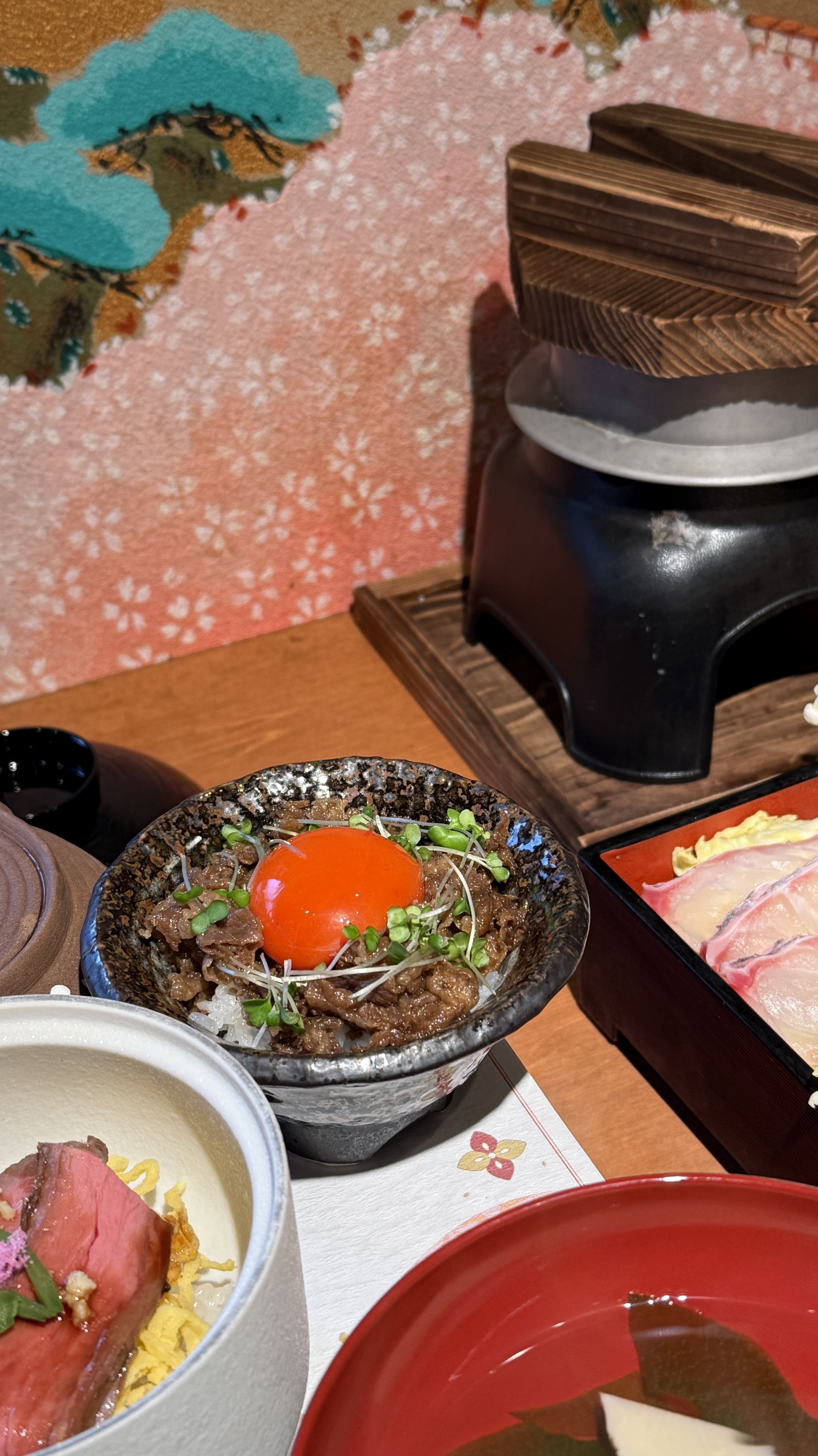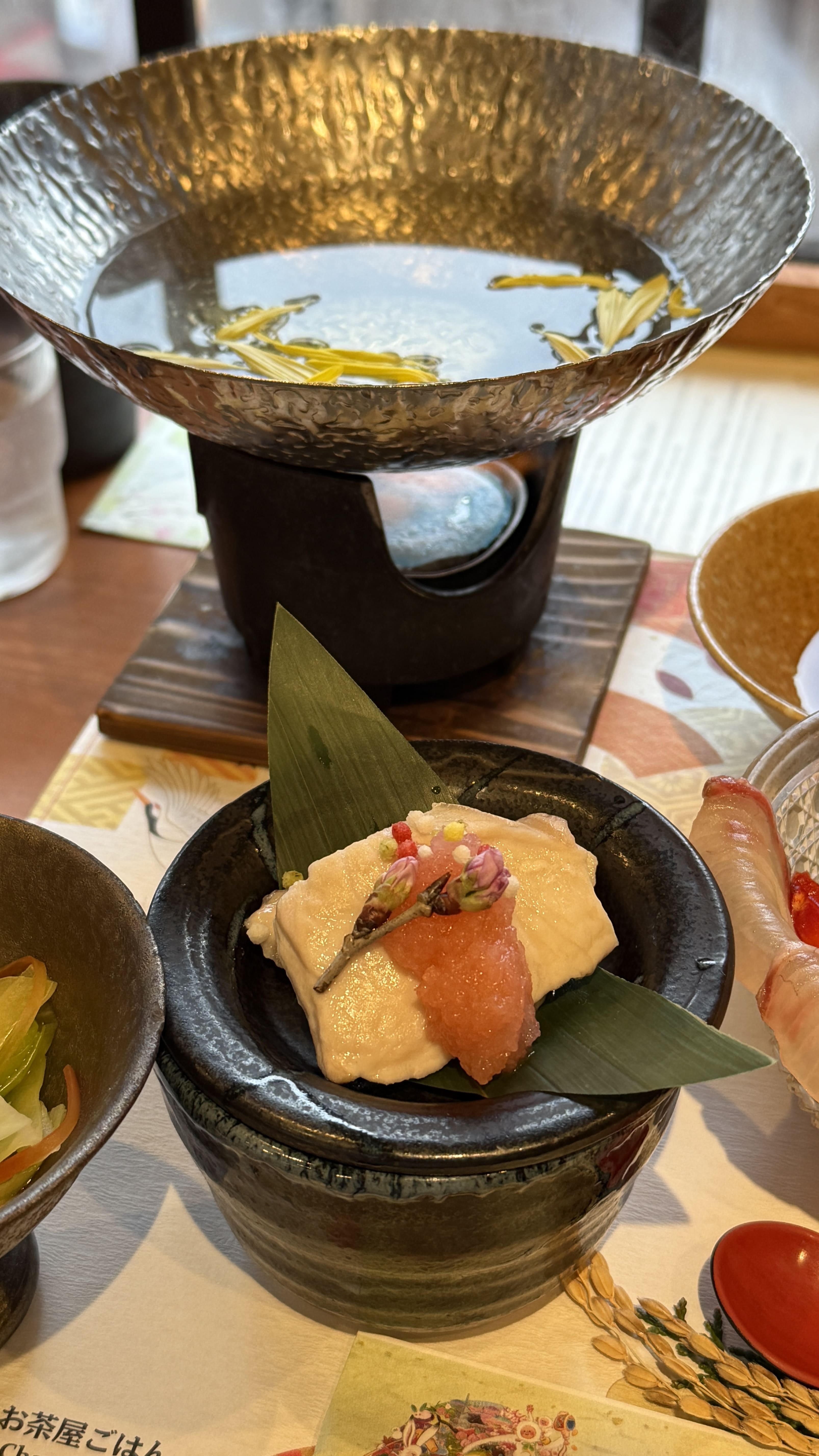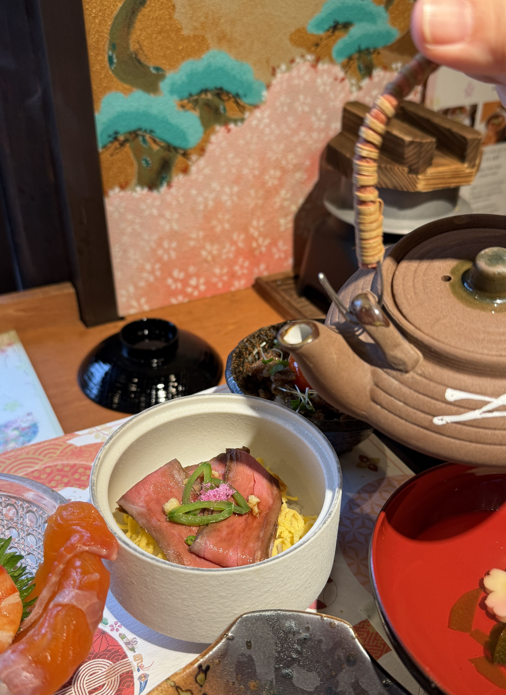 Kyoto Bowl Five-item Tasting Set - Negima Nabe 세트(4,500엔) 제가 주문한 메뉴는 ‘Kaisen-don with 5 kinds of Chirashi Sushi’였고, 여러 가지 해산물이 정갈하게 담긴 가이세키 스타일이었습니다. 도미와 새우, 연어회와 가다랑어 등 신선한 해산물이 시선을 사로잡았고, 각각의 작은 접시 하나하나에 정성이 가득 느껴졌습니다. 그 외에도 와규 덮밥, 두부, 샐러드, 국, 따뜻한 차까지 모든 것이 완벽하게 어울려 입과 눈 모두가 즐거운 식사였습니다. 먹기에 너무 이쁜 일본음식들!
