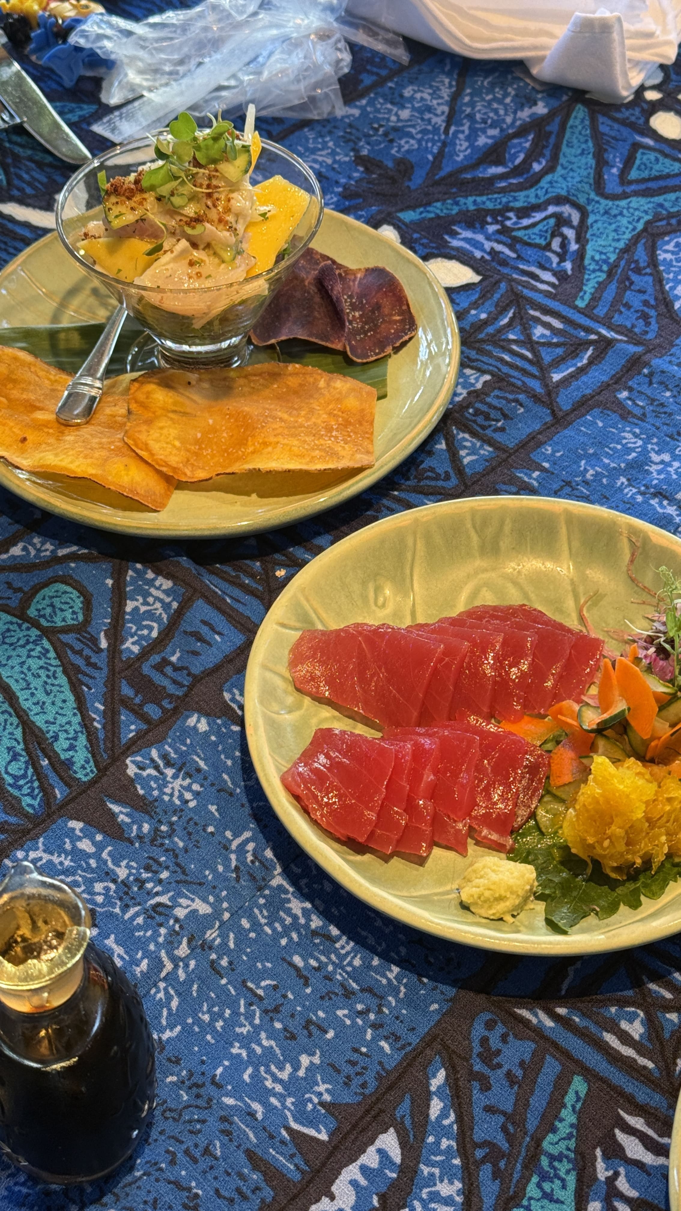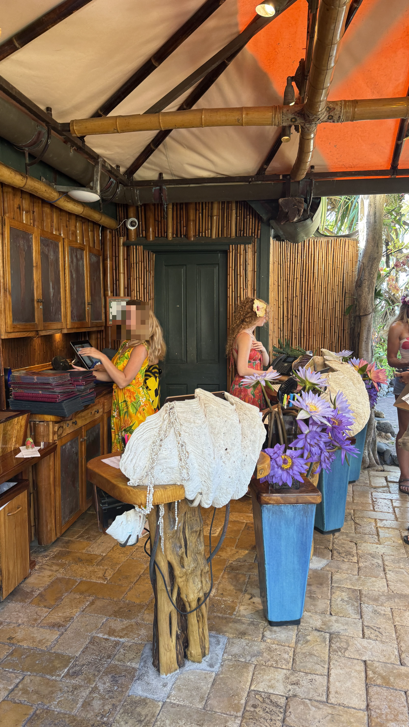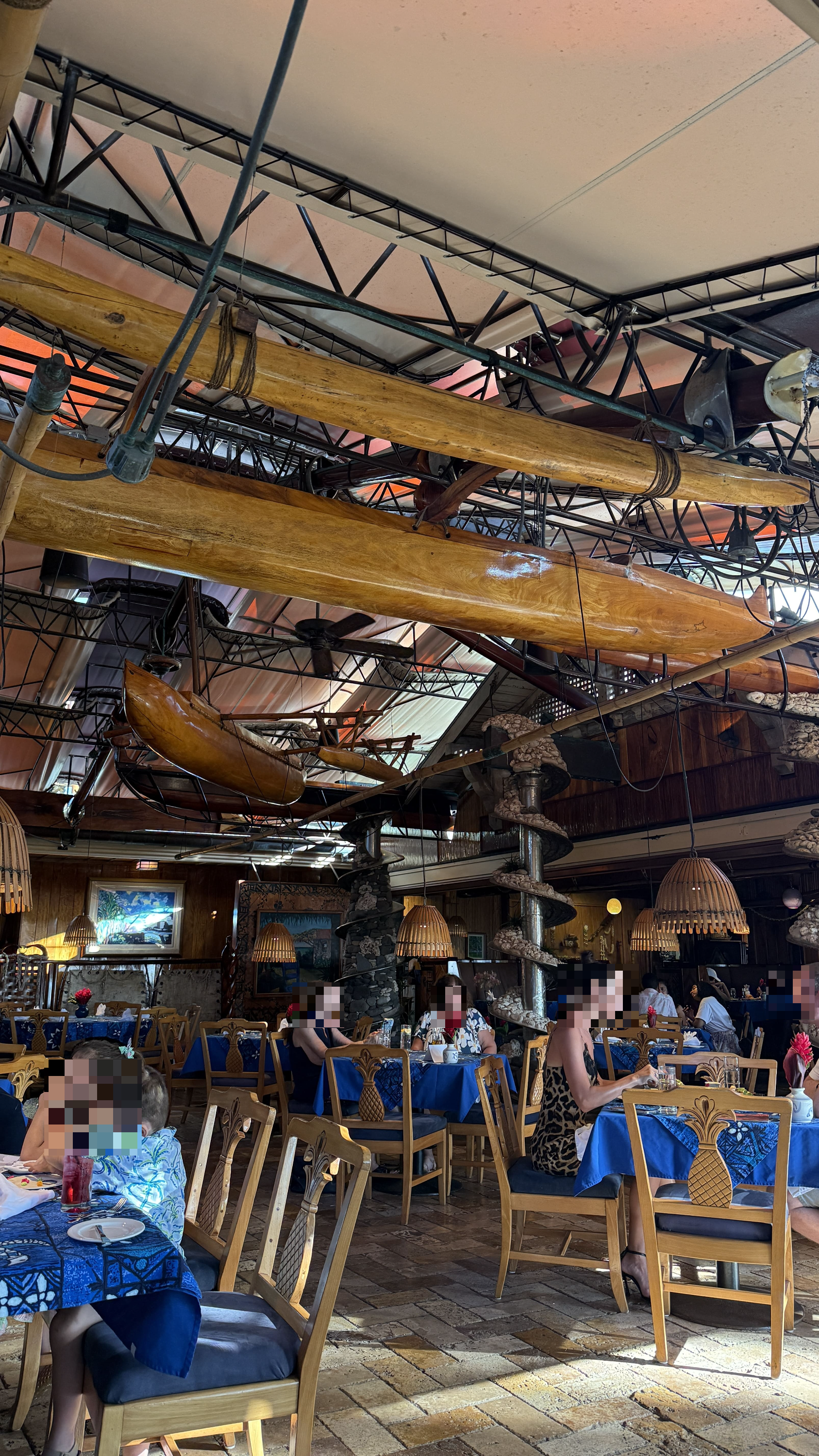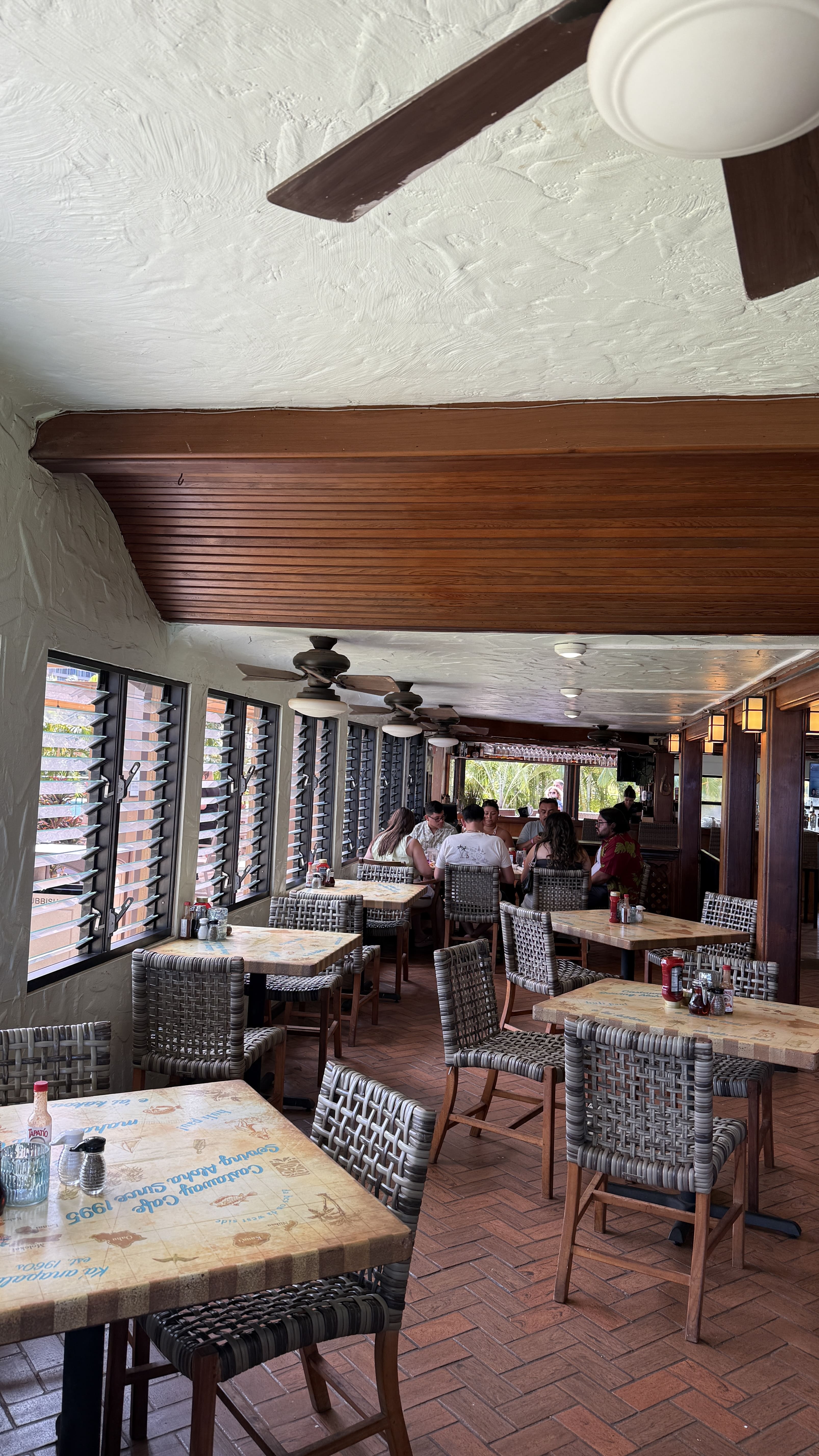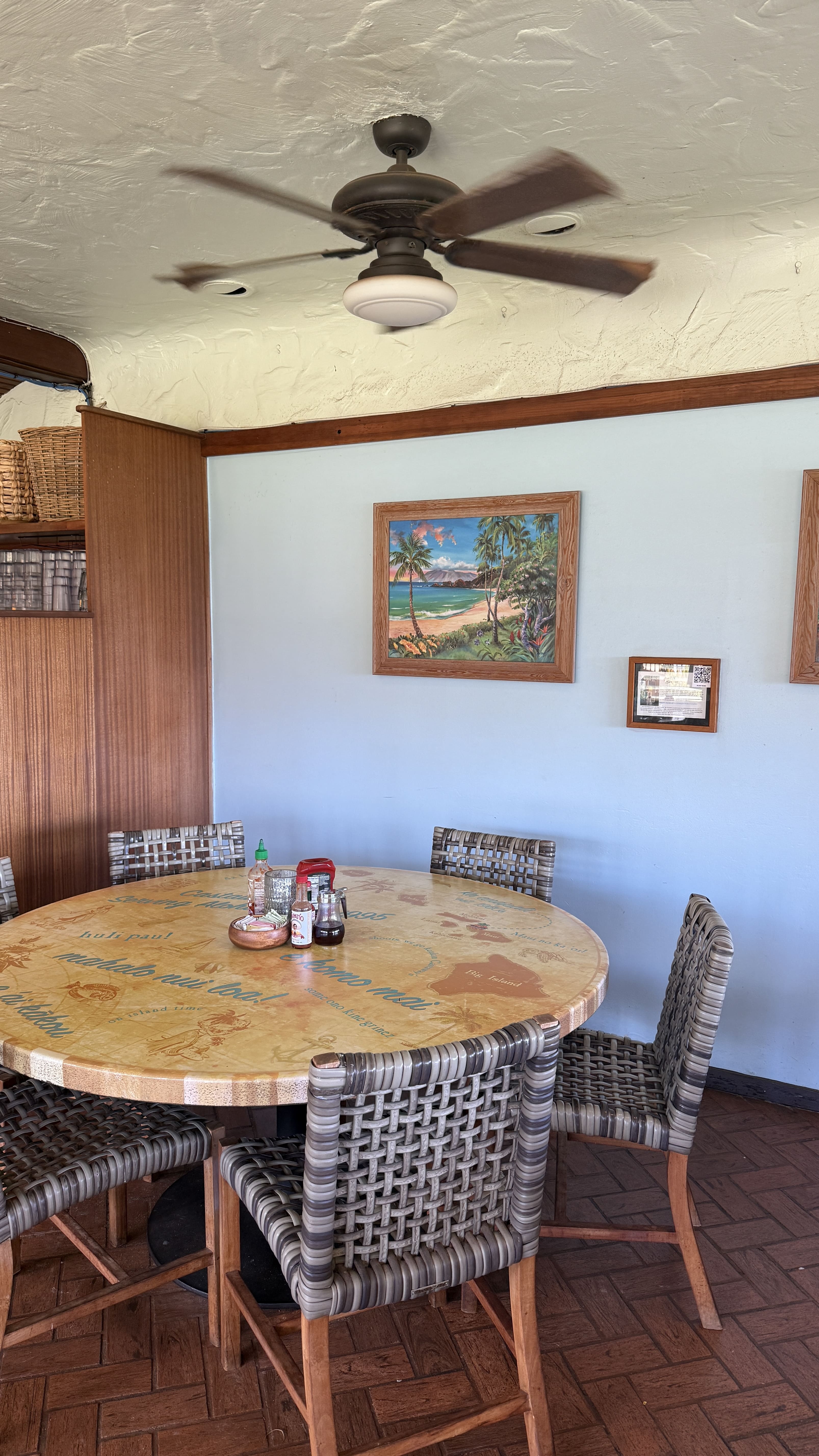 입구부터 이국적인 분위기가 물씬 풍겨 마치 다른 세상으로 들어가는 기분이었어요. 식당 내부는 하와이 전통 양식으로 꾸며져 있었고, 테이블마다 독특한 무늬의 테이블보가 깔려 있어 사진 찍기에도 좋았어요.