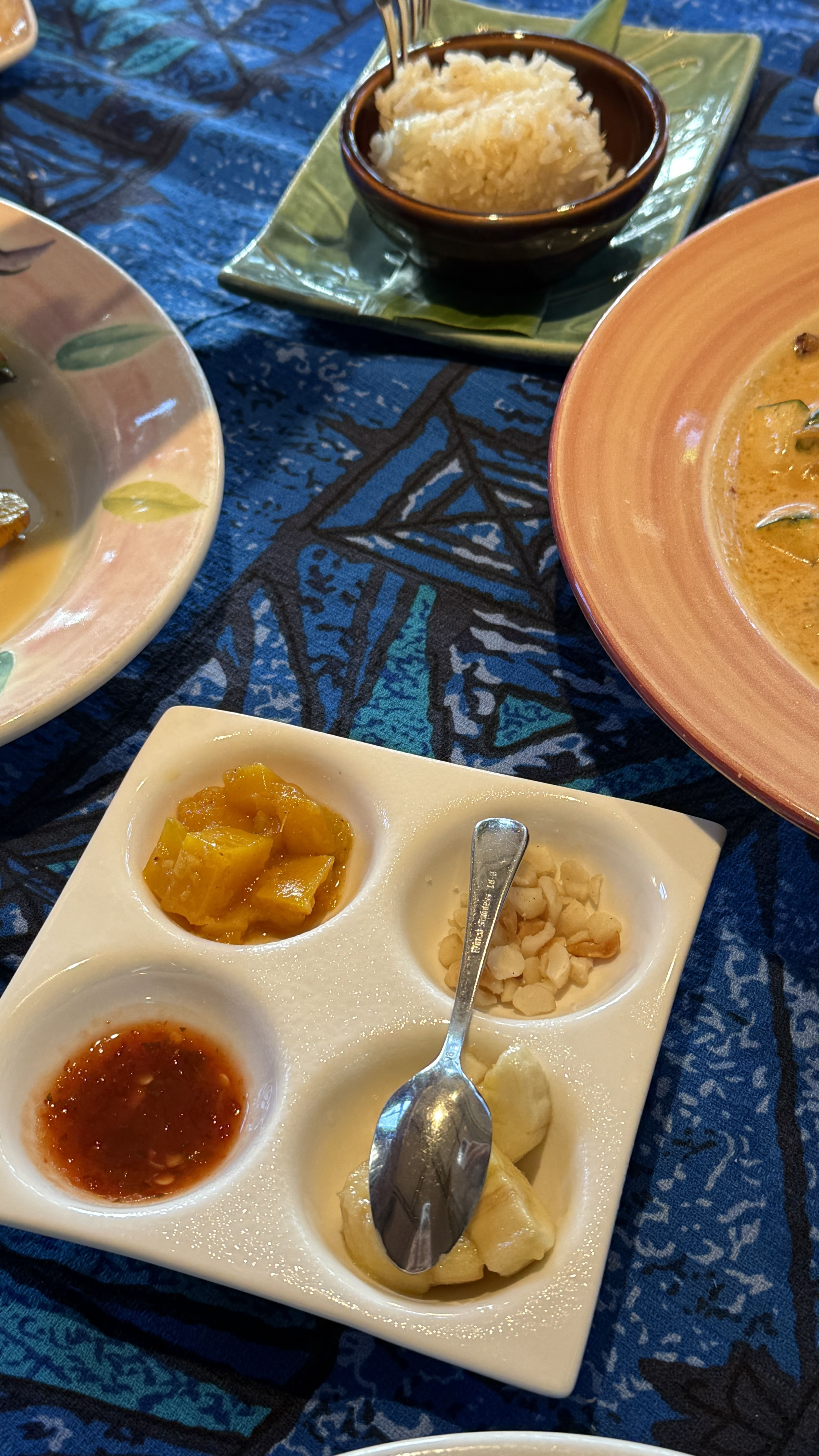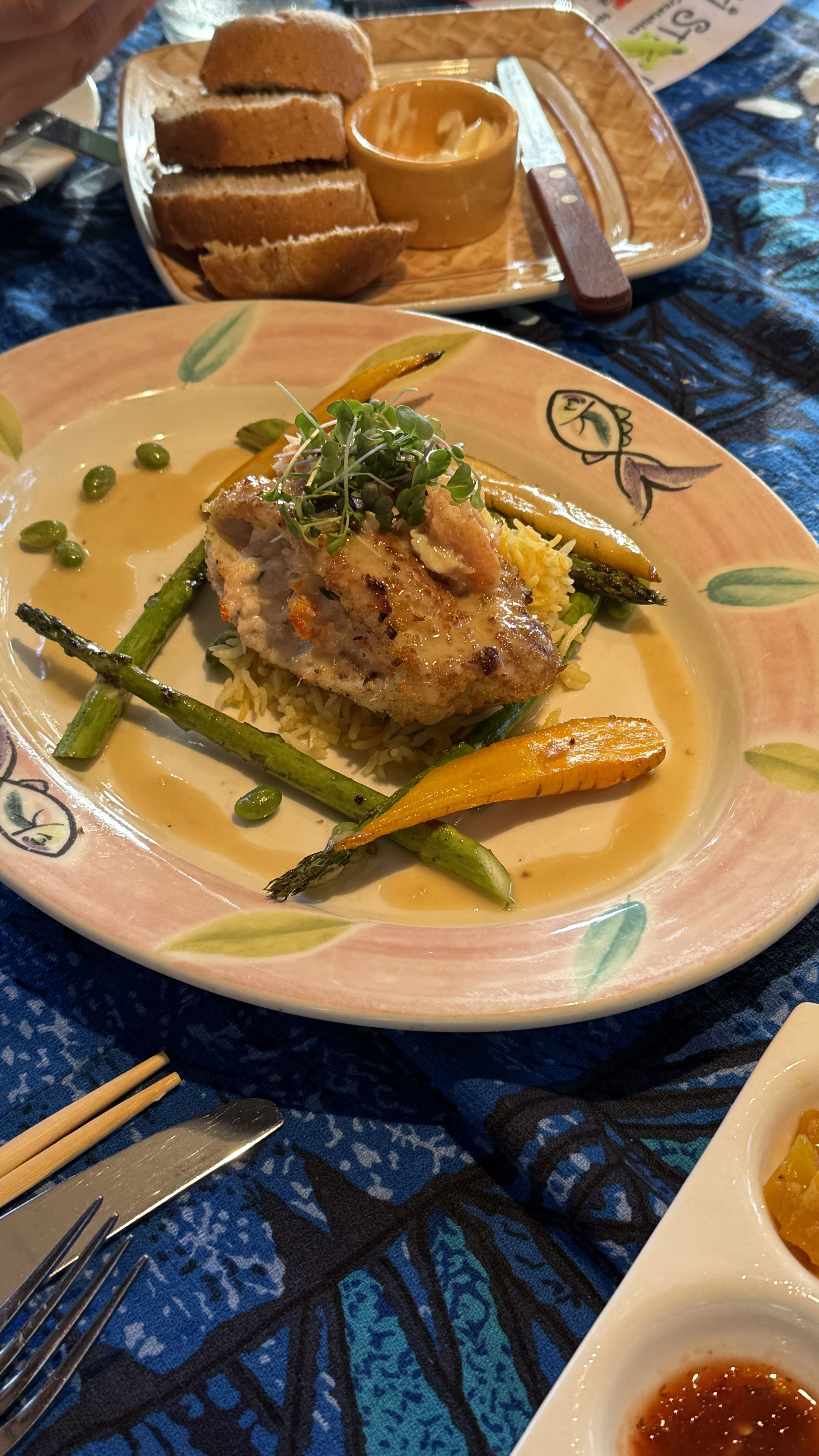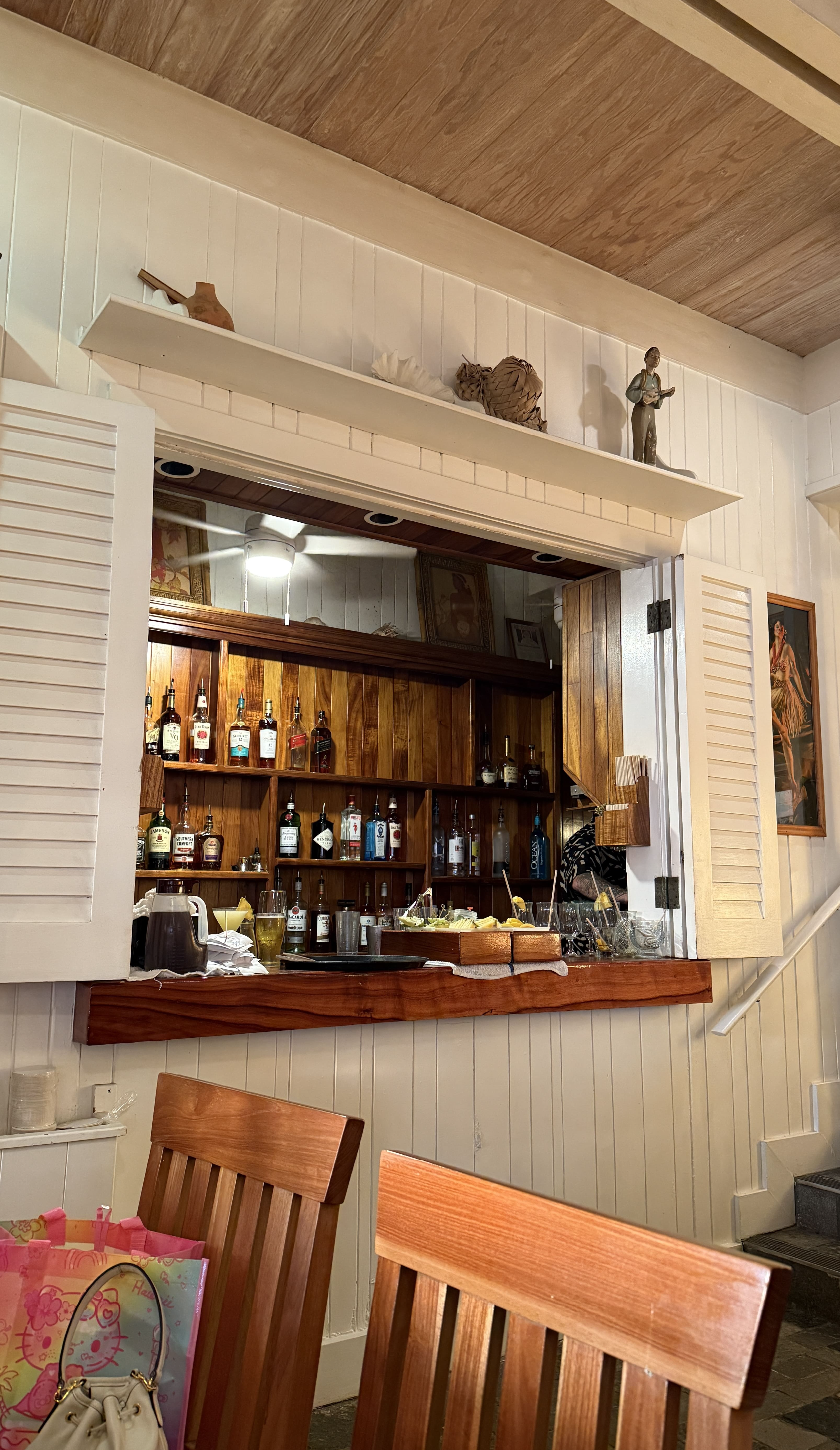 입구부터 이국적인 분위기가 물씬 풍겨 마치 다른 세상으로 들어가는 기분이었어요. 식당 내부는 하와이 전통 양식으로 꾸며져 있었고, 테이블마다 독특한 무늬의 테이블보가 깔려 있어 사진 찍기에도 좋았어요.