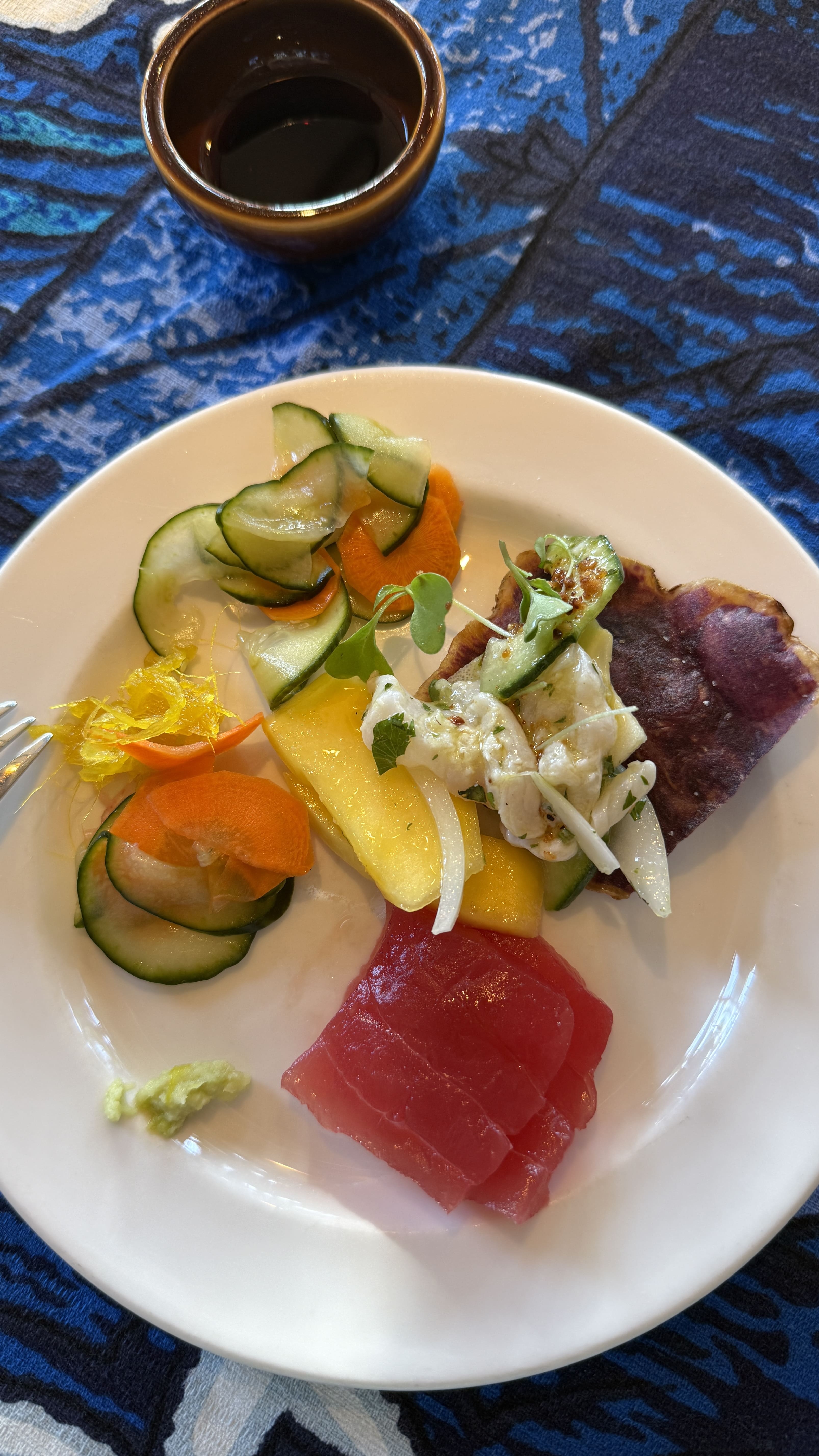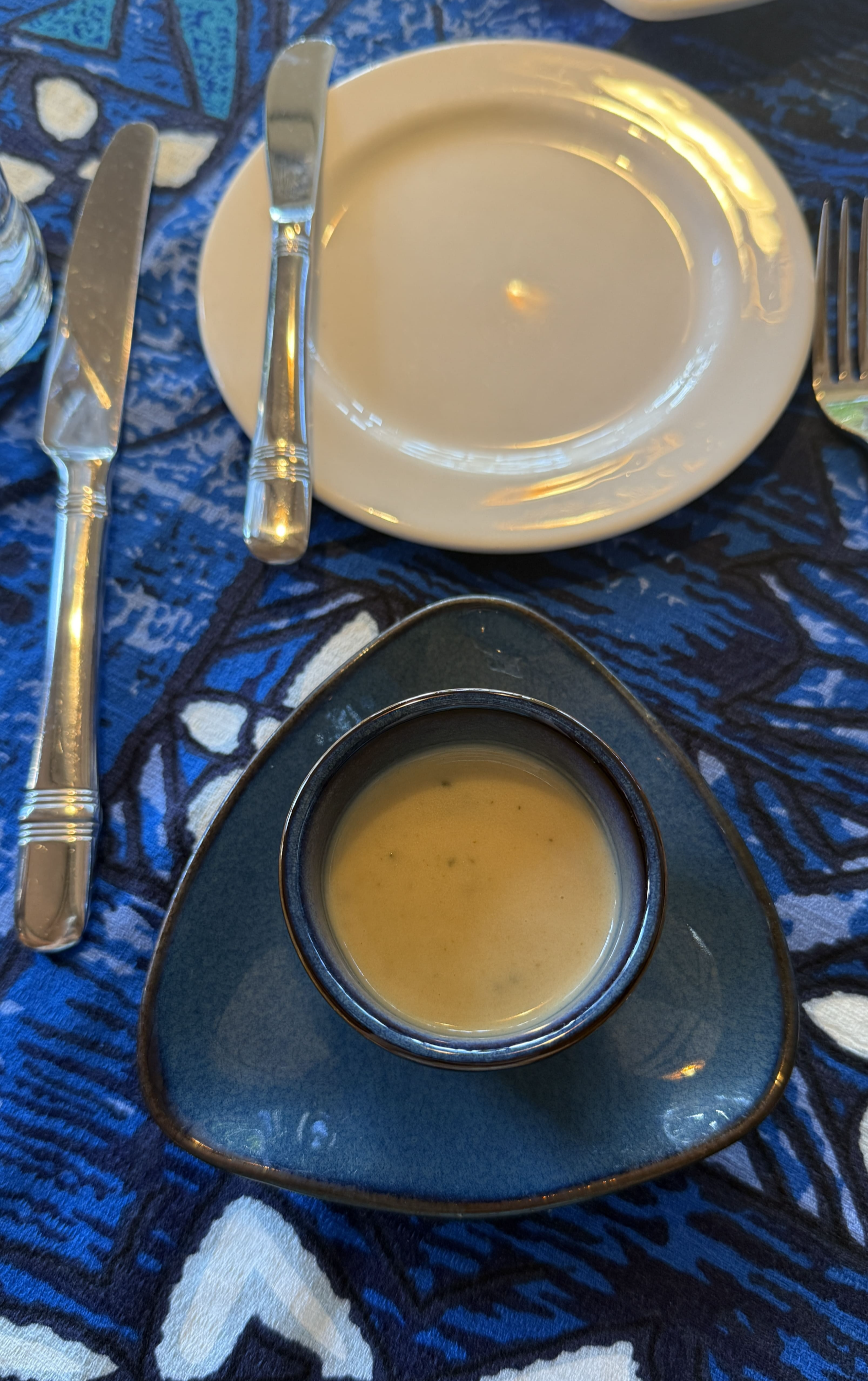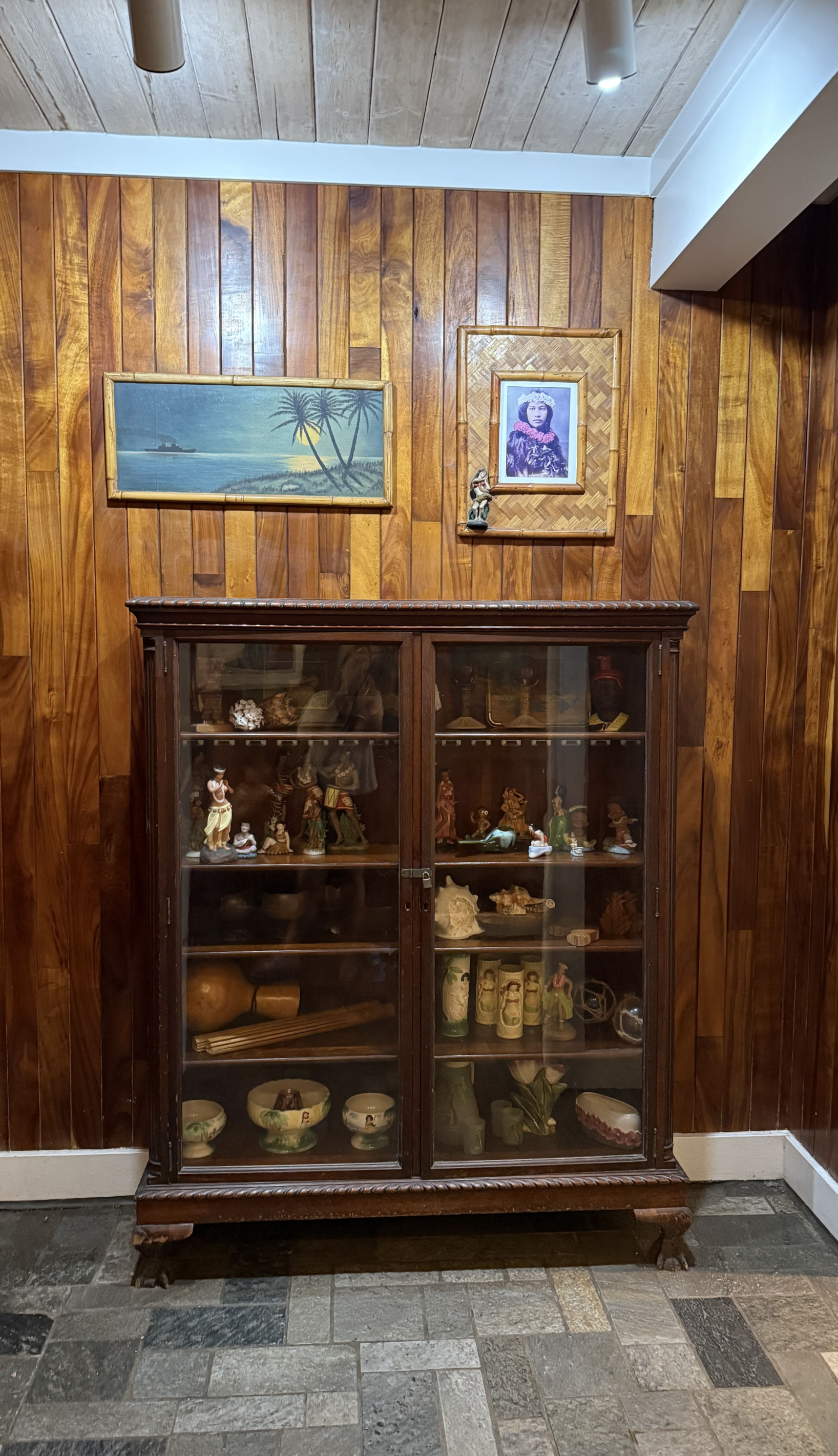 입구부터 이국적인 분위기가 물씬 풍겨 마치 다른 세상으로 들어가는 기분이었어요. 식당 내부는 하와이 전통 양식으로 꾸며져 있었고, 테이블마다 독특한 무늬의 테이블보가 깔려 있어 사진 찍기에도 좋았어요.