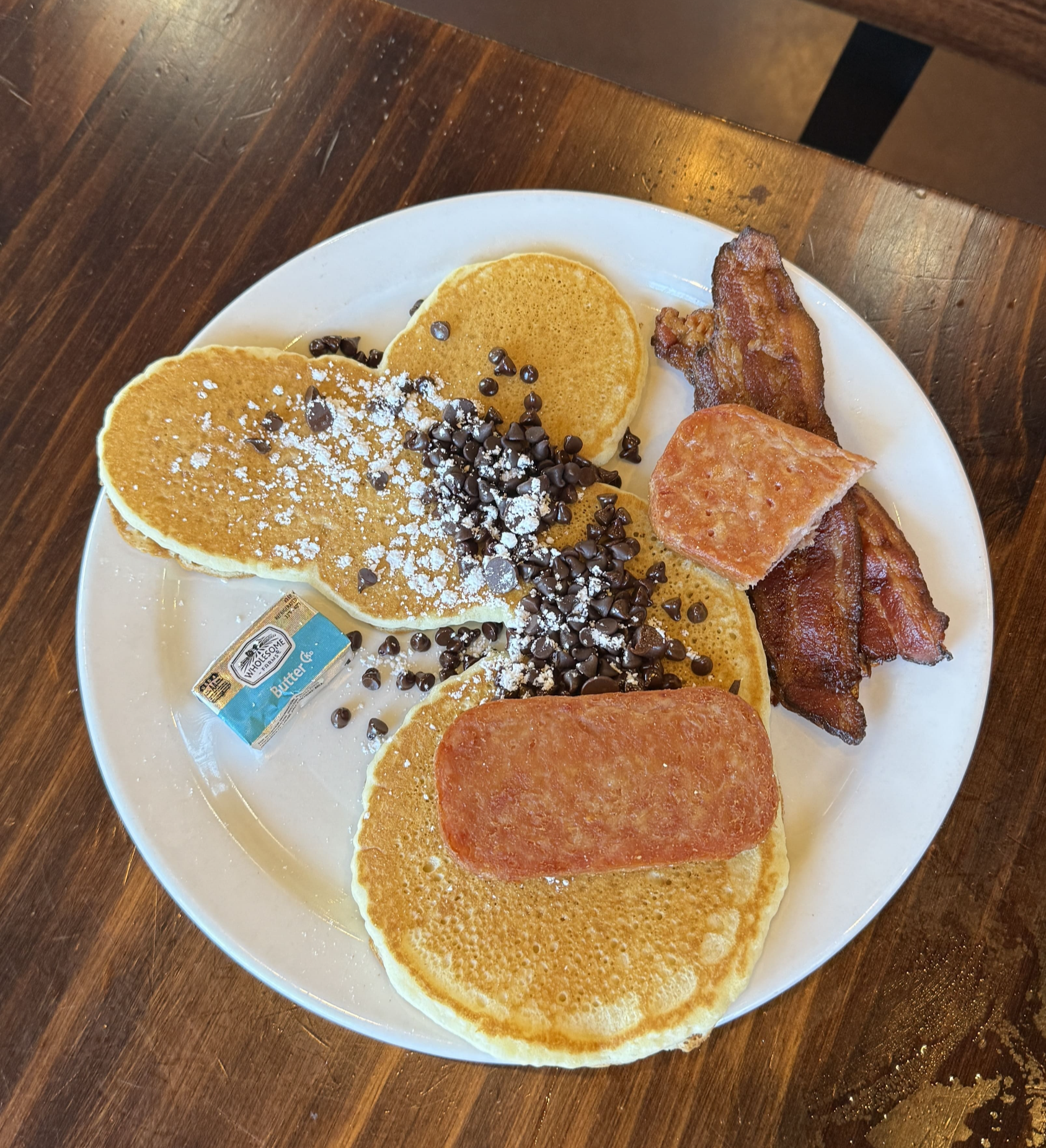 프라이드 라이스는 밥 위에 스크램블 에그가 듬뿍 올라가 있었는데, 양이 정말 푸짐해서 든든한 한 끼 식사로 완벽했습니다. 팬케이크 위에는 초코칩과 함께 베이컨과 스팸(따로 주문)이 올라가 있었는데, 짭짤한 스팸과 달콤한 팬케이크의 조합이 생각보다 잘 어울렸어요!