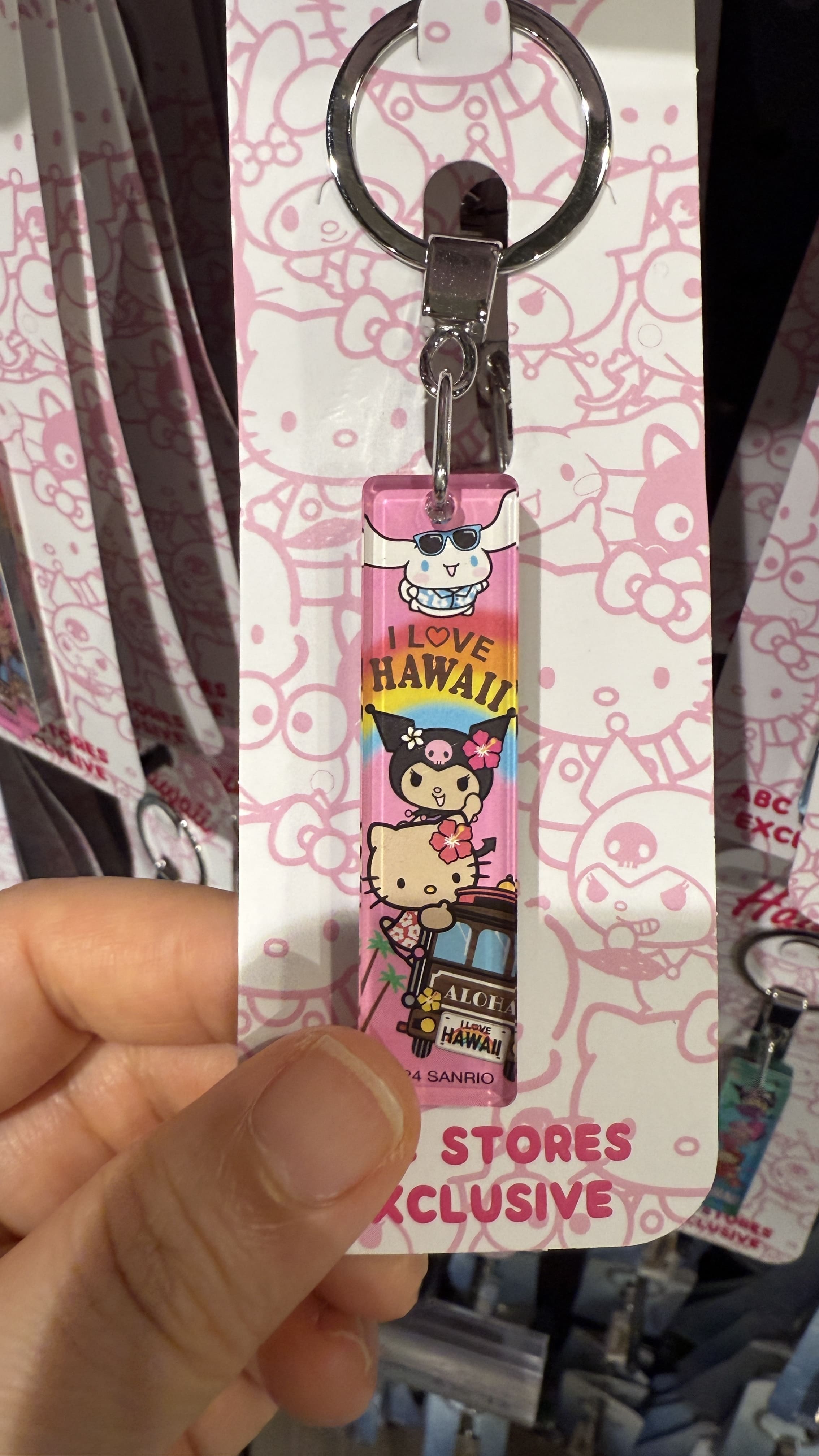 헬로 키티는 훌라 스커트를 입고 히비스커스를 단 모습으로, 쿠로미는 선글라스를 끼고 여유로운 휴양객처럼 변신해 있었어요. 그중에서도 'I LOVE HAWAII' 레터링이 들어간 핑크색 키링은 ABC 스토어에서만 구할 수 있는 한정판이라 꼭 하나쯤 챙기고 싶었습니다. 키링은 패스했습니다. ㅎㅎ