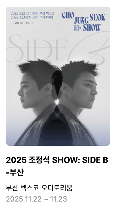 - 포인트: 부산 팬들을 위한 특별 무대. 넓은 공연장에서 몰입감 있는 조정석의 라이브를 즐길 수 있습니다.
