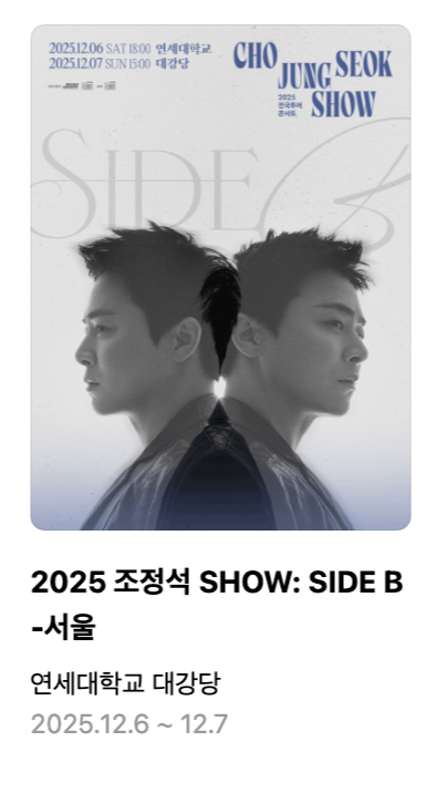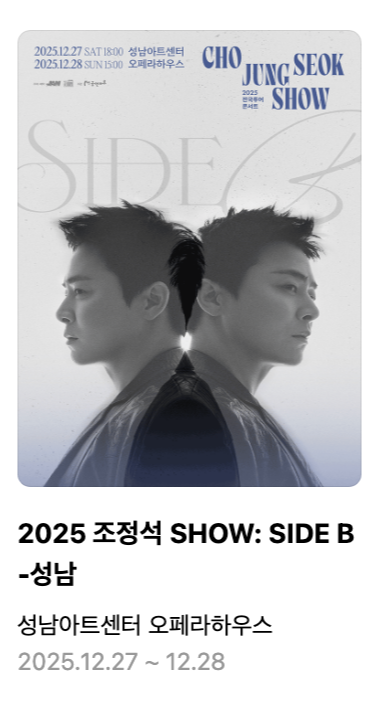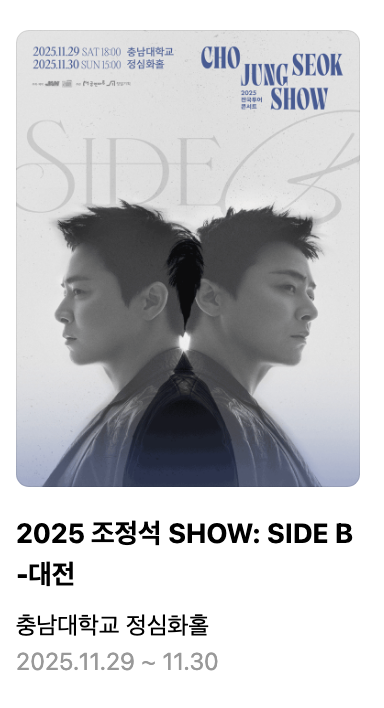 2025년, 배우 겸 가수 조정석의 단독 콘서트 SHOW, SIDE B가 서울, 부산, 대전, 성남 등 전국 주요 도시에서 열립니다. 따뜻한 감성과 에너지 넘치는 라이브 무대를 함께 즐길 수 있는 특별한 기회! 팬이라면 놓치기 아까운 일정들을 정리했습니다.