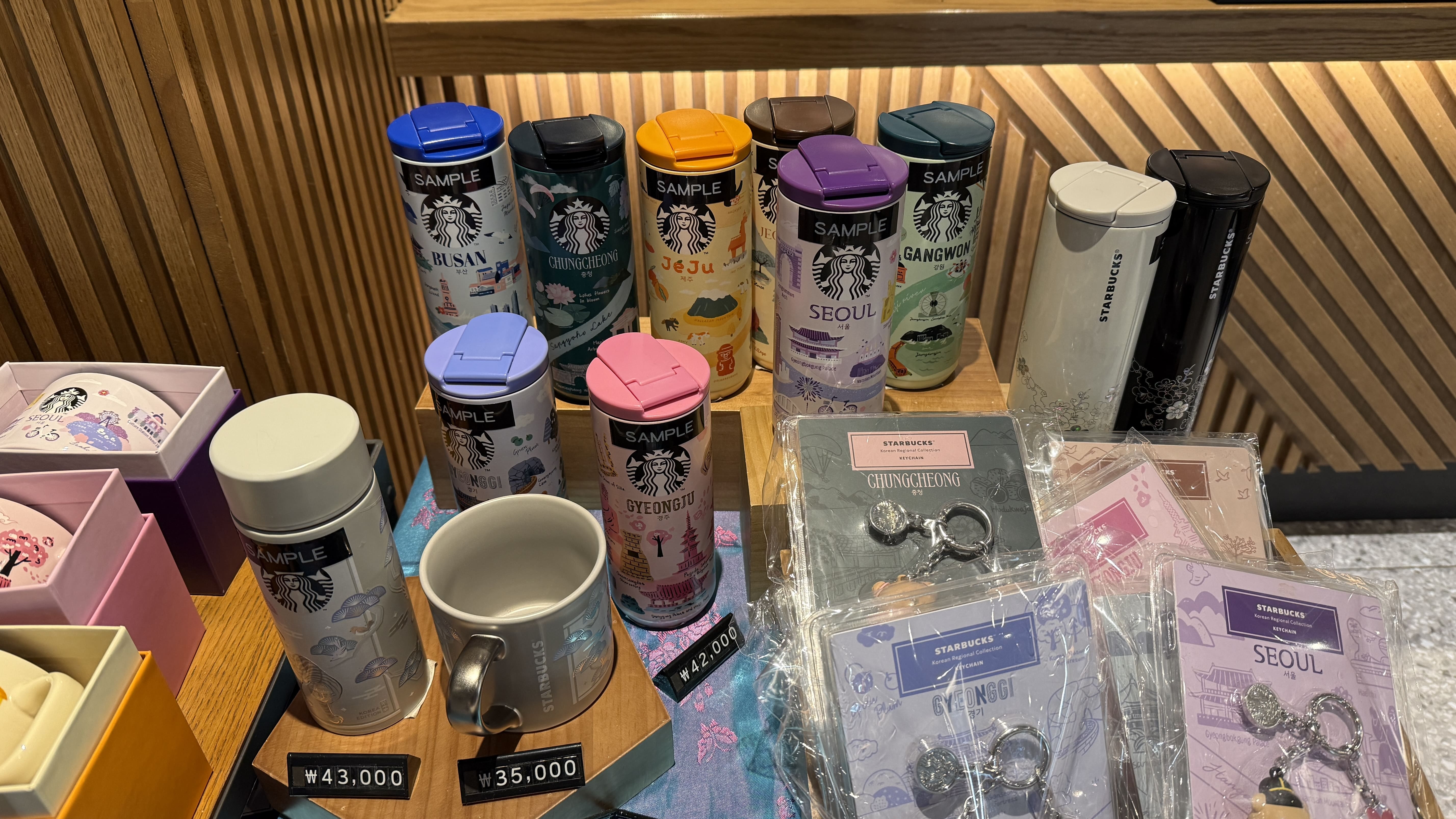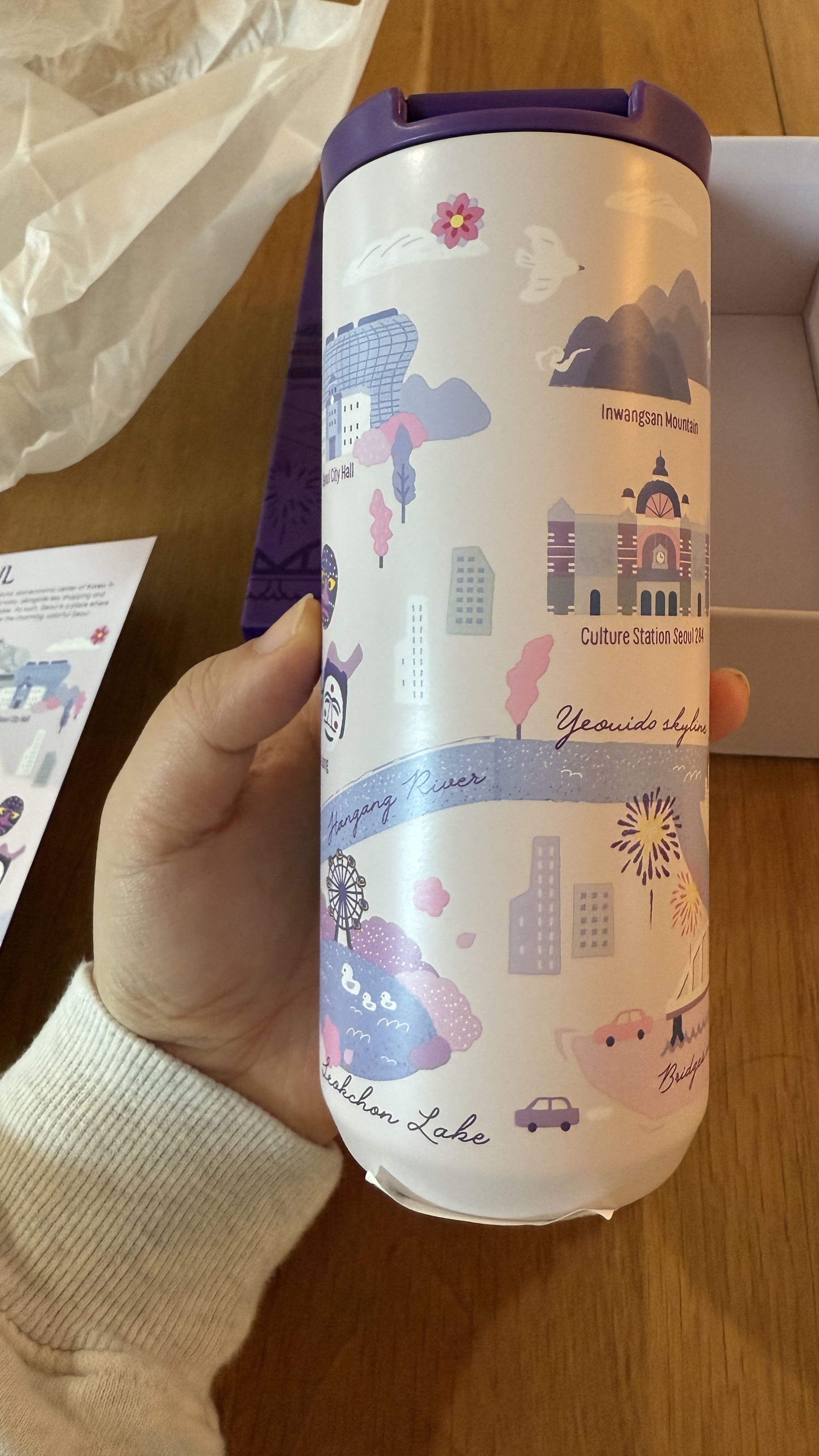 이번 봄 한정으로 출시된 Regional Collection – 안녕 시리즈는 이름 그대로 ‘각 지역에 인사하는 마음’을 담은 디자인입니다. 한국의 대표적인 8개 도시와 지역을 선정해, 그 지역만의 정서를 한 컵 안에 담아낸 것이 특징이에요. 전반적으로 부드러운 파스텔컬러가 중심이며, 봄의 따뜻한 분위기와도 찰떡같이 어울리는 감성을 담고 있었습니다. 컵을 하나씩 보면, 그 지역을 여행했던 기억이 떠오르기도 하고, 아직 가보지 못한 곳에 대한 로망도 자극되더라고요. 컬렉션을 구성하는 머그컵과 텀블러는 각기 다른 사이즈로 출시되었고, 소재나 무게감도 꽤 고급스럽게 느껴졌습니다. 무엇보다 컵에 담긴 일러스트들이 그 지역의 대표적인 풍경과 상징물을 아기자기한 그림체로 표현하고 있어서, 감상하는 재미도 있었습니다.