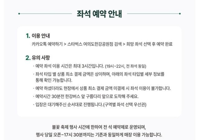 스타벅스 코리아는 불꽃축제 기간 동안 여의도 한강공원점에서 특별 좌석 예약제를 도입했습니다. 예약은 카카오톡 채널을 통해 진행됐으며, 선착순으로 원하는 좌석을 선택할 수 있었는데요.
