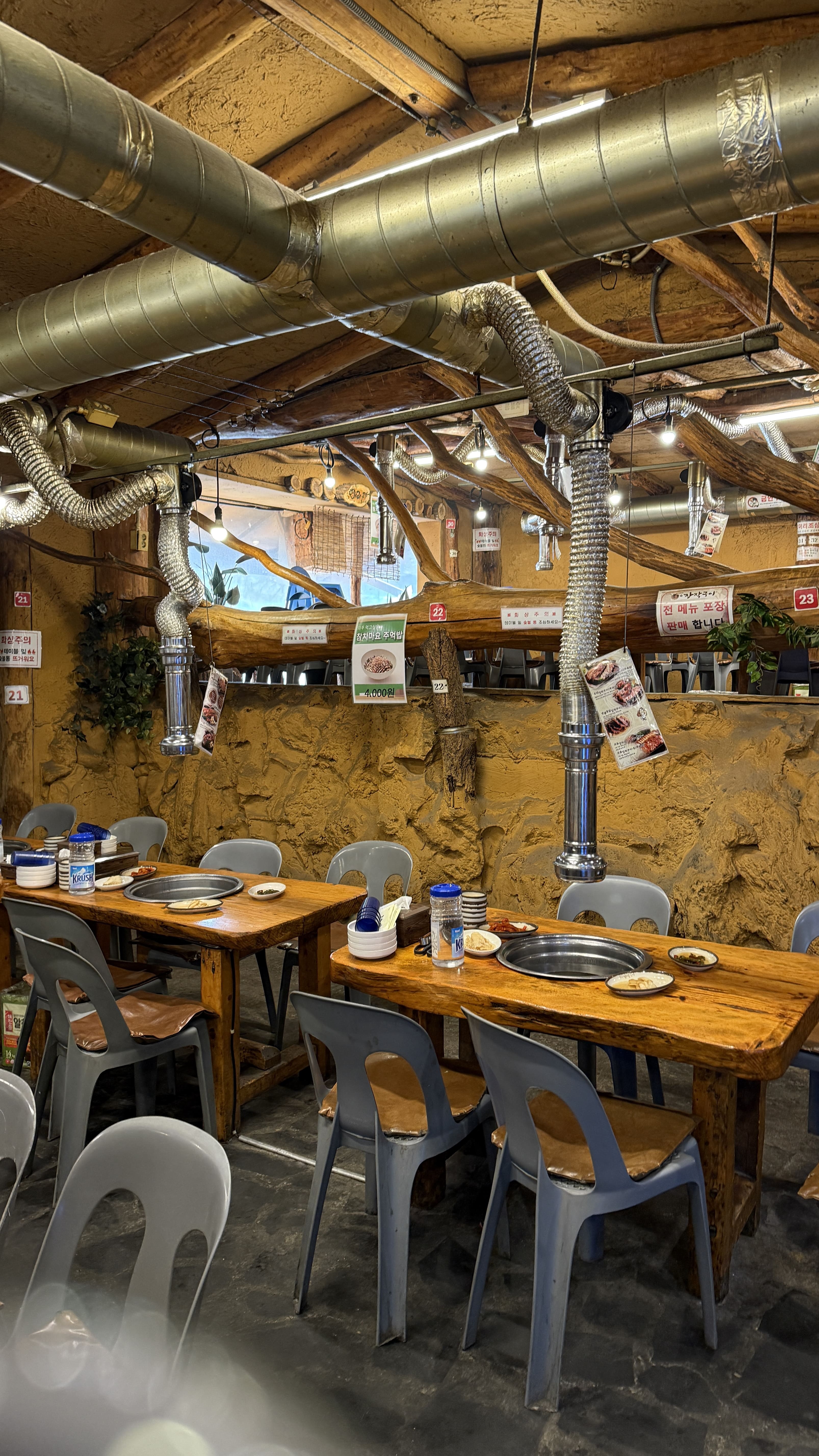 외관은 전통적인 한옥 느낌과 통나무 인테리어가 어우러져 따뜻하고 정겨운 분위기를 주고, 내부는 테이블마다 연통이 설치되어 있어 쾌적하게 식사할 수 있었습니다. 넓은 홀이 있어 단체 손님도 문제없고, 가족 단위로 방문하기에도 적합했습니다.