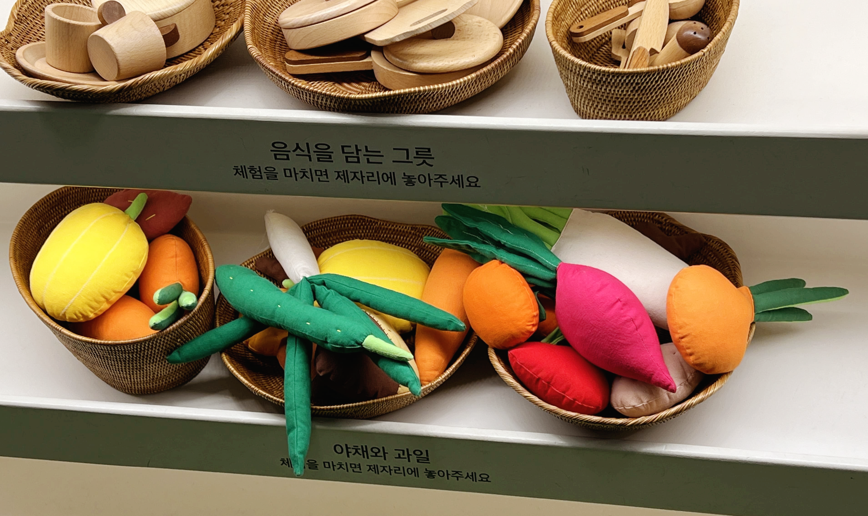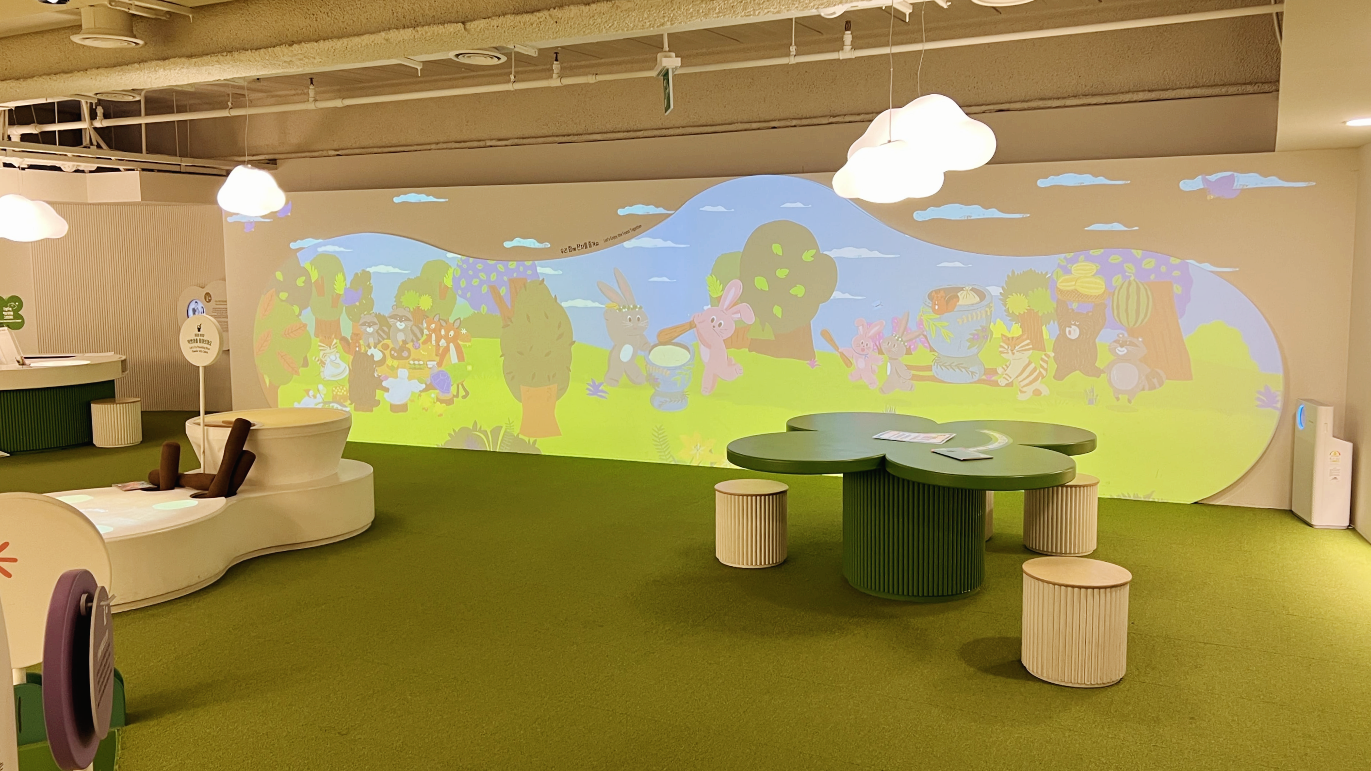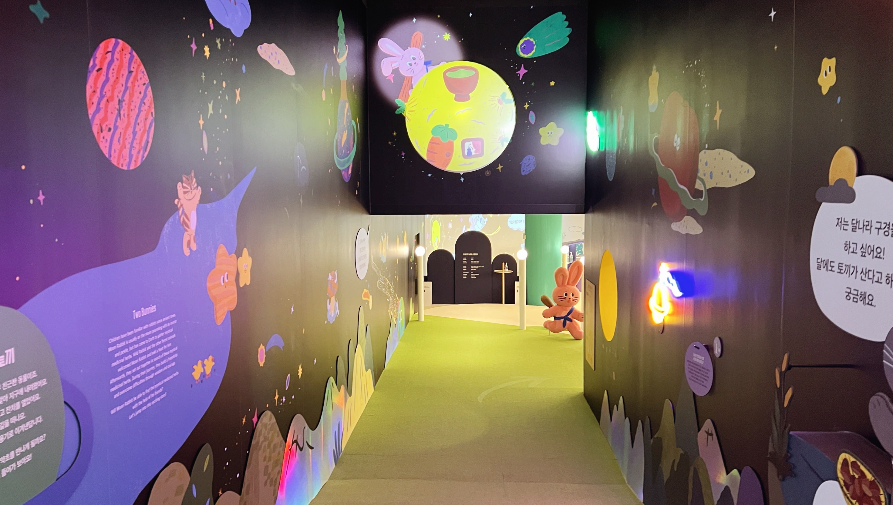 전시장 입구부터 달나라의 우주 풍경이 펼쳐지고, 초록 잔디길을 따라 들어가면 달토끼가 반갑게 맞이해 줍니다. 아이들은 동화 속 주인공이 된 듯한 기분으로 이곳저곳을 자유롭게 뛰어다니고, 화면을 터치하며 달토끼의 그릇 그림을 맞히는 인터랙티브 체험도 할 수 있답니다.