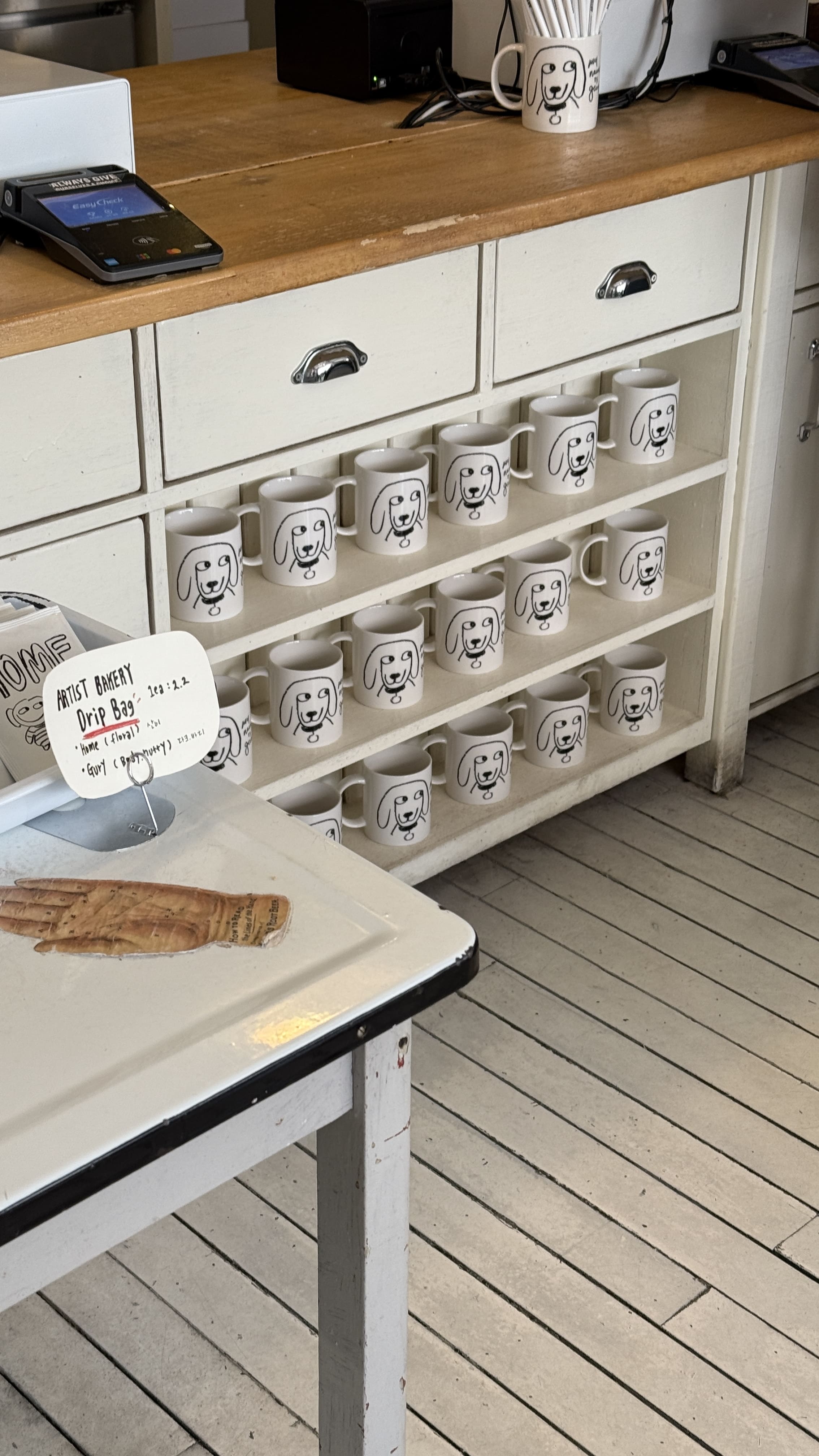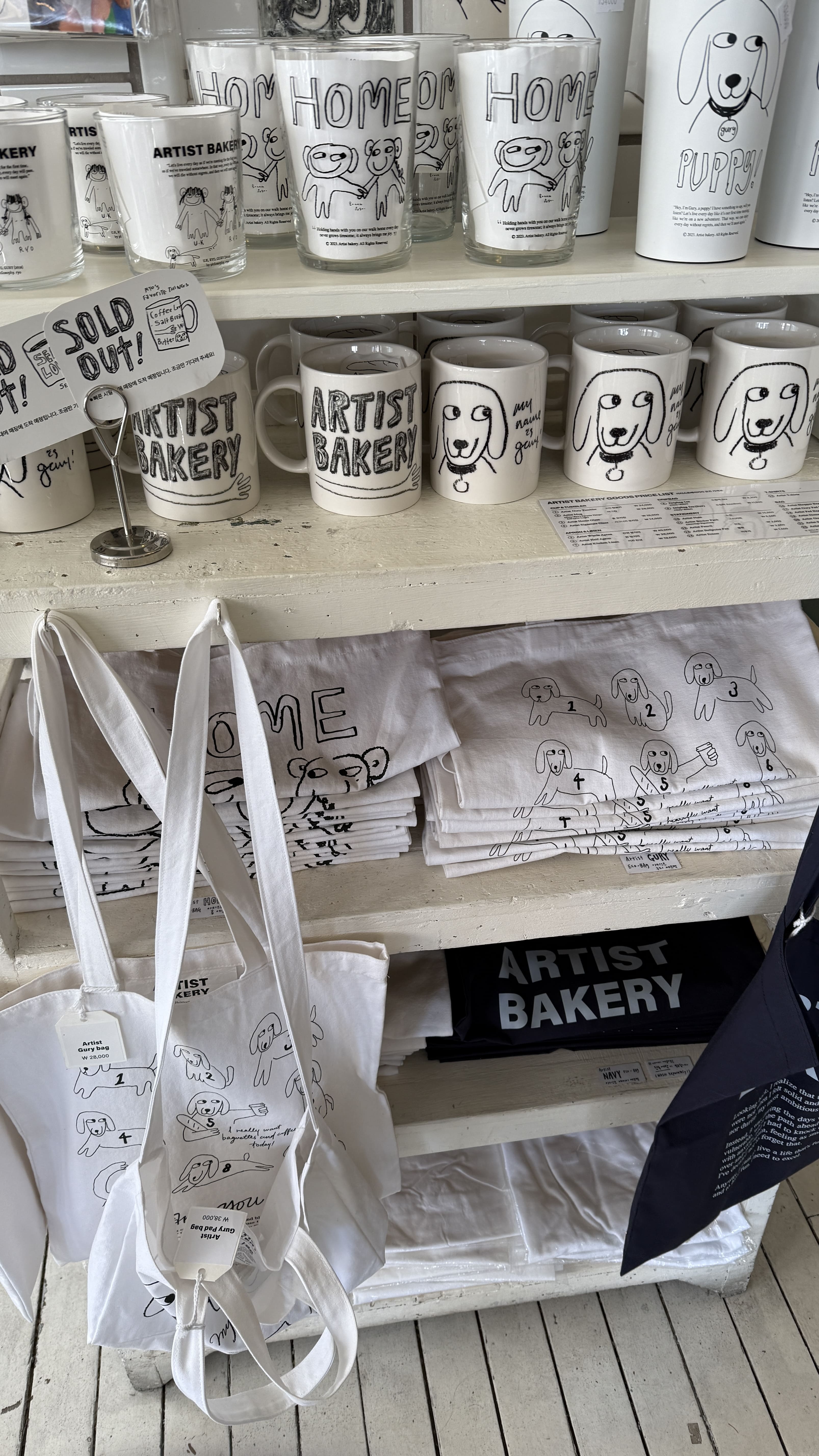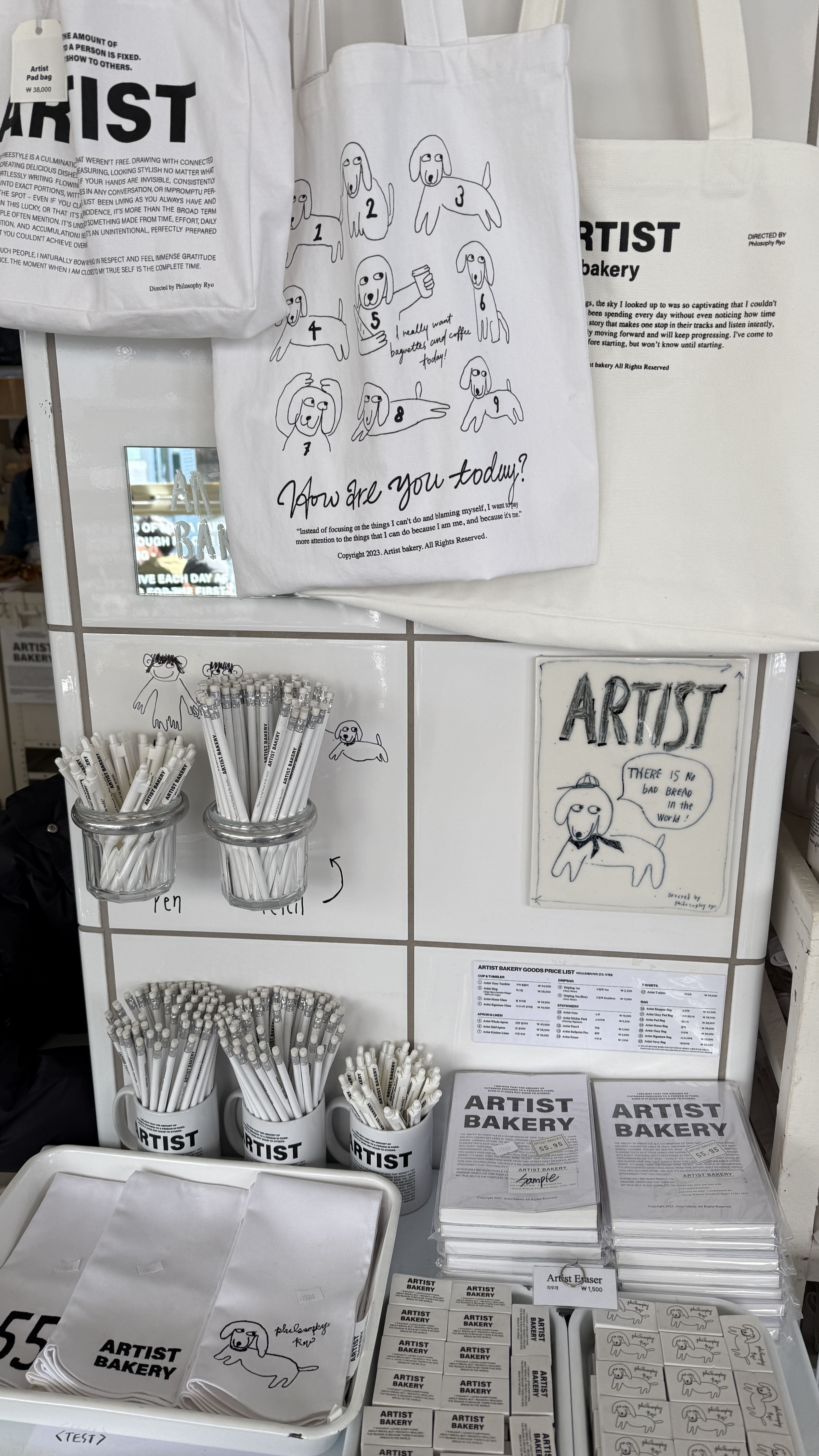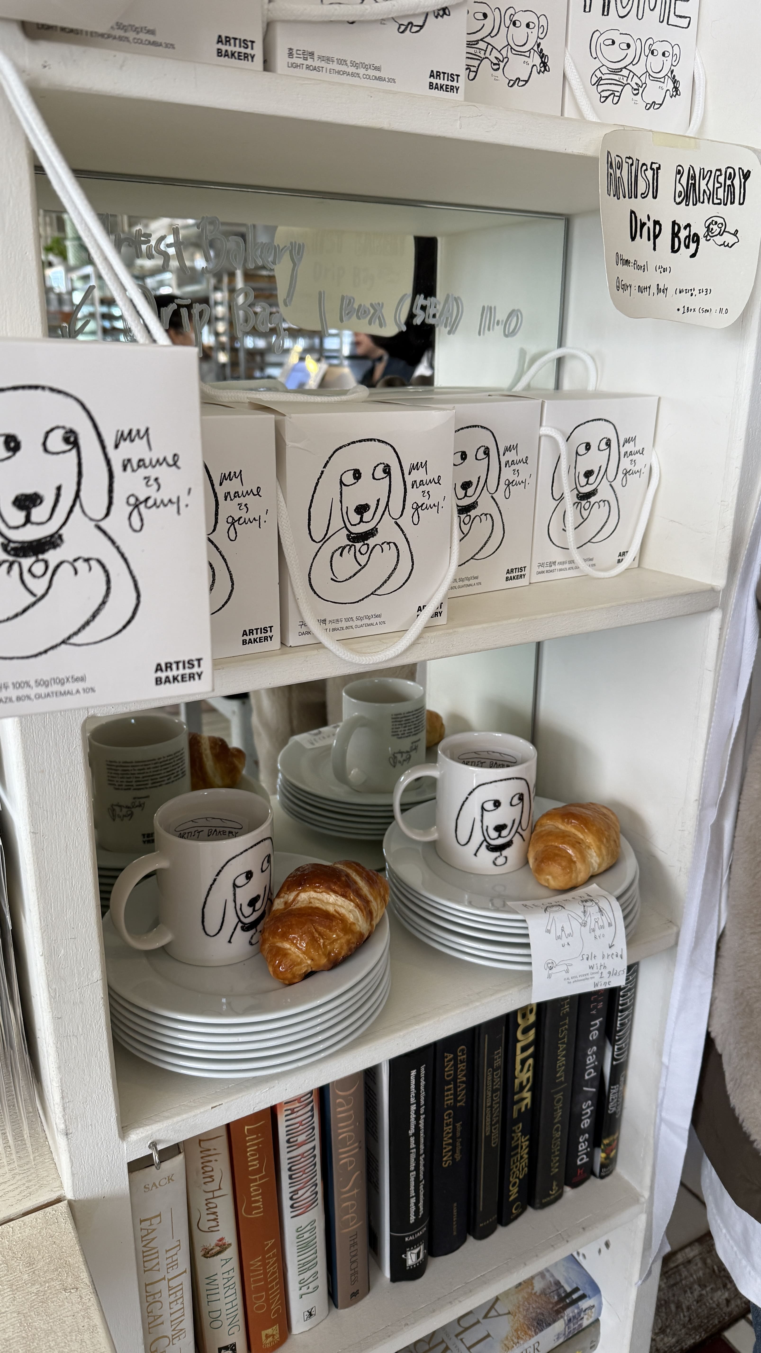 매장 한쪽에는 감성적인 일러스트가 담긴 머그컵, 텀블러, 에코백, 티셔츠 등 굿즈도 다양하게 판매되고 있었어요. 특히 강아지 캐릭터가 그려진 굿즈는 이미 몇 가지는 ‘Sold Out’ 되어 있을 정도로 인기였습니다. 감성 굿즈를 좋아하시는 분이라면 꼭 구경해 보세요!