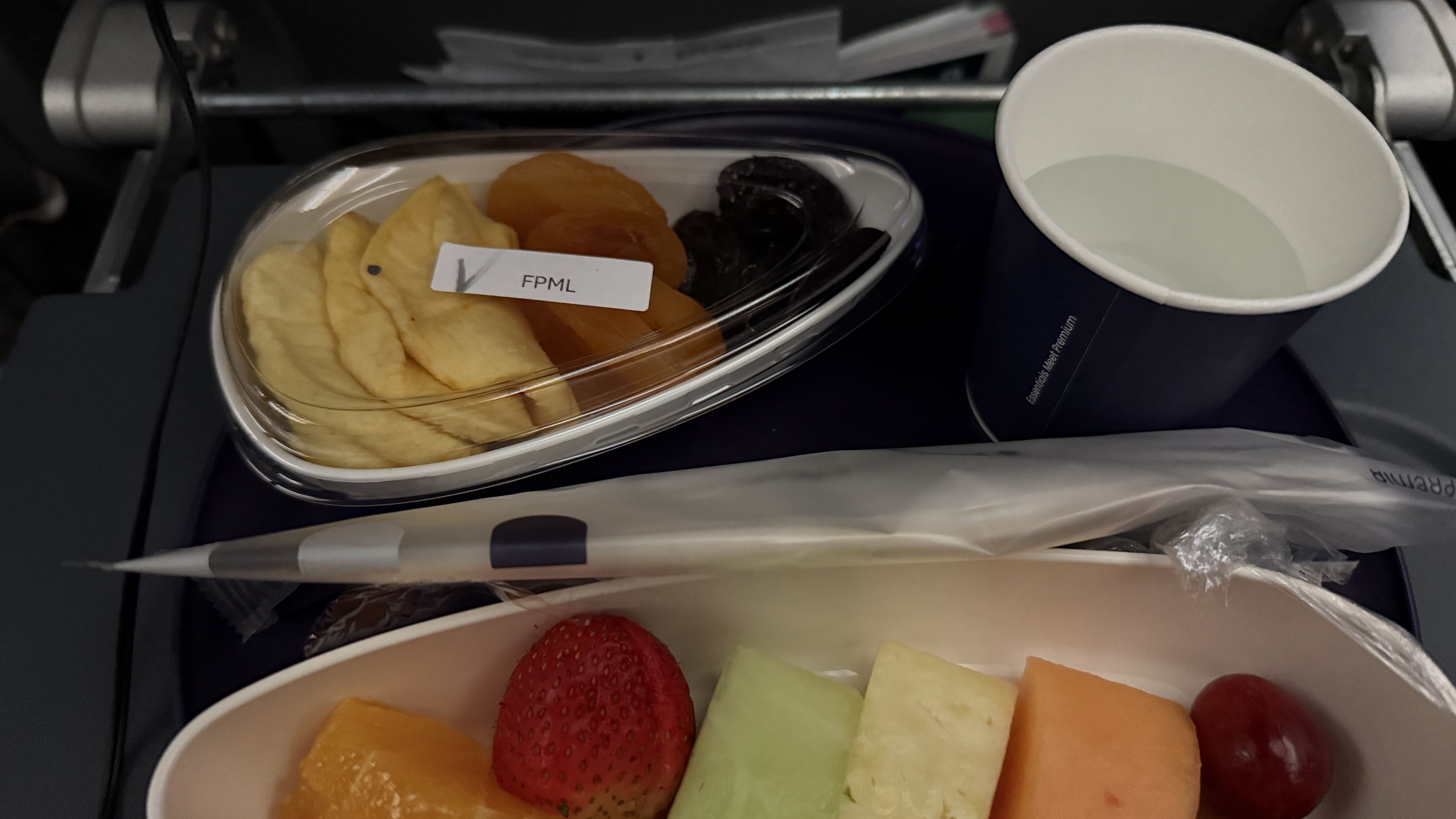 제가 선택한 건 과일식(FPML, Fruit Platter Meal)이었고, 총 2회에 걸쳐 기내식을 받았습니다. 한국행은 항상 너무 깁니다. 각각의 트레이에 다양한 과일들이 정갈하게 담겨 있었는데요. 비닐로 위생 포장이 잘 되어 있었고, 함께 물과 기본 커트러리 세트도 제공되었습니다.