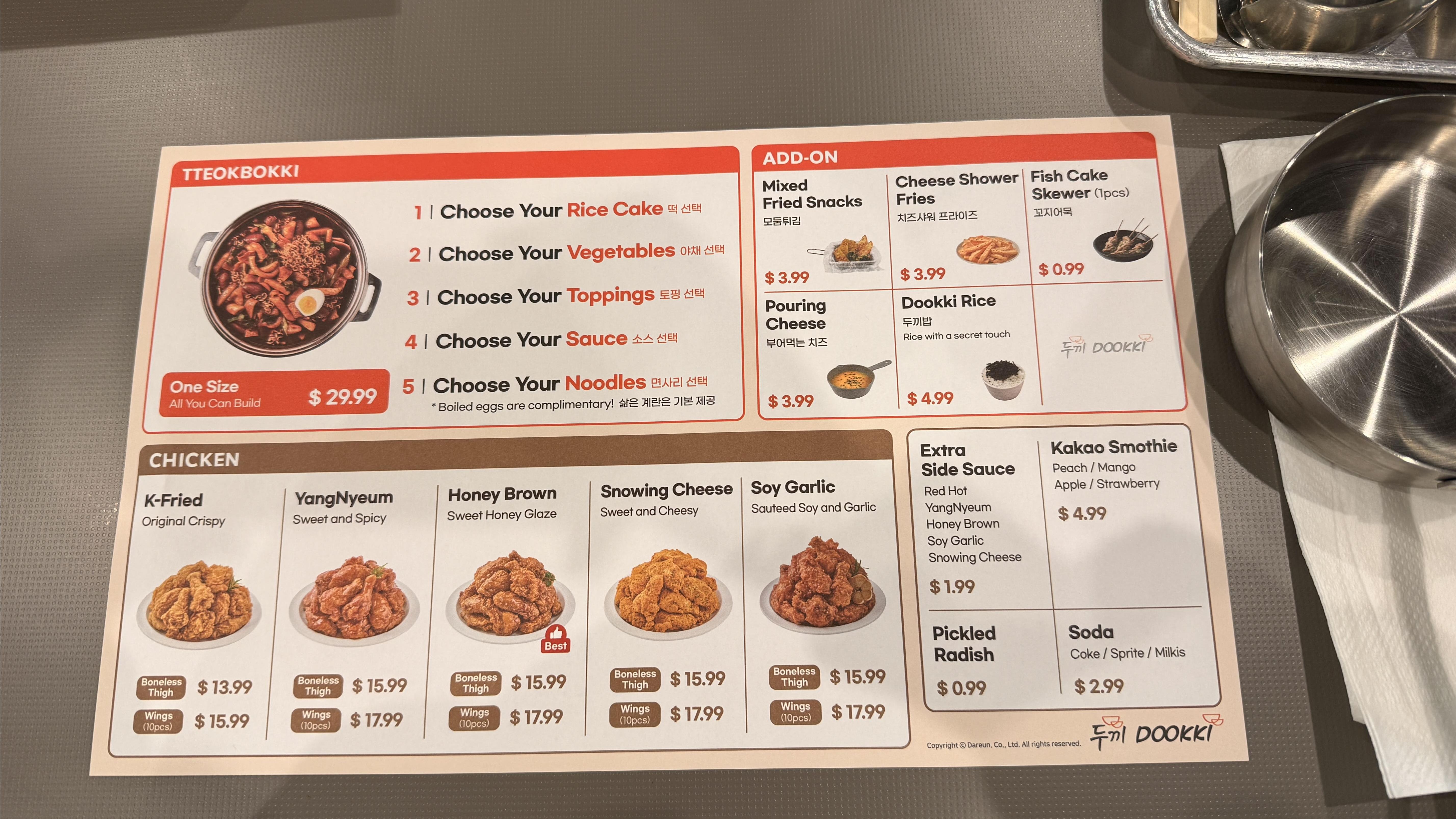 한국에서도 대형 쇼핑몰마다 있는 두끼(Dookki)가 드디어 오씨 지역에서도 인기를 끌고 있습니다. 이곳의 가장 큰 매력은 바로 ‘내 맘대로 떡볶이’. 떡, 야채, 토핑, 소스, 면을 자유롭게 조합해 나만의 떡볶이를 만들 수 있는 시스템으로, 한국은 뷔페형으로 다양한 재료를 무제한 즐길 수 있다면, 미국은 원하는 토핑을 말하면, 다 넣어서 끓여서 나오는 시스템이라 조금 다르더라구요.