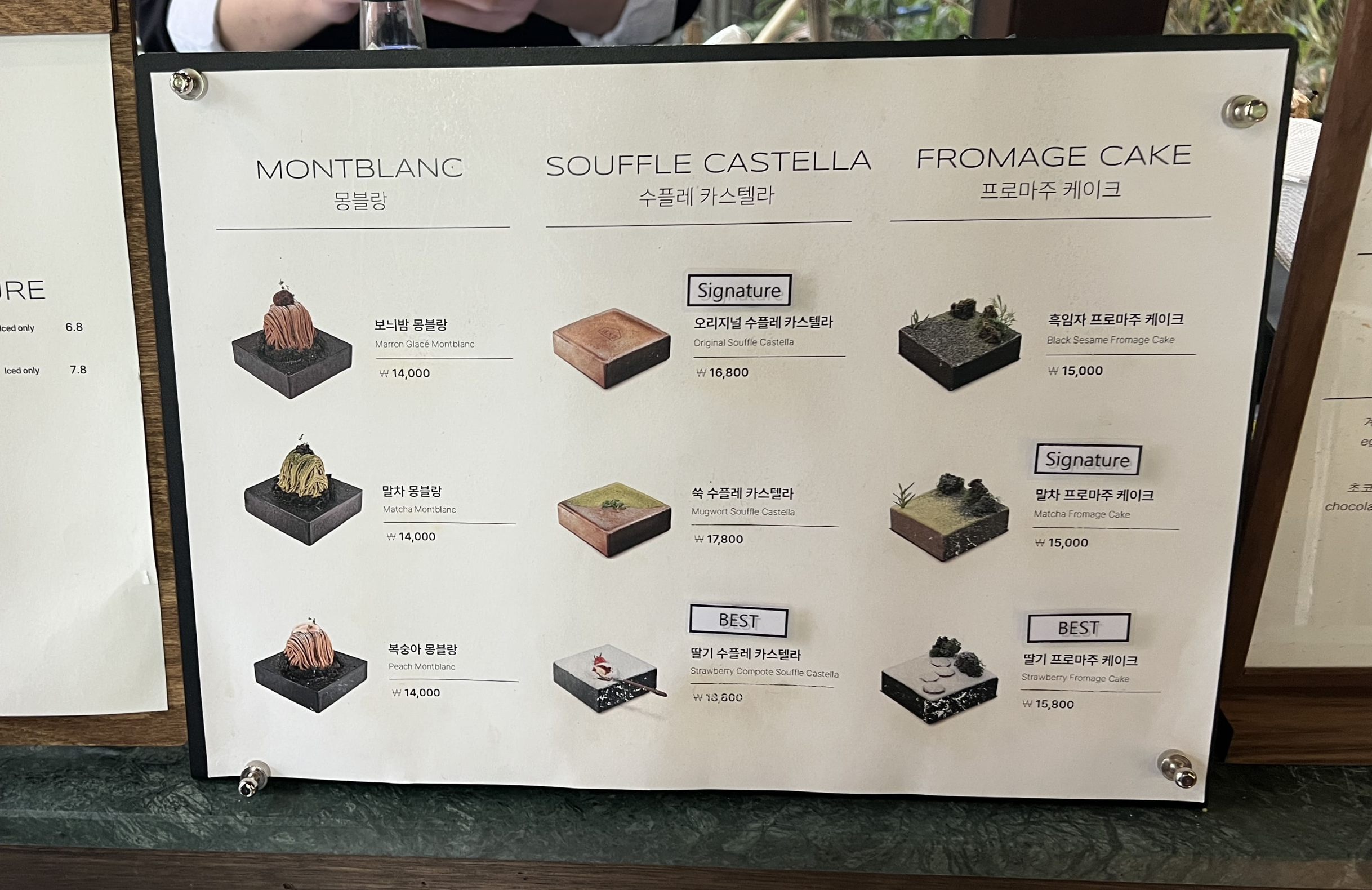 ✅ 시그니처: 말차 몽블랑 (14,000원) , 수플레 카스텔라 (16,800원), 스톤 드립 커피 (6,800원)
