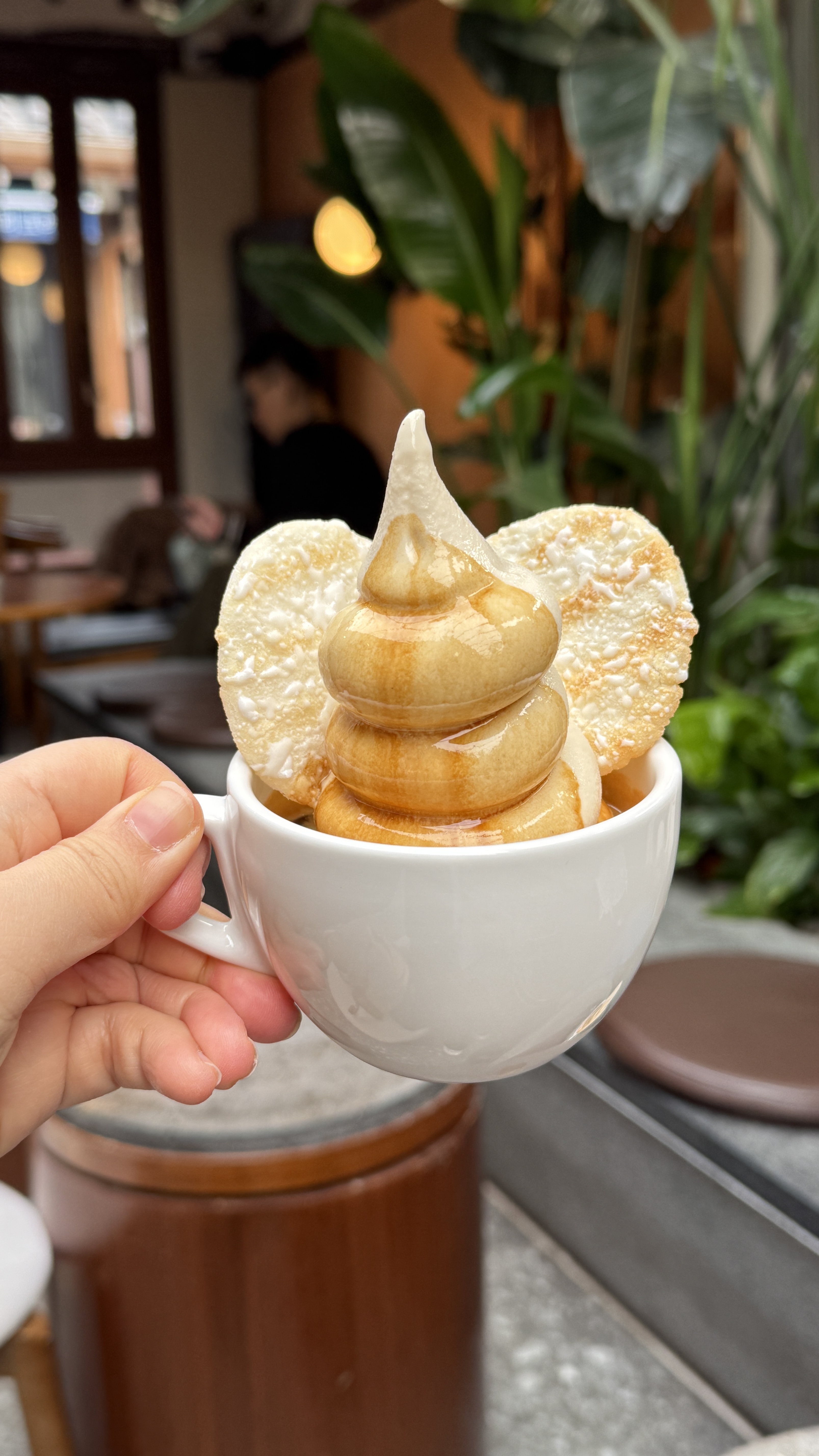 한옥을 개조한 따뜻한 분위기의 카페 ‘서울커피’. 커피잔에 소프트 아이스크림처럼 올라간 비주얼이 예술이죠! 직접 맛보면 진한 커피와 달콤한 크림의 조화가 입 안에서 퍼져요. 익선동 한참 걷다가 들어가서 마셨는데, 급 당 충전! ㅎㅎ