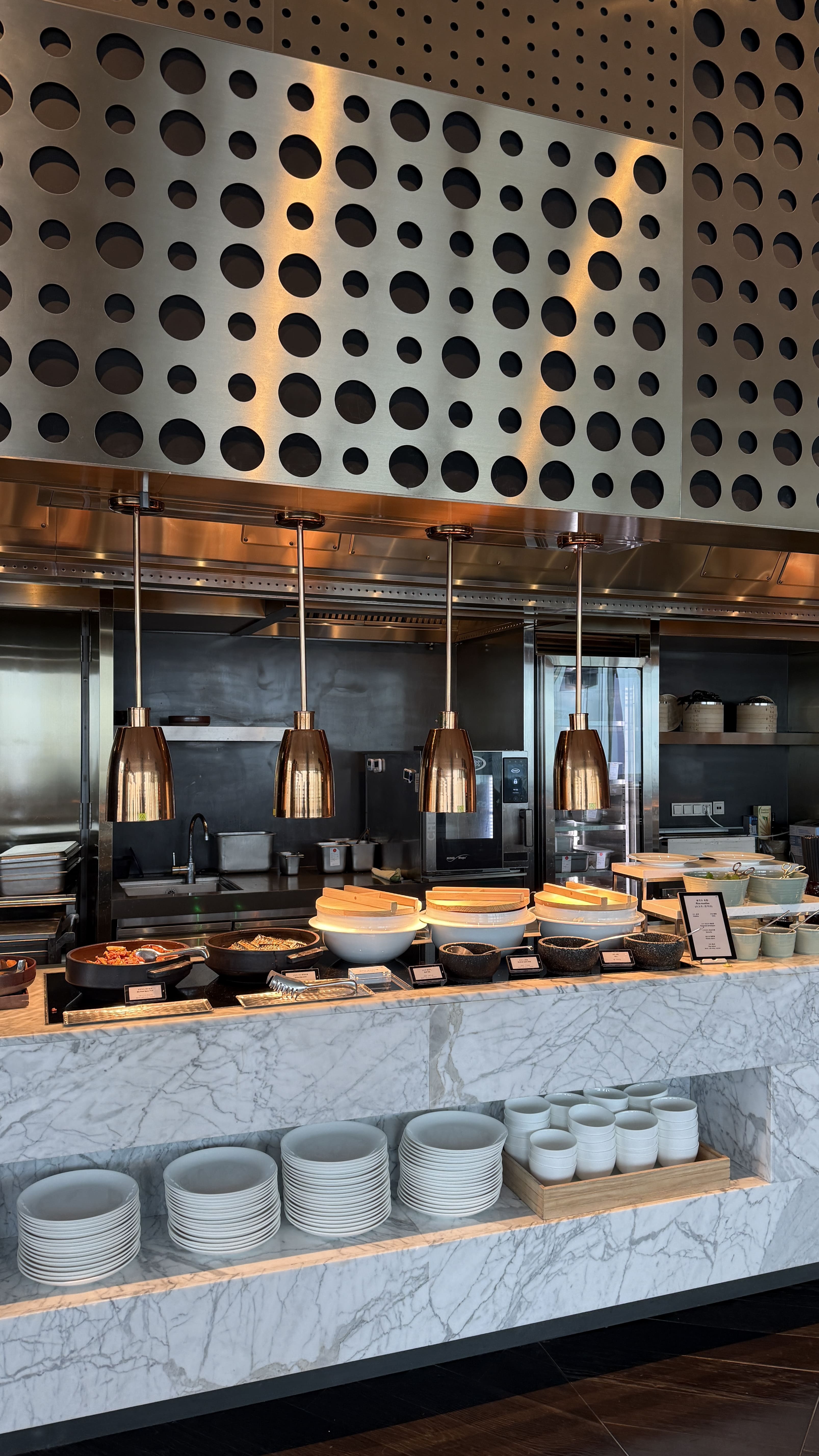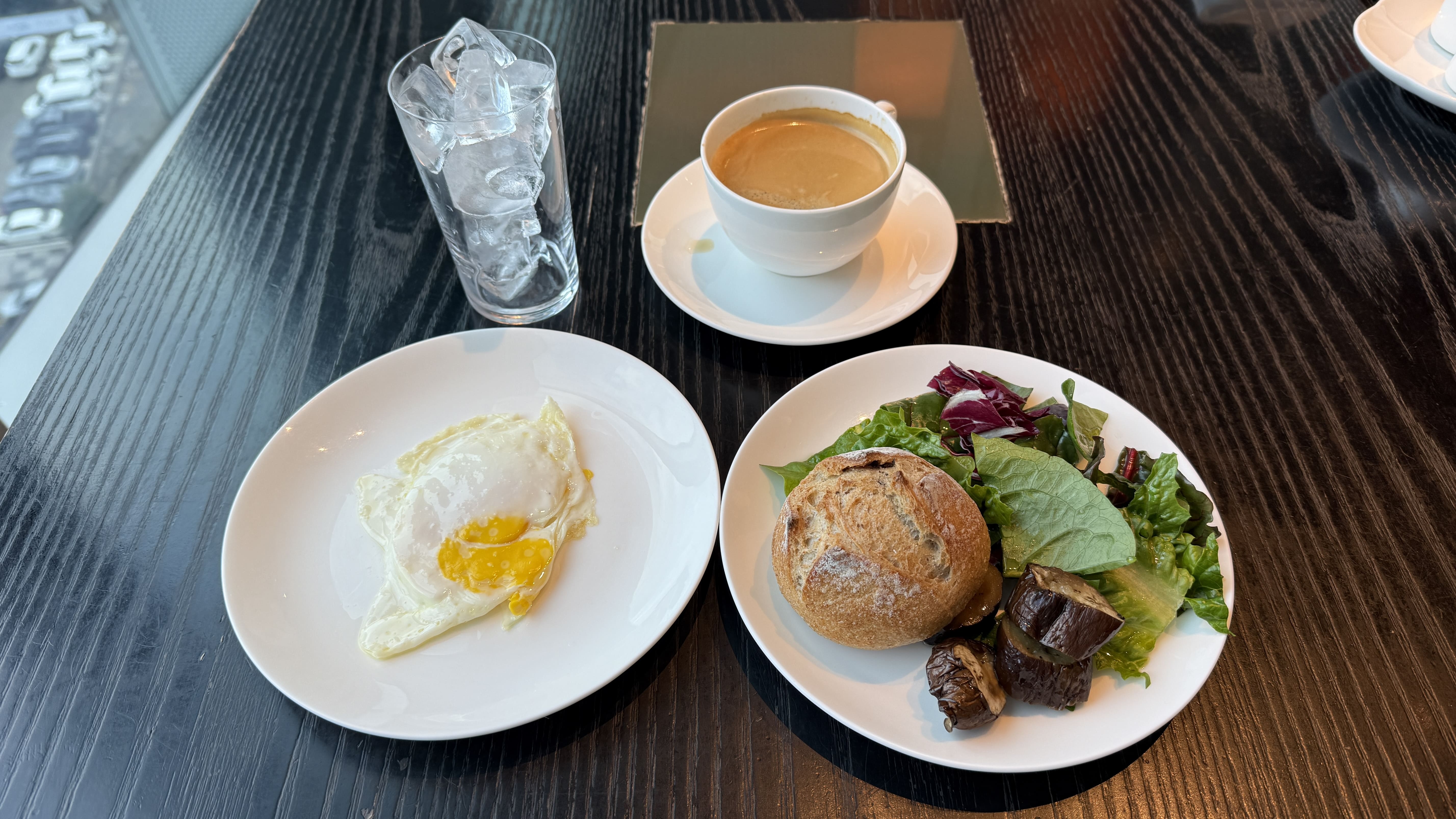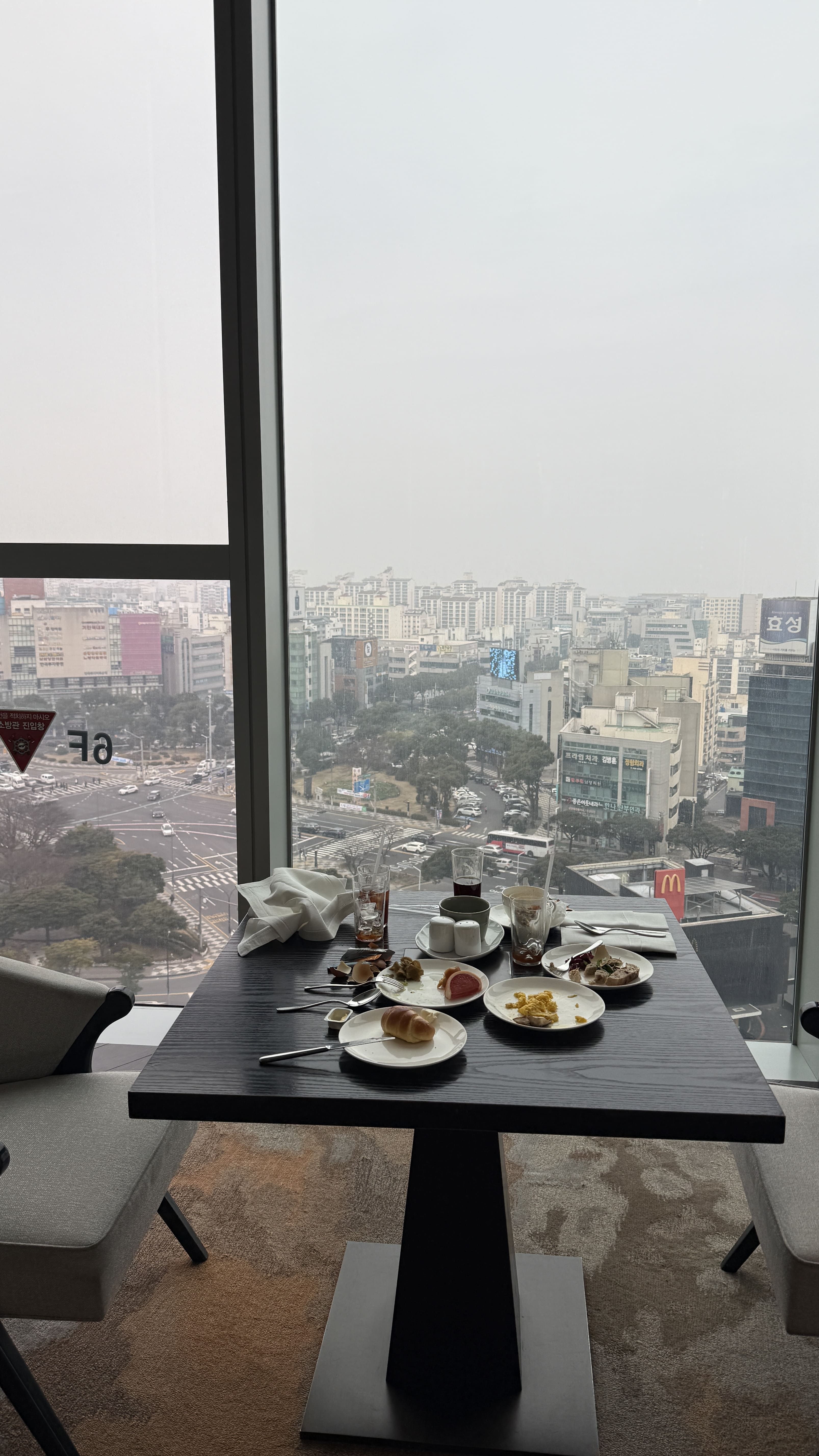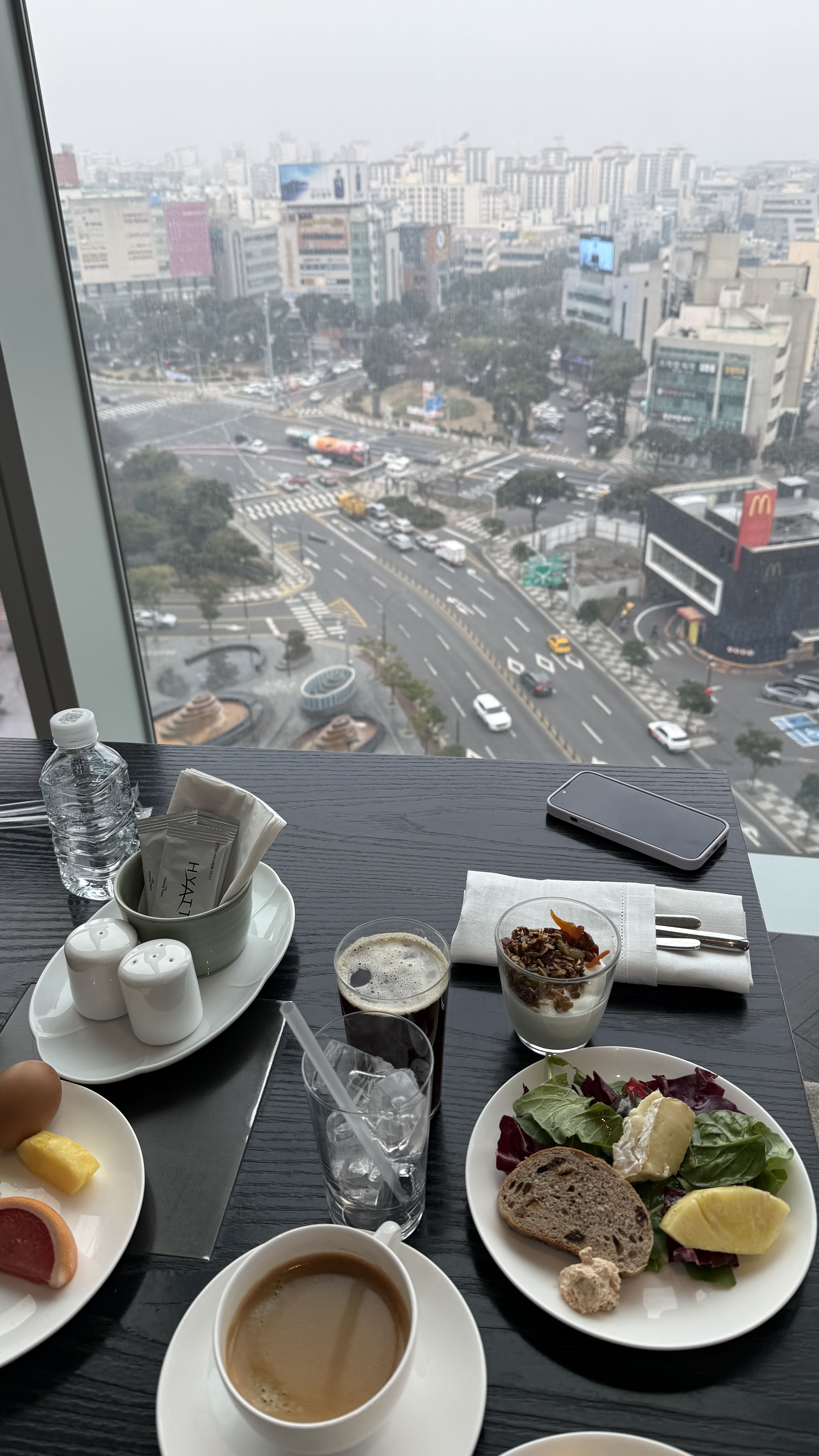 조식은 오전 6시 30분부터 11시까지 운영되며, 창가 자리에서 제주시 도심 뷰를 내려다보며 여유롭게 즐길 수 있었어요. 특히 계란 요리(스크램블, 프라이 등), 구운 버섯, 갓 구운 빵과 크로아상, 그리고 다양한 요거트와 그래놀라, 생과일(키위, 자몽, 파인애플)이 정갈하게 제공되어 하루를 가볍고 건강하게 시작할 수 있었답니다. 신선한 샐러드와 치즈, 견과류 토핑도 다양하게 준비돼 있었고, 에스프레소 머신으로 내린 커피 한 잔과 함께 조용히 아침 시간을 보내기에 딱이었습니다.