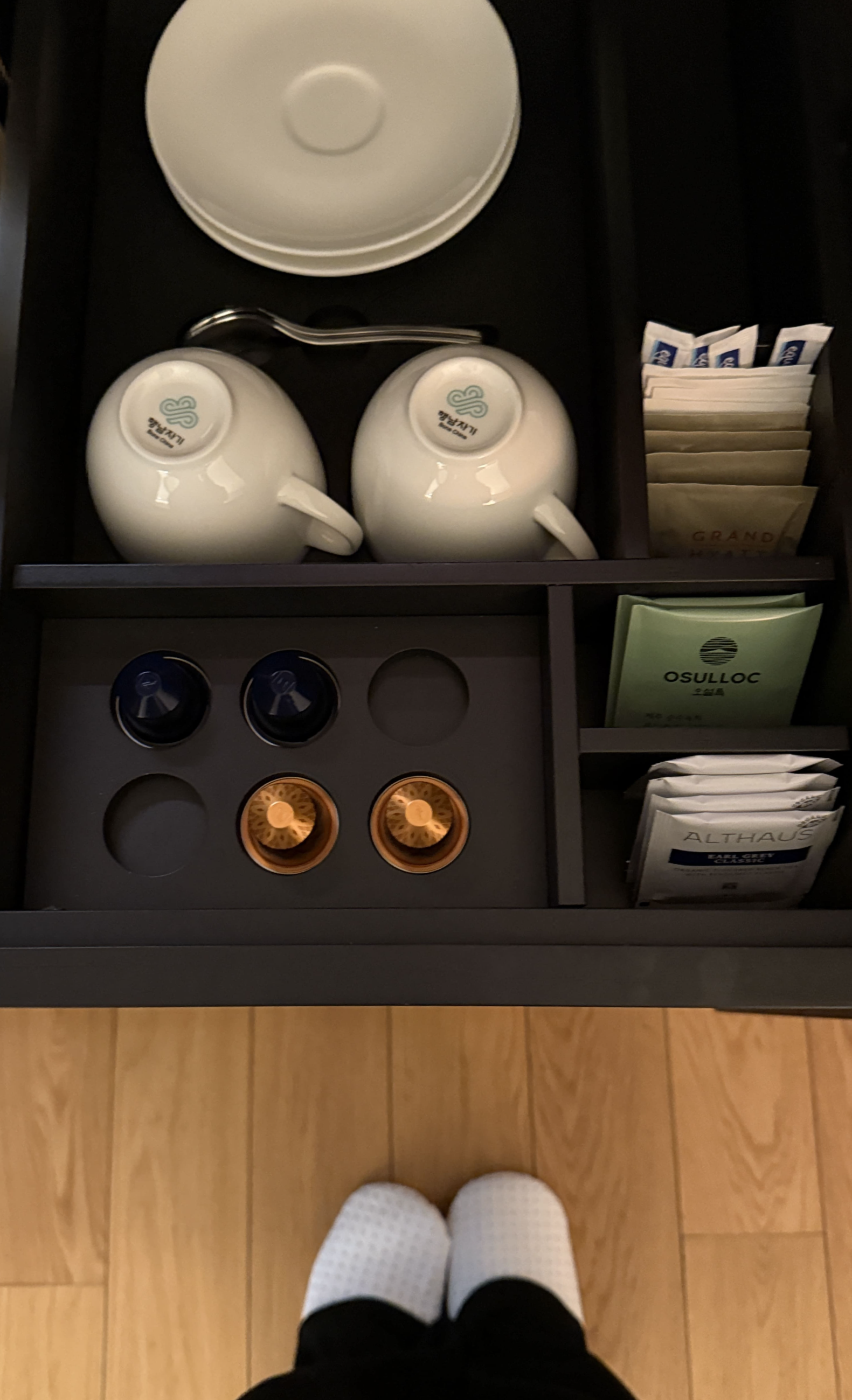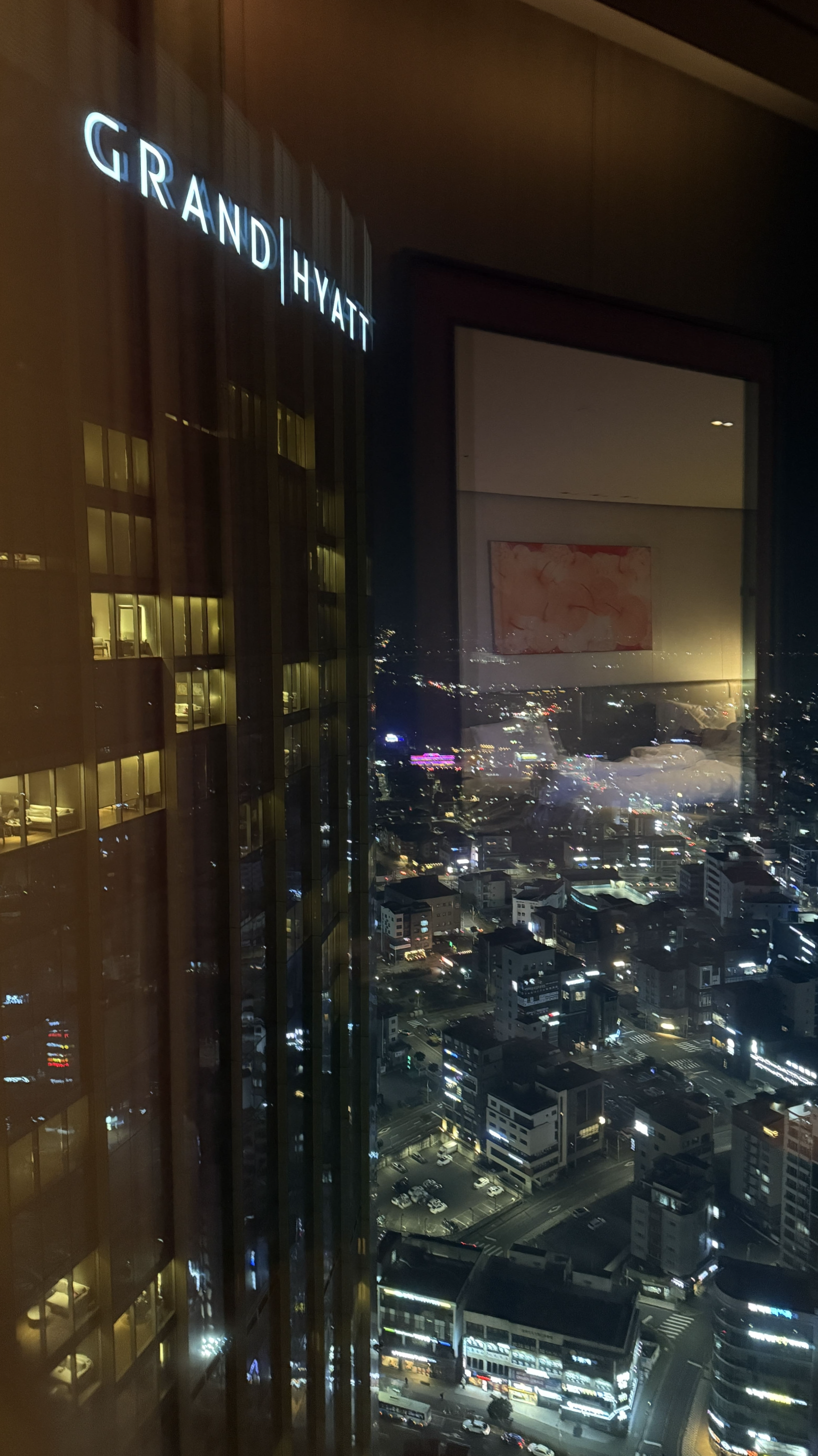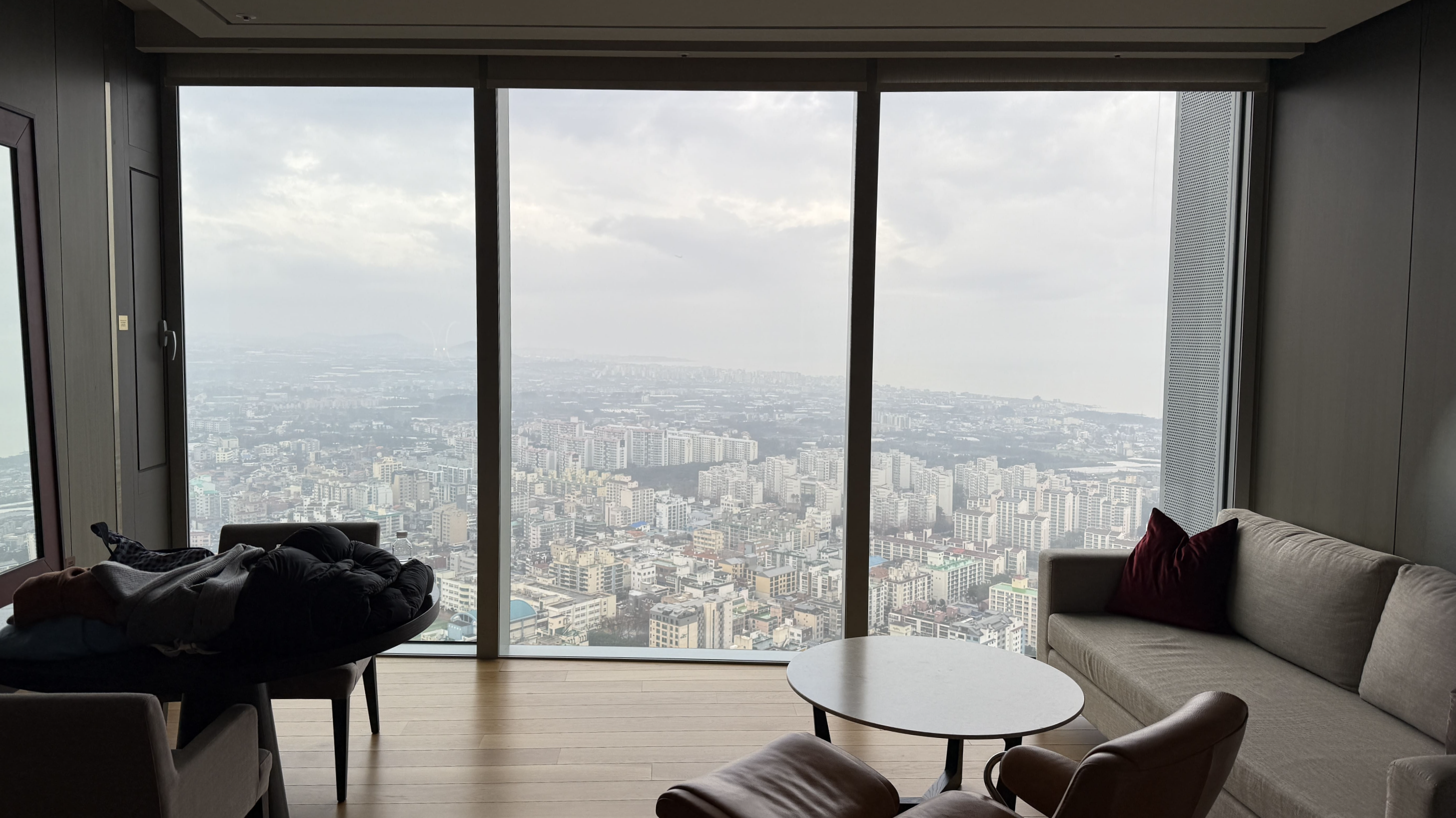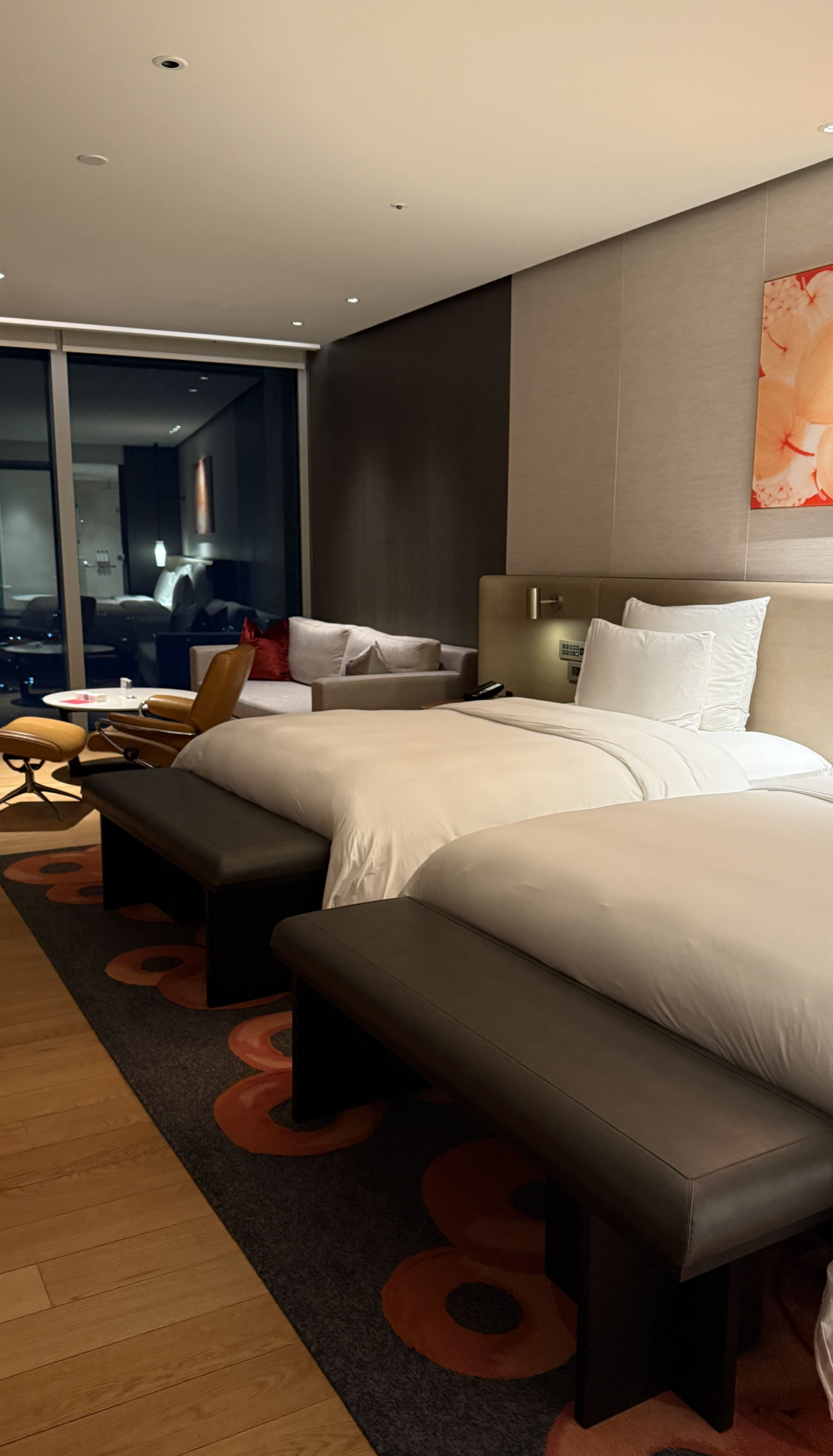 제가 묵었던 방은 Twin Room City View였고, 체크인하면서 받은 룸 키를 열자마자 “와, 진짜 넓다”라는 말이 저절로 나왔습니다. 서울 하얏트 객실도 멋지지만, 여긴 공간 자체가 더 여유롭고 층고도 높아서 그런지 훨씬 쾌적했어요. 65제곱미터의 넓이에 2.7미터 높이의 천장은 확실히 압도적이었고, 제주 시내의 야경이 파노라마처럼 펼쳐져 객실에 있는 내내 기분이 좋았습니다.