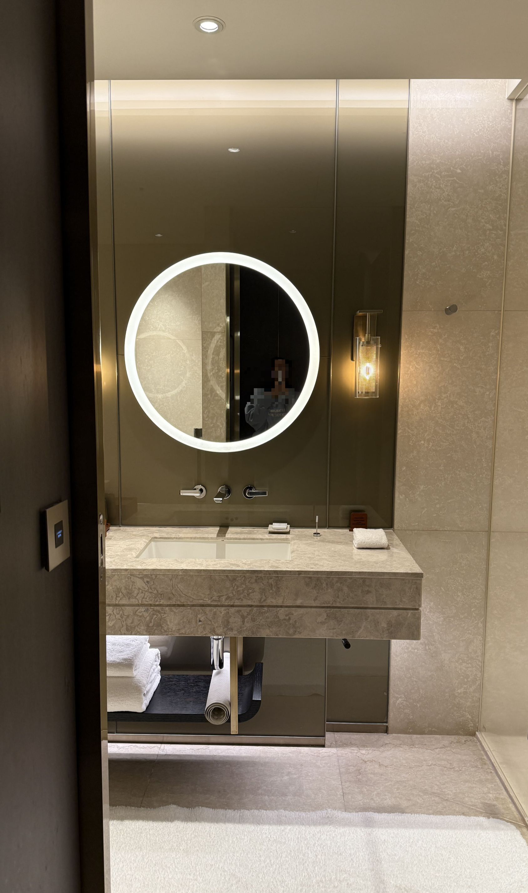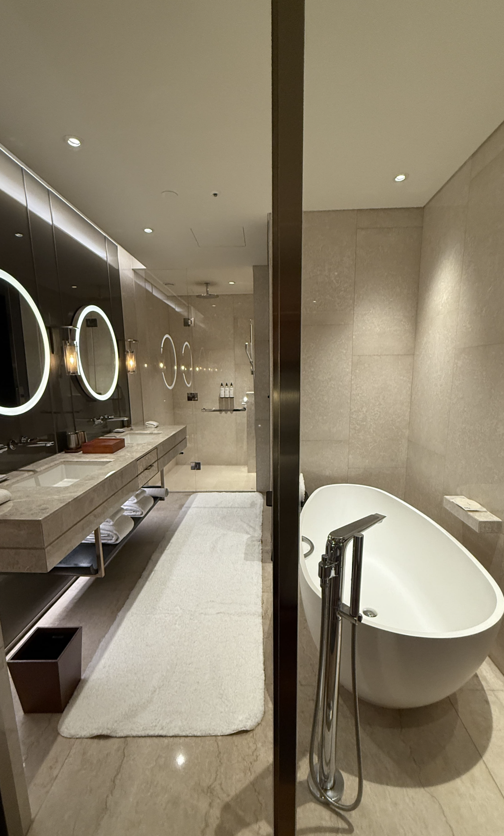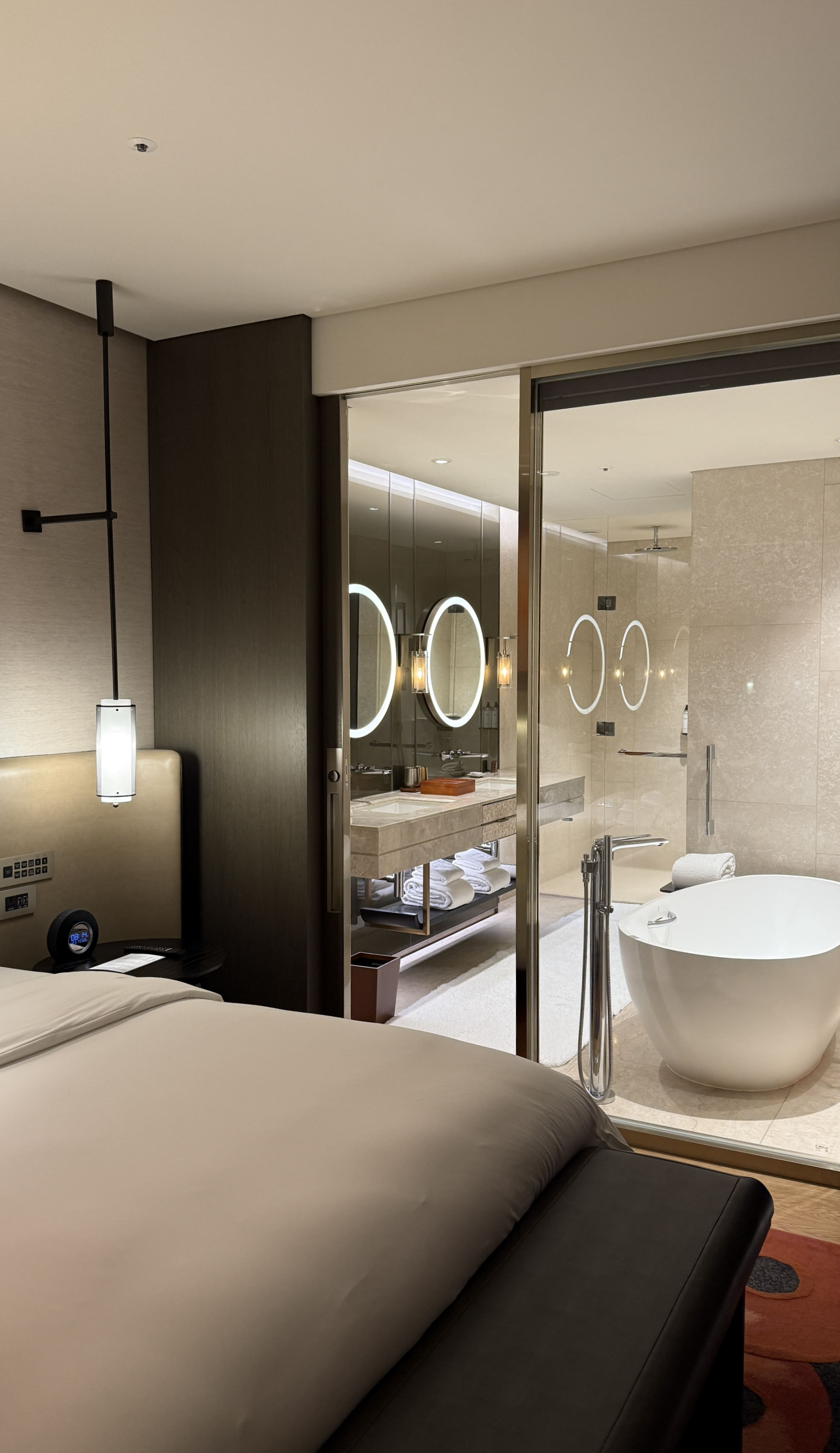 침대는 킹보다 넓은 XL 트윈 침대 2개가 놓여 있었고, 침구는 부드럽고 고급스러웠습니다. 욕실은 더블 세면대, 대리석 욕조, 레인 샤워 부스, 발망 어메니티까지 완벽 그 자체였고요. 특히 처음 방에 들어갔을 때 놓여 있던 웰컴 초콜릿은 작지만 큰 감동을 주었습니다. 네스프레소 머신과 JBL 블루투스 스피커도 이용하면서, 방 안에서 보내는 시간이 참 여유롭고 만족스러웠습니다.