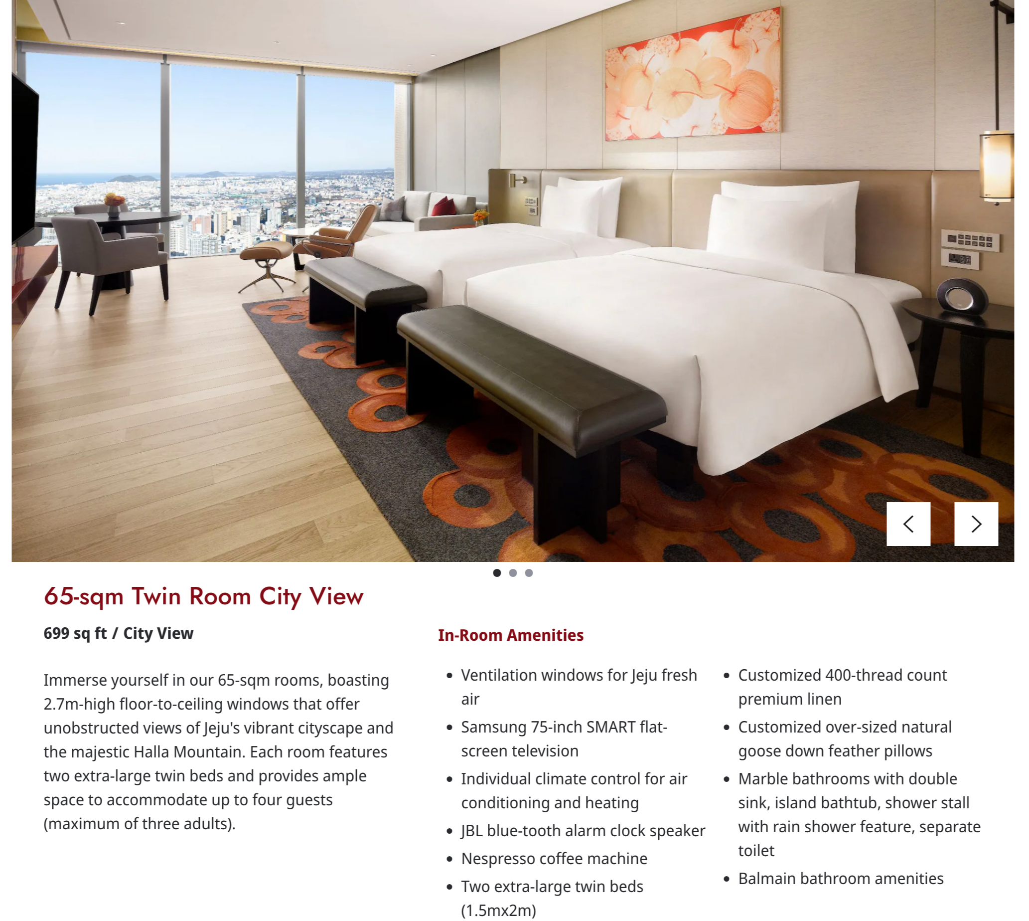 제가 묵었던 방은 Twin Room City View였고, 체크인하면서 받은 룸 키를 열자마자 “와, 진짜 넓다”라는 말이 저절로 나왔습니다. 서울 하얏트 객실도 멋지지만, 여긴 공간 자체가 더 여유롭고 층고도 높아서 그런지 훨씬 쾌적했어요. 65제곱미터의 넓이에 2.7미터 높이의 천장은 확실히 압도적이었고, 제주 시내의 야경이 파노라마처럼 펼쳐져 객실에 있는 내내 기분이 좋았습니다.