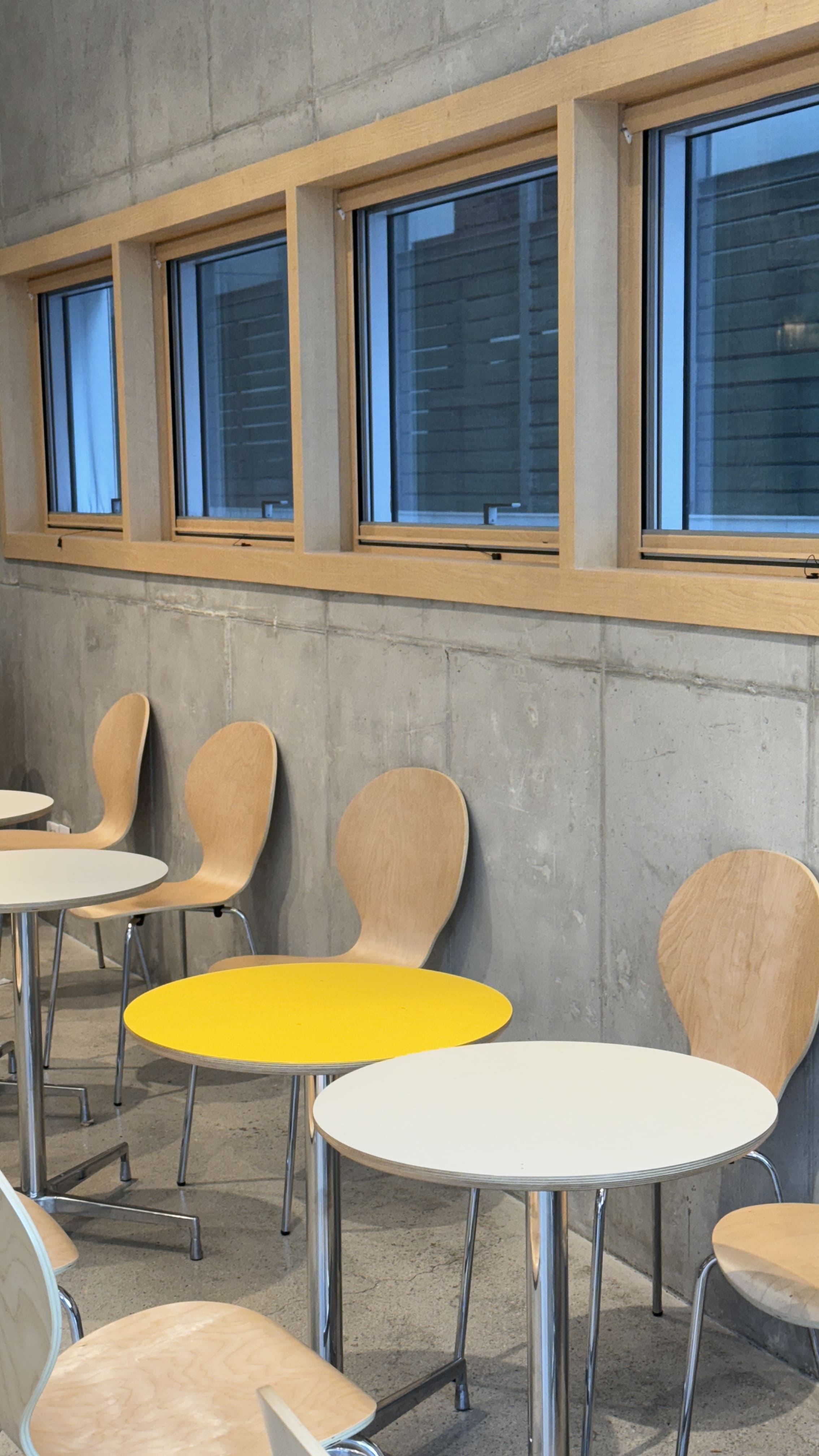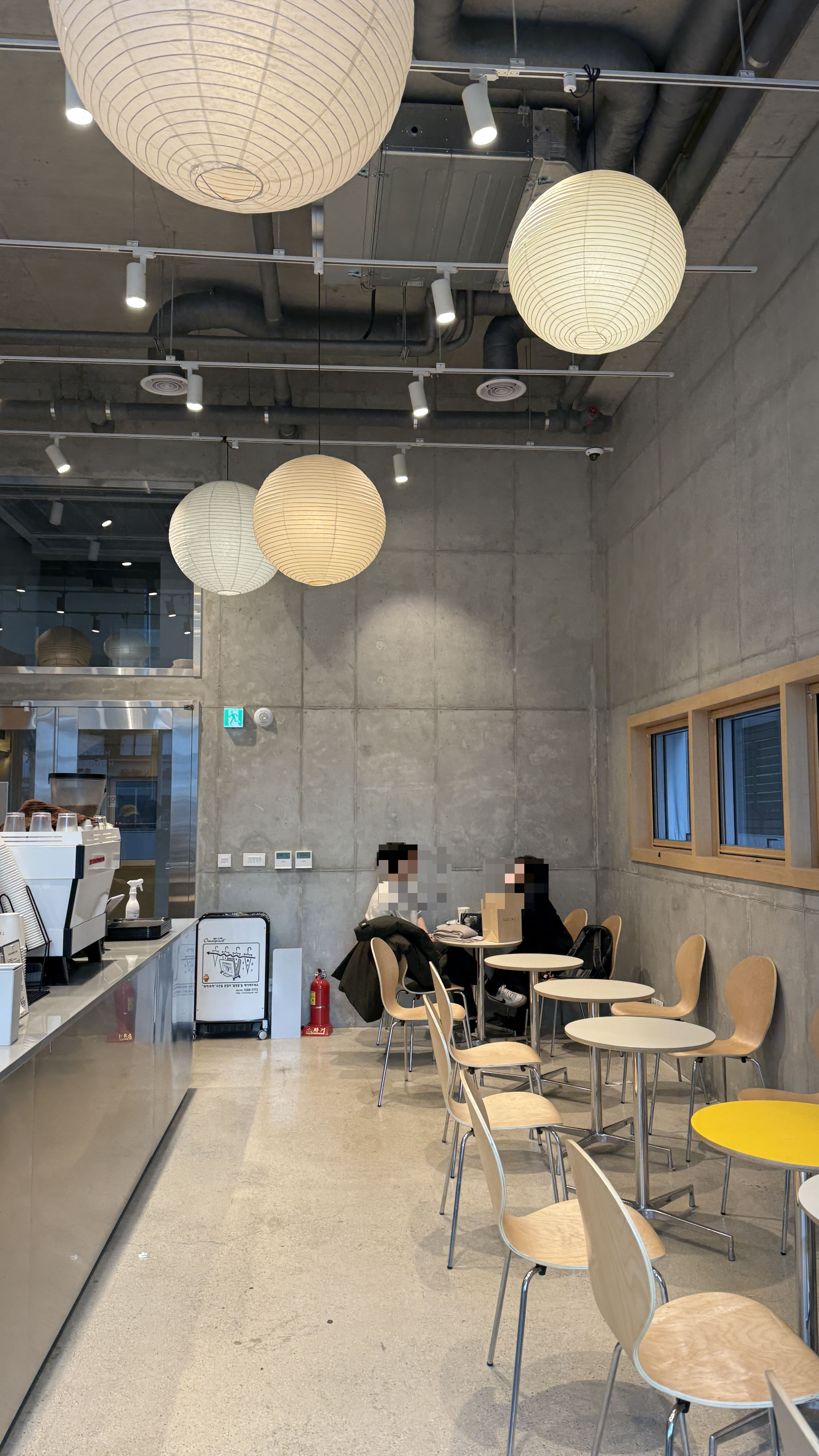 카페 내부는 콘크리트 벽에 노란색 곡선이 포인트로 들어간 모던하고 미니멀한 디자인! 조명이 부드럽고, 자리 간격도 넉넉해서 친구랑 대화 나누기 딱 좋은 조용한 분위기였어요. 평일에는 노트북 작업하러 오는 분들도 많고, 주말에는 브런치 겸 데이트 코스로 찾는 분들도 꽤 많다고 해요.