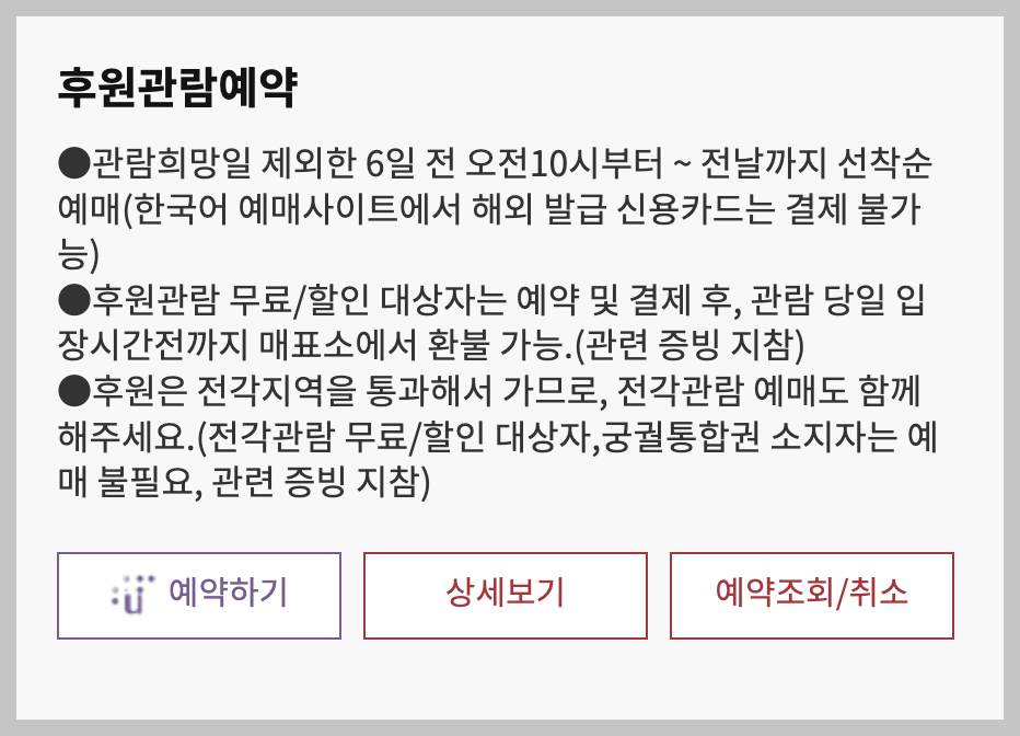 1. 관람 예약 기간: 관람일 6일 전 오전 10시부터 전날까지 선착순 예매