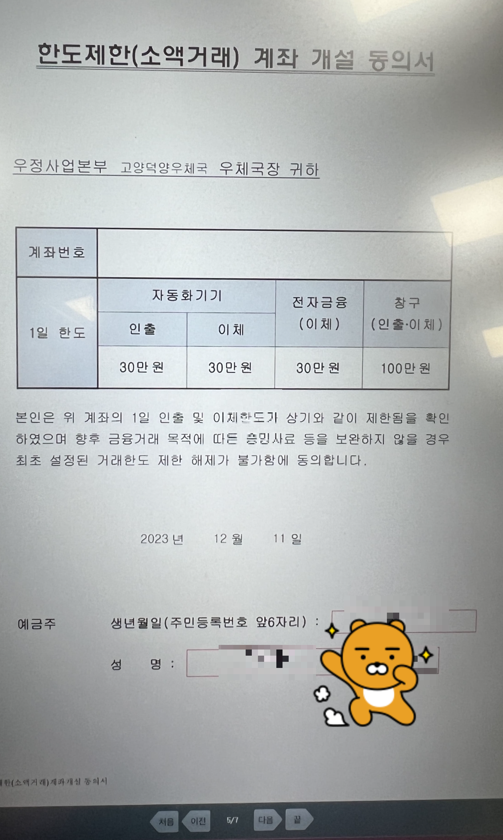 우체국에 도착해서 가장 먼저 한 일은 바로 통장과 체크카드를 만드는 것이었어요. 은행과 마찬가지로 '금융' 관련 업무 창구로 가서 번호표를 뽑고 순서를 기다렸습니다. 창구에 앉아 통장 개설을 요청하니, 직원분께서 친절하게 설명을 시작하셨어요. 첫 거래라 '한도제한(소액거래) 계좌'로 개설된다고 하셨는데, 이는 보이스피싱 등 금융사고 예방을 위한 조치라고 해요.