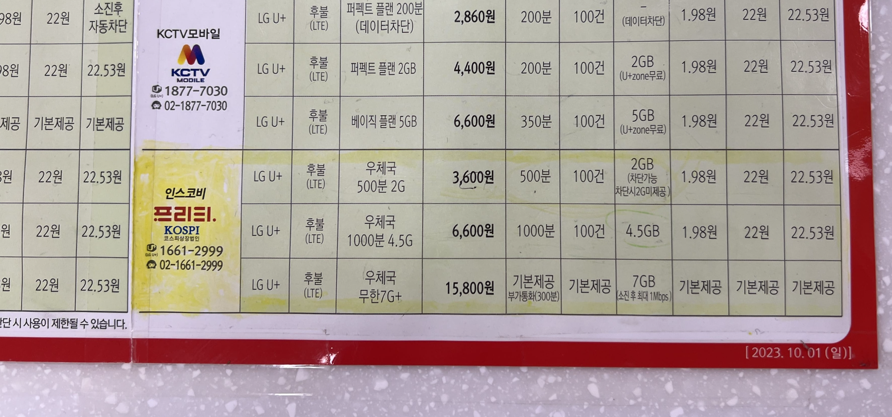 통장 개설을 마친 후, 바로 옆에 있는 '알뜰폰' 창구로 이동했어요. 우체국 알뜰폰은 다양한 알뜰폰 통신사의 요금제를 한눈에 비교할 수 있어 정말 편리했어요. 직원분께 제 데이터 사용량(많지 않음)과 통화 패턴을 말씀드리니, 제게 딱 맞는 요금제를 추천해 주셨어요. 기존 통신사 요금제와 비교해 보니 통신비를 절반 이상 절약할 수 있겠더라고요! 저는 프리티 제일 낮은 요금제를 선택했습니다.