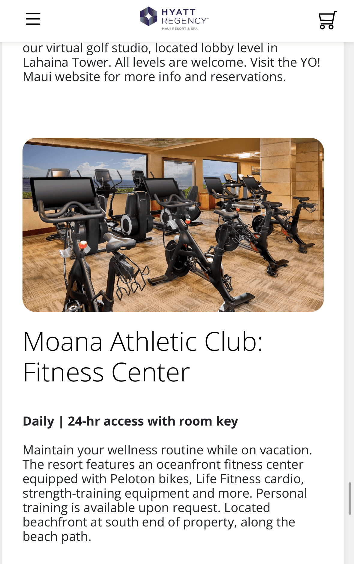마우이 여행 중에도 운동 루틴을 놓치고 싶지 않다면, 하얏트 리젠시 마우이 리조트 앤드 스파(Hyatt Regency Maui Resort and Spa)는 완벽한 선택이었습니다. 매일 아침 진행되는 요가 클래스와 24시간 이용 가능한 피트니스 센터 덕분에, 여행 중에도 활기차게 하루를 시작하고 마무리할 수 있었거든요. 저는 시차와 힘든 일정에 운동은 패스했습니다. 호텔에서는 매일 아침 요가 클래스를 운영합니다. (미리 예약은 필요 없습니다!)