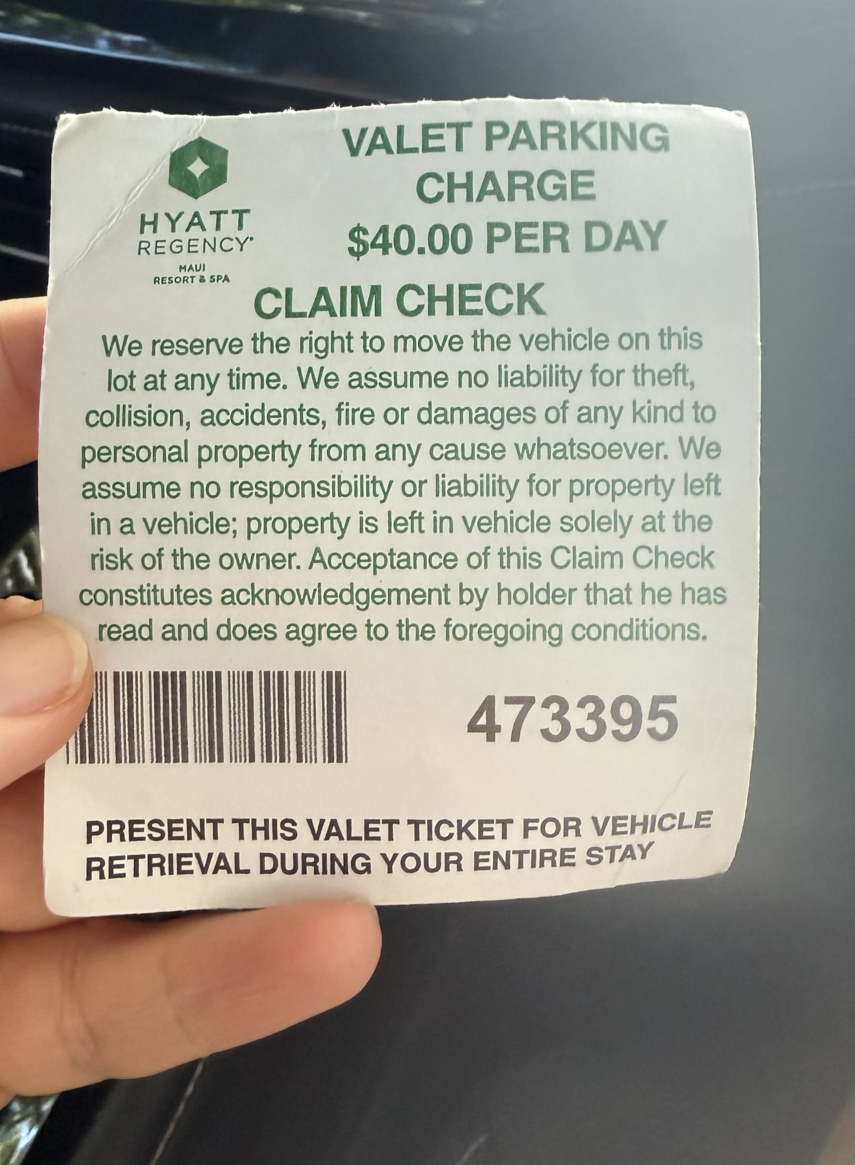 마우이 리조트는 주차비가 비싼 편인데, 하얏트 리젠시 마우이는 발렛 비용이 하루 $40입니다. 셀프 주차도 유료라 여행객 입장에서는 부담스러운 부분이죠. 하지만 게스트 오브 아너 혜택 덕분에 이 발렛 서비스를 무료로 이용할 수 있었습니다. 렌터카를 이용하던 저희에게는 정말 큰 장점이었는데요, 매일 주차 자리를 찾는 수고 없이 바로 차량을 맡기고, 언제든 편하게 찾을 수 있어 여행이 훨씬 여유로웠습니다. 저녁시간 (특히 주말) 대는 사람들이 많아 조금 기다려야 했습니다.