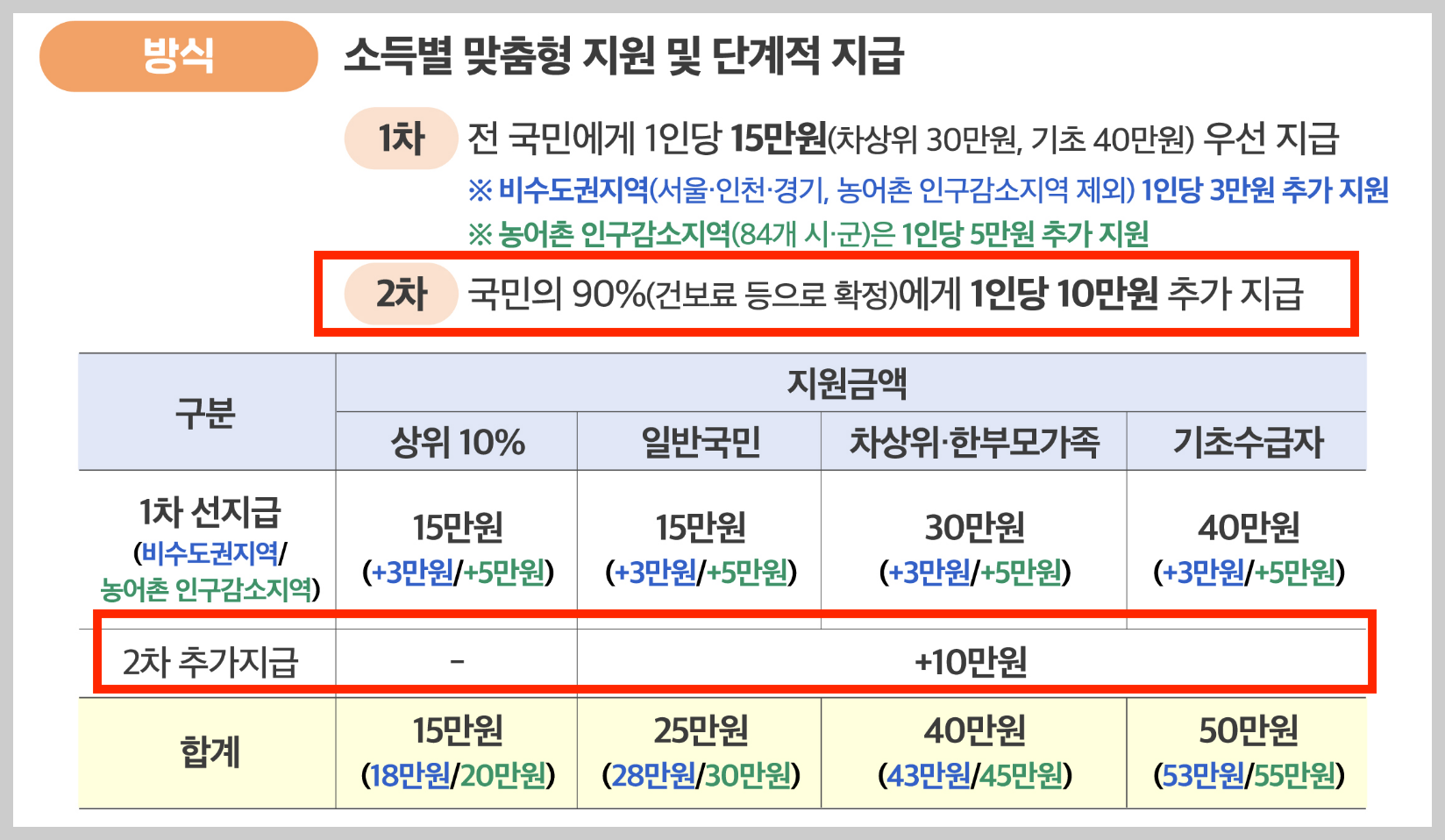 - 기초생활수급자: 1차 40만 원 + 2차 10만 원 → 총 50만 원