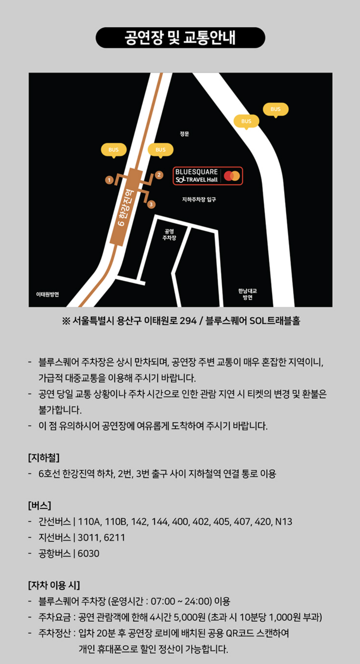 블루스퀘어 SOL 트래블홀은 한남동에 위치해 있으며, 공연 당일 주변 도로가 혼잡할 수 있습니다.