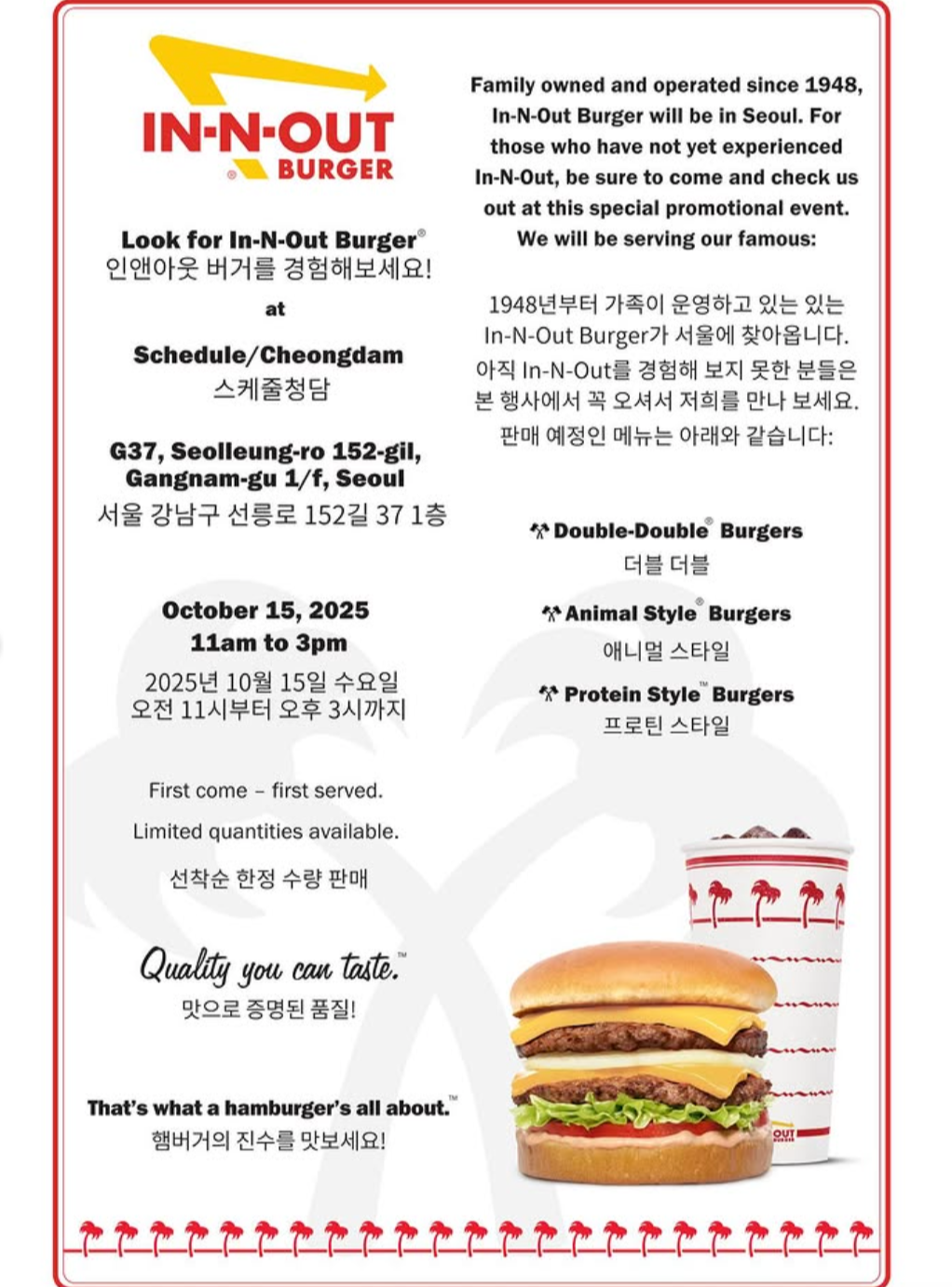 미국 대표 수제버거 브랜드 인앤아웃 버거(In-N-Out Burger)가 드디어 서울에서 팝업이 있다고 하네요! 이번 행사는 2025년 10월 15일(수) 단 하루, 청담동 스케줄 청담(Schedule Cheongdam)에서 진행되며, 미국 현지의 맛을 그대로 느낄 수 있는 특별한 팝업 이벤트입니다. 자세한 정보 확인해 보세요!