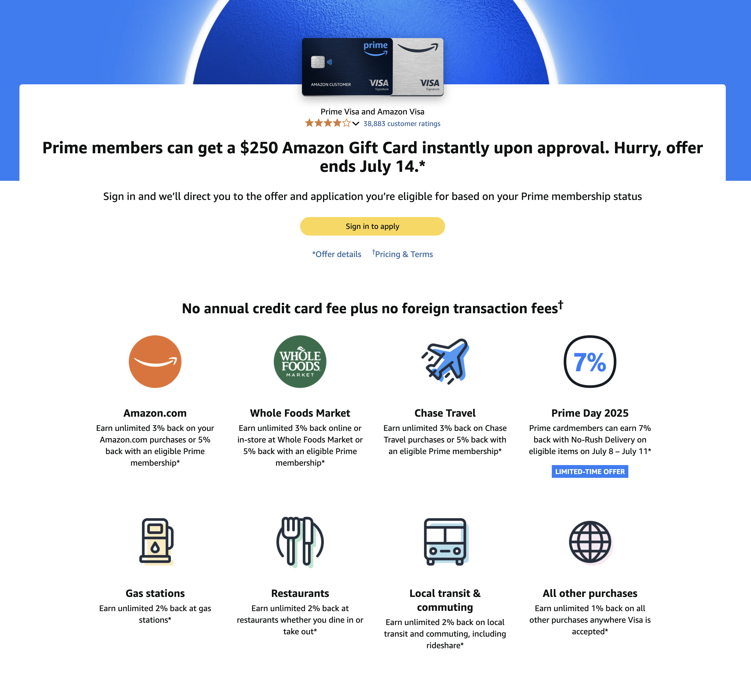 이번 프라임데이에서 가장 큰 혜택 중 하나는 바로 Amazon Prime Visa 카드 가입 프로모션입니다.
