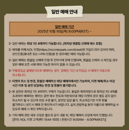 * 이번 공연은 NOL 티켓 단독 판매로 진행되며, 예매 대행이나 양도, 비공식 경로 구매는 모두 금지되어 있습니다.