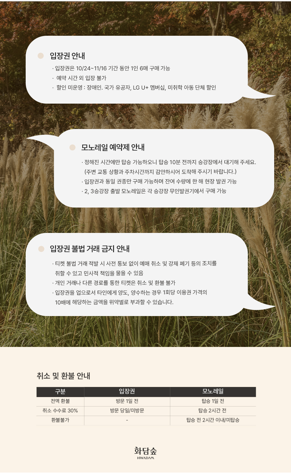 - 예약 가능 상품: 화담숲/화담채 입장권, 모노레일(1승강장 출발)